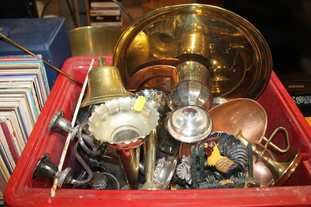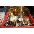 A TRAY OF METALWARE TO INCLUDE BRASS, COPPER ETC.