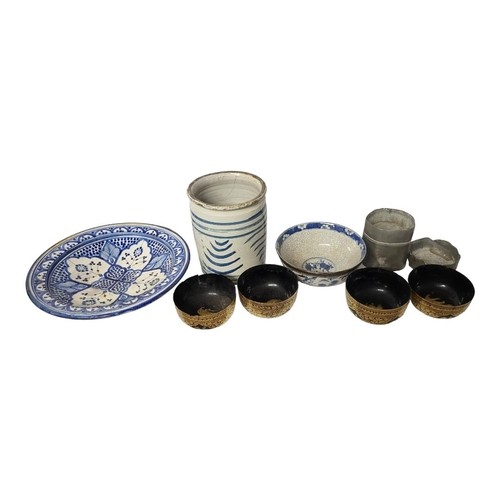 Having fine figural decoration, together with a pair of carved wooden fish okimono, a carved coquilla nut commander, a 19th Century Persian blue and white charger, a chinese crackle glaze bowl with four character mark, storage jar, lead caddy and four gilt lacquer bowls.