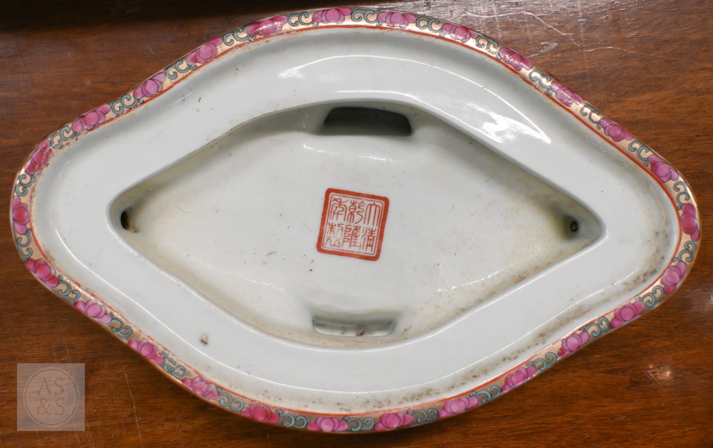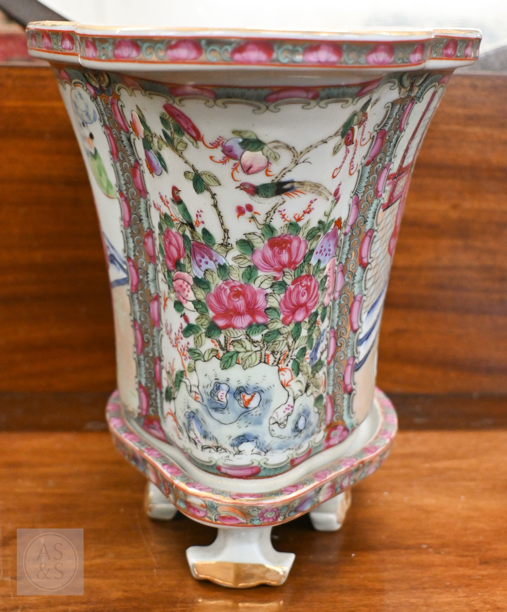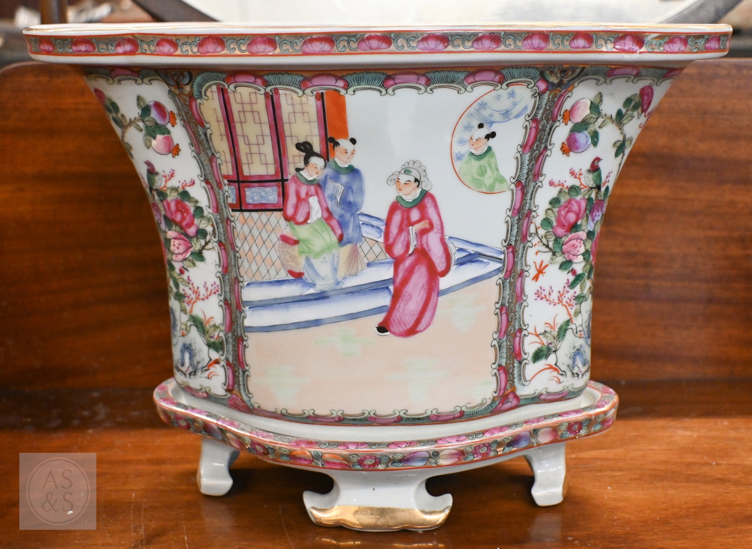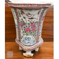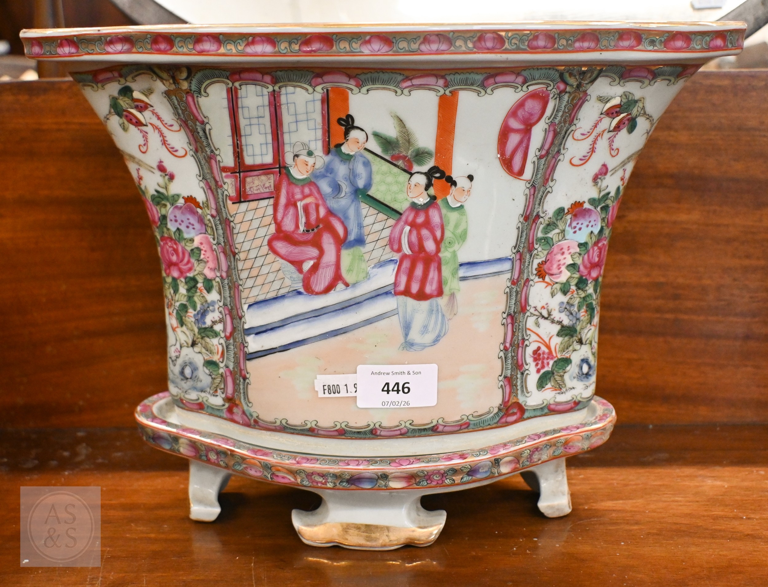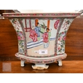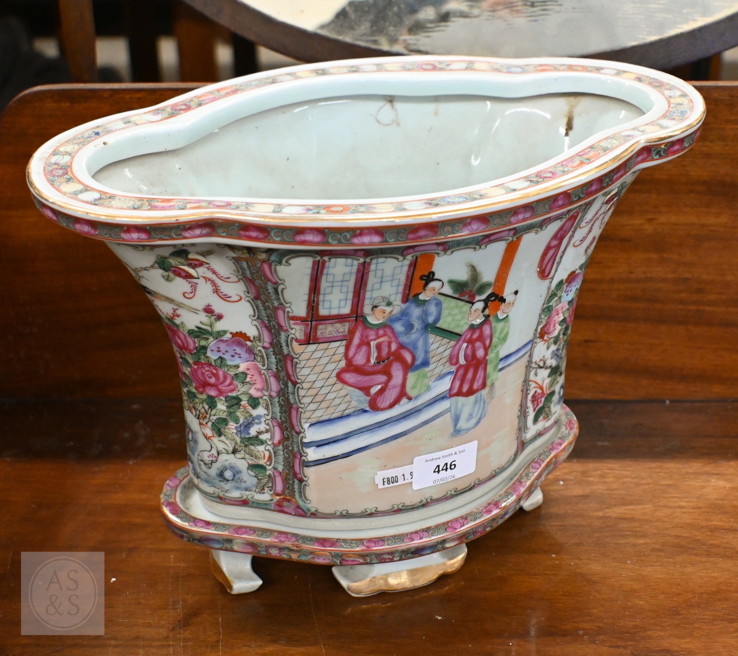 A modern Chinese porcelain quatrefoil jardiniere on stand, decorated in the famille rose manner, 26 cm high