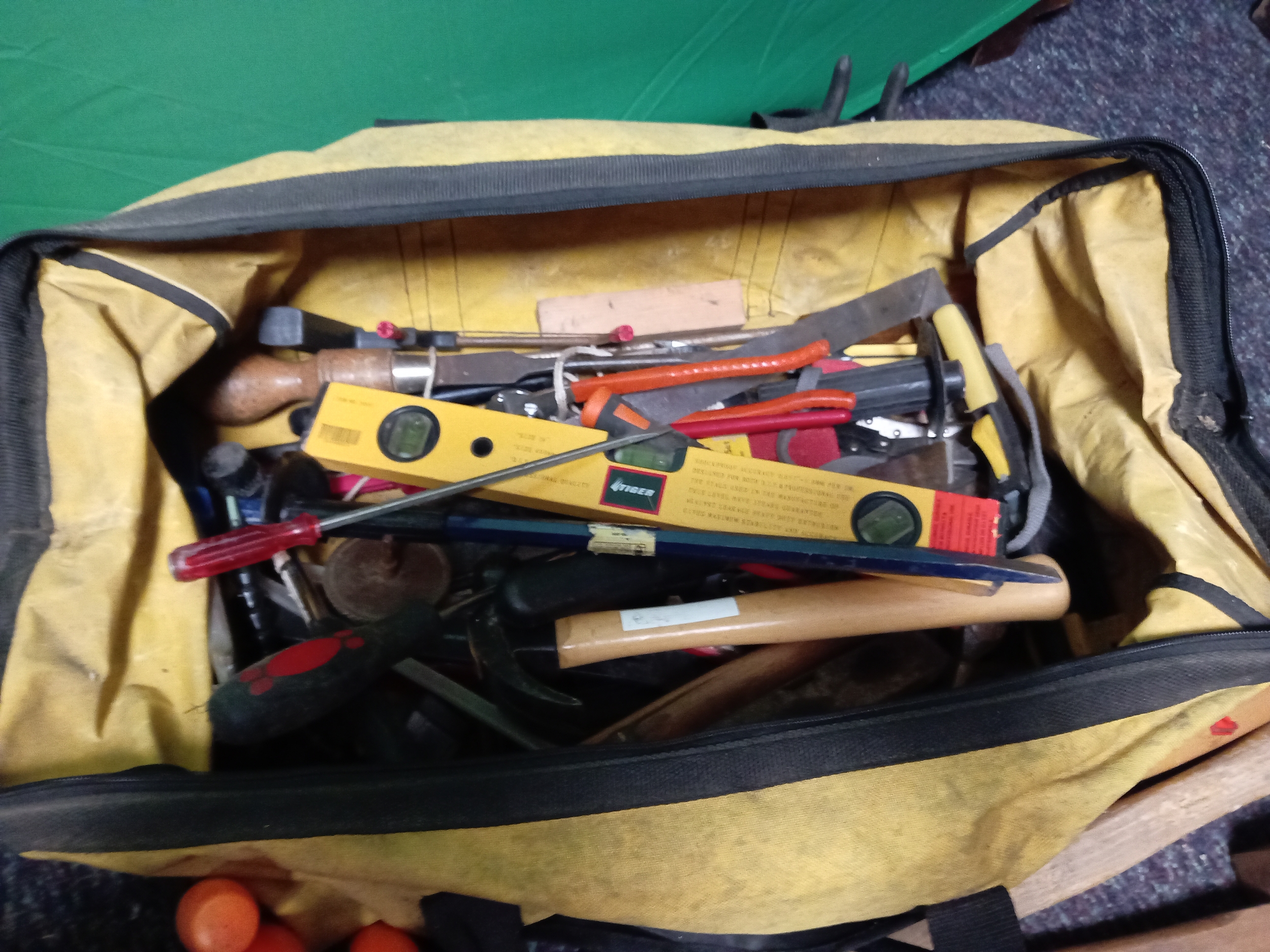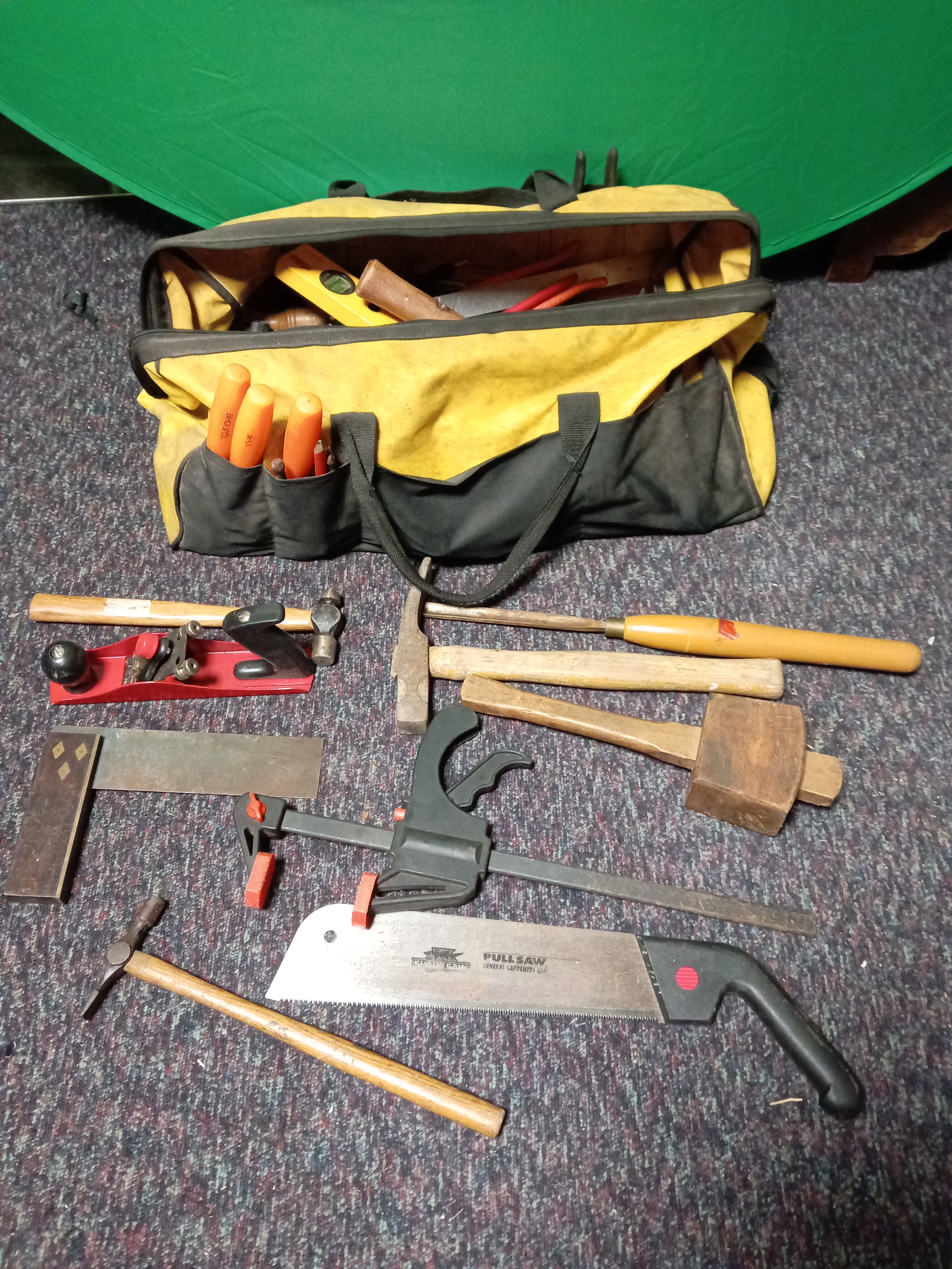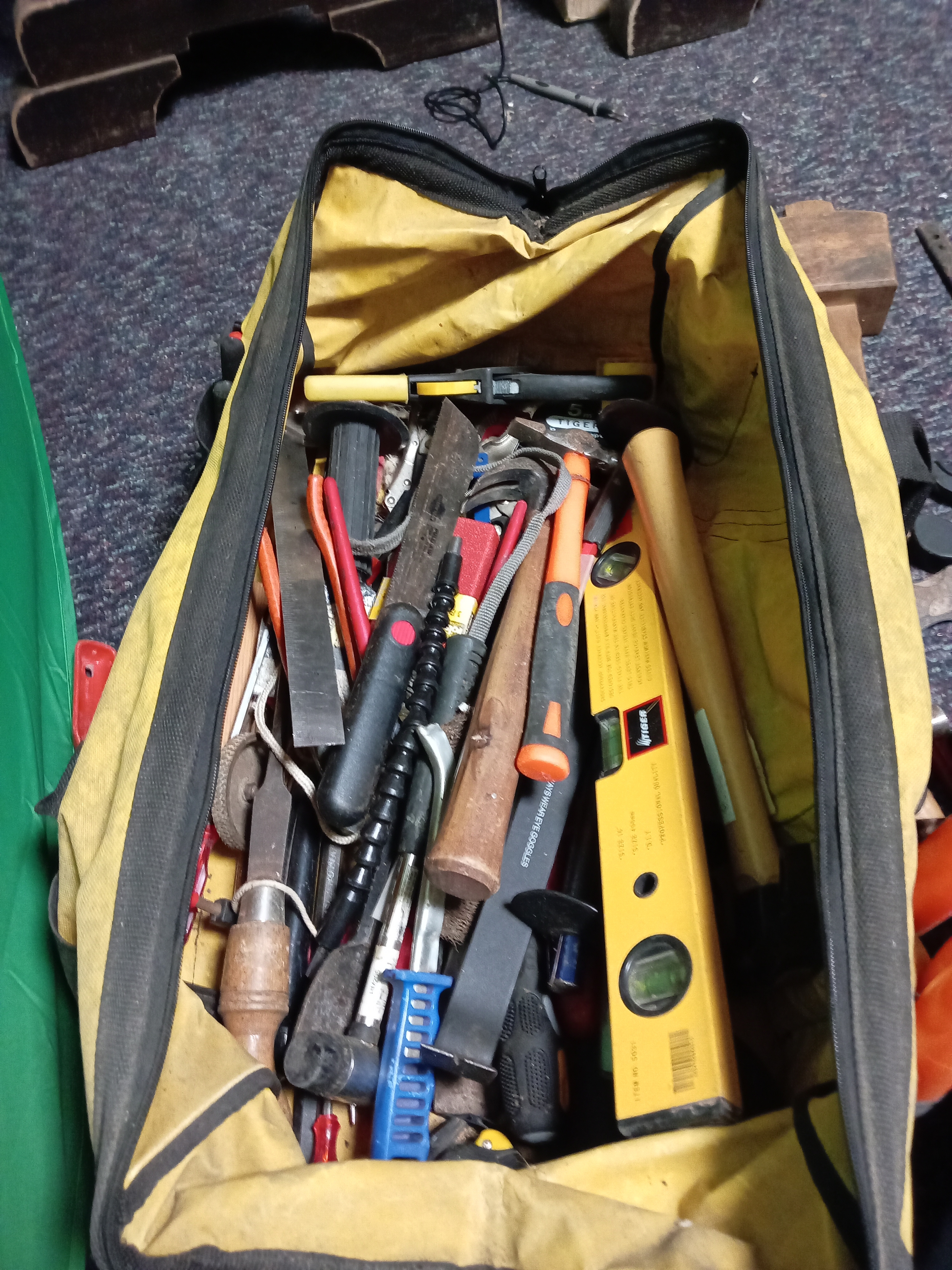 A tool bag full of various tools. To include hammers, plane, screw drivers, chisels, Spirit level, etc...