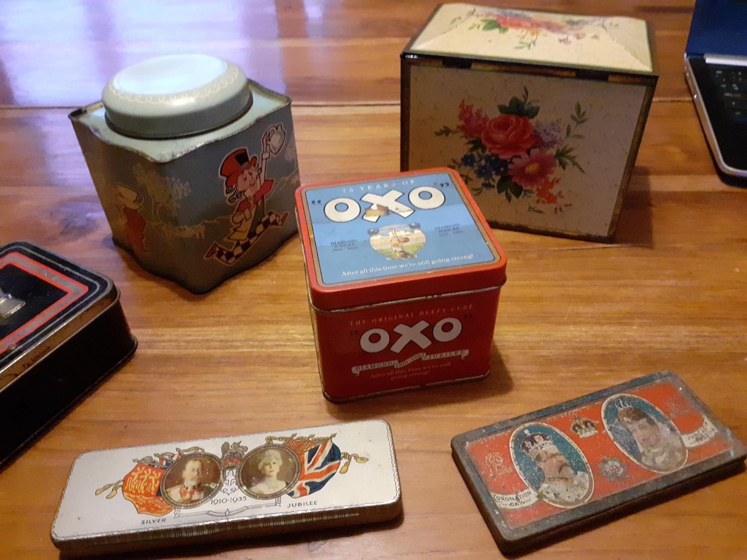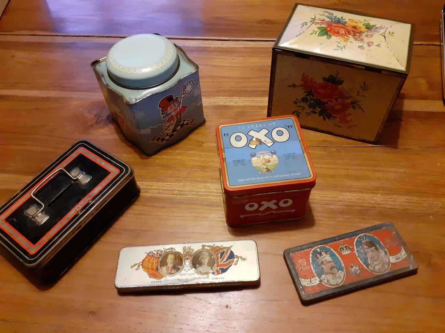 Small Collection of Metal Collectable Tins - 1902 Coronation, 1935 Jubilee , OXO , Money Tin and two Tea Caddie Tins