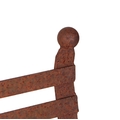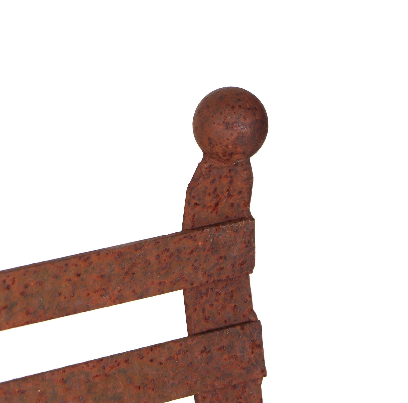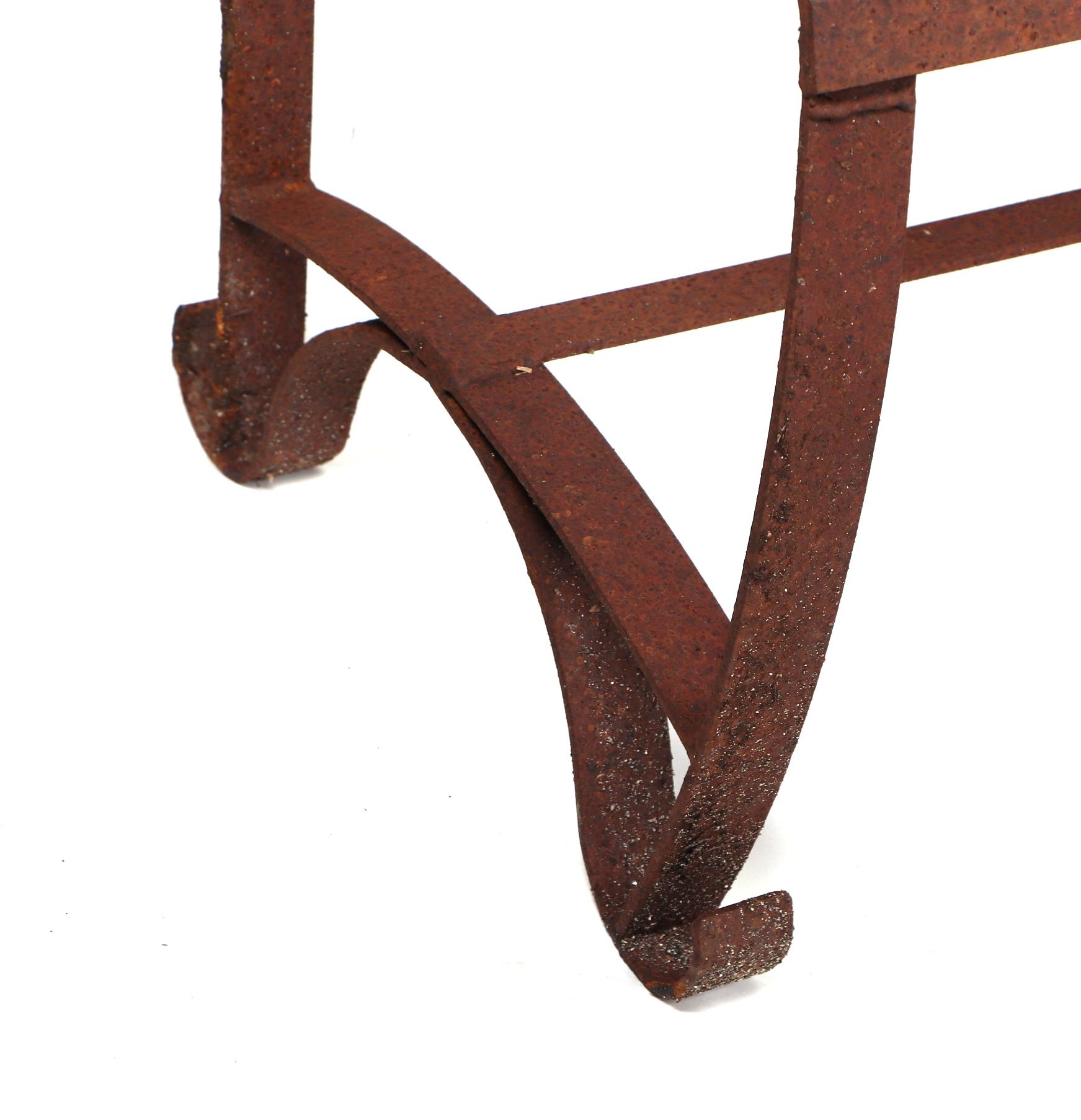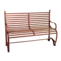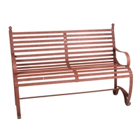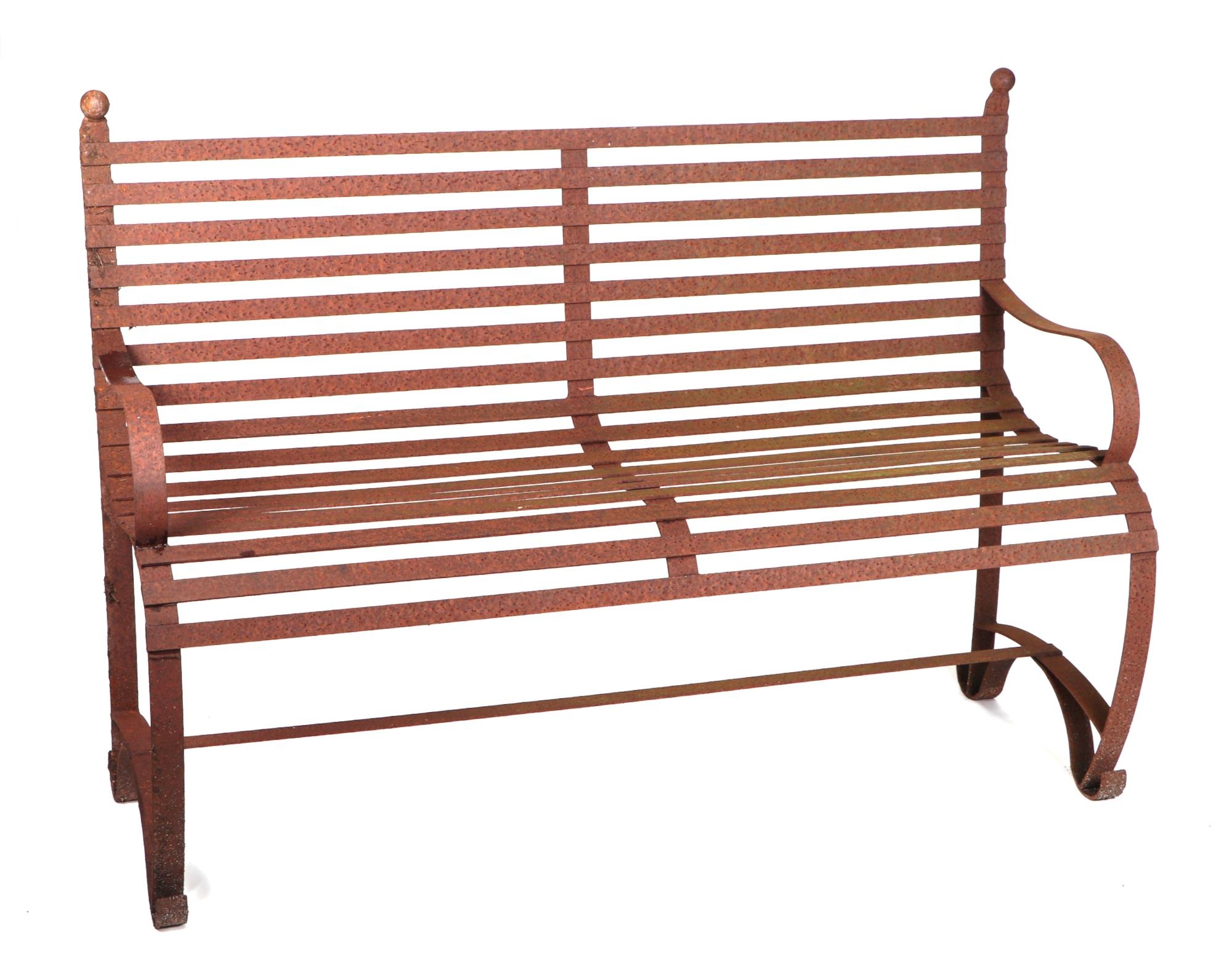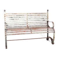 A iron strap work garden bench, with scroll arms and feet, and ball finials, 140cm high.