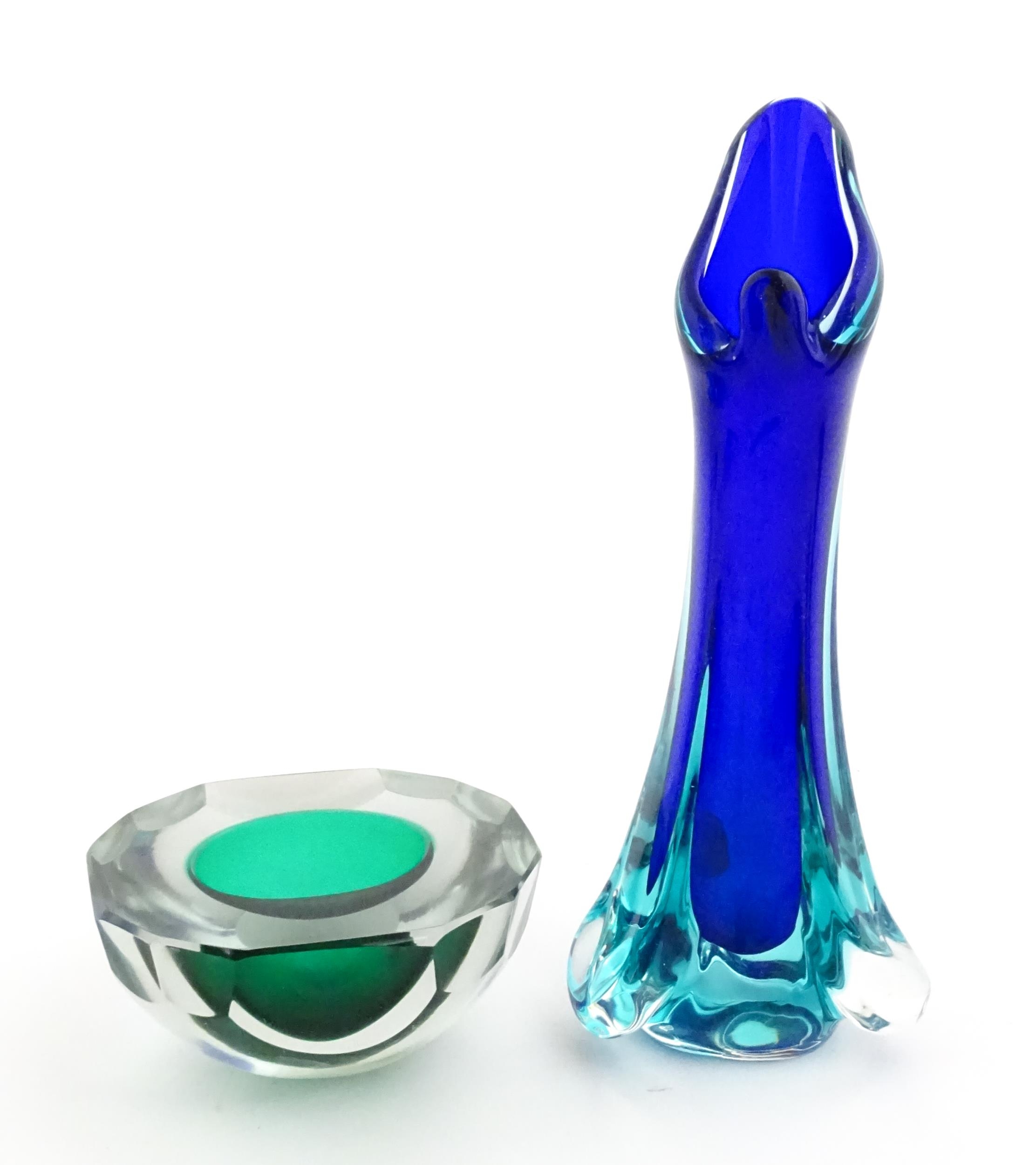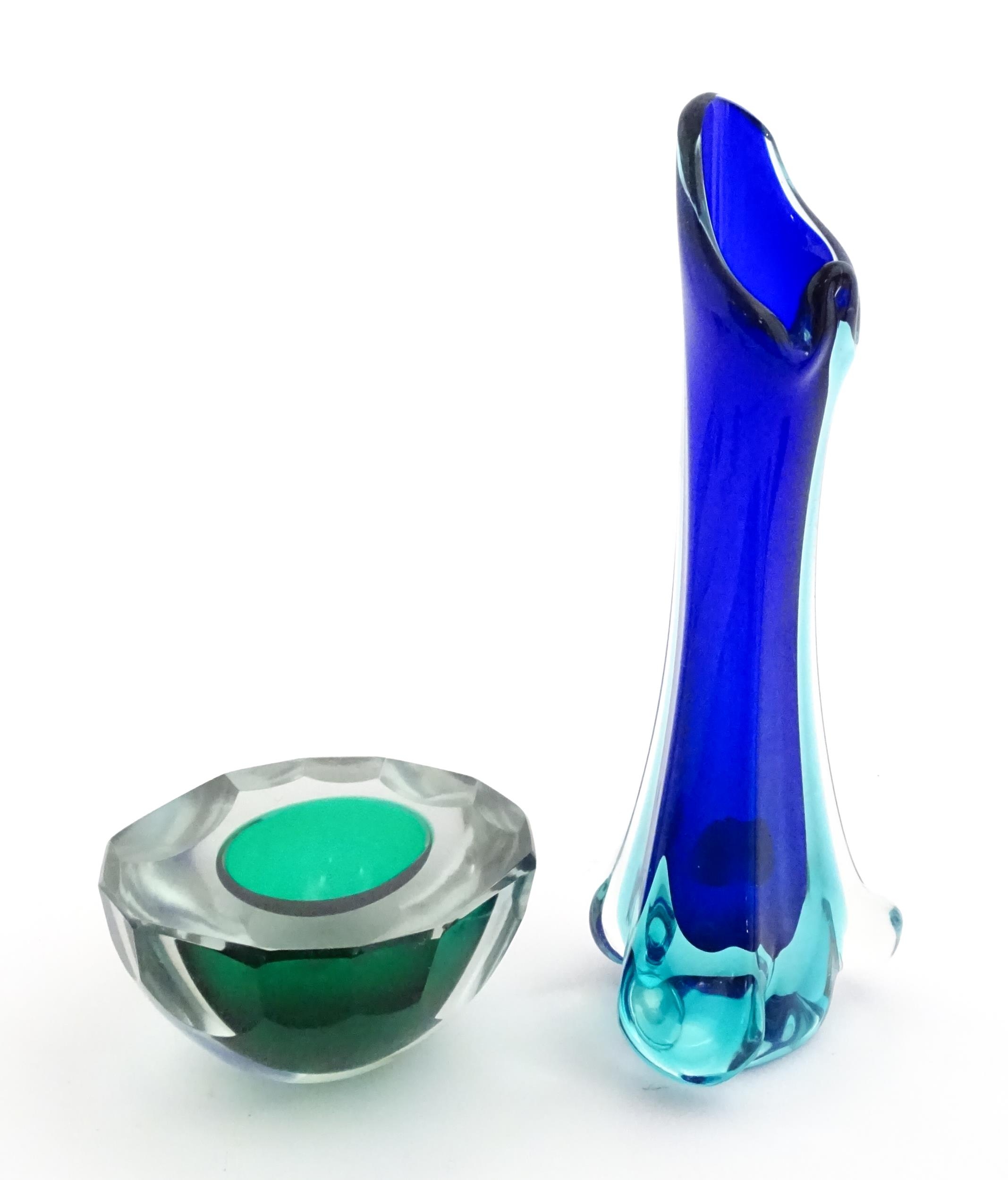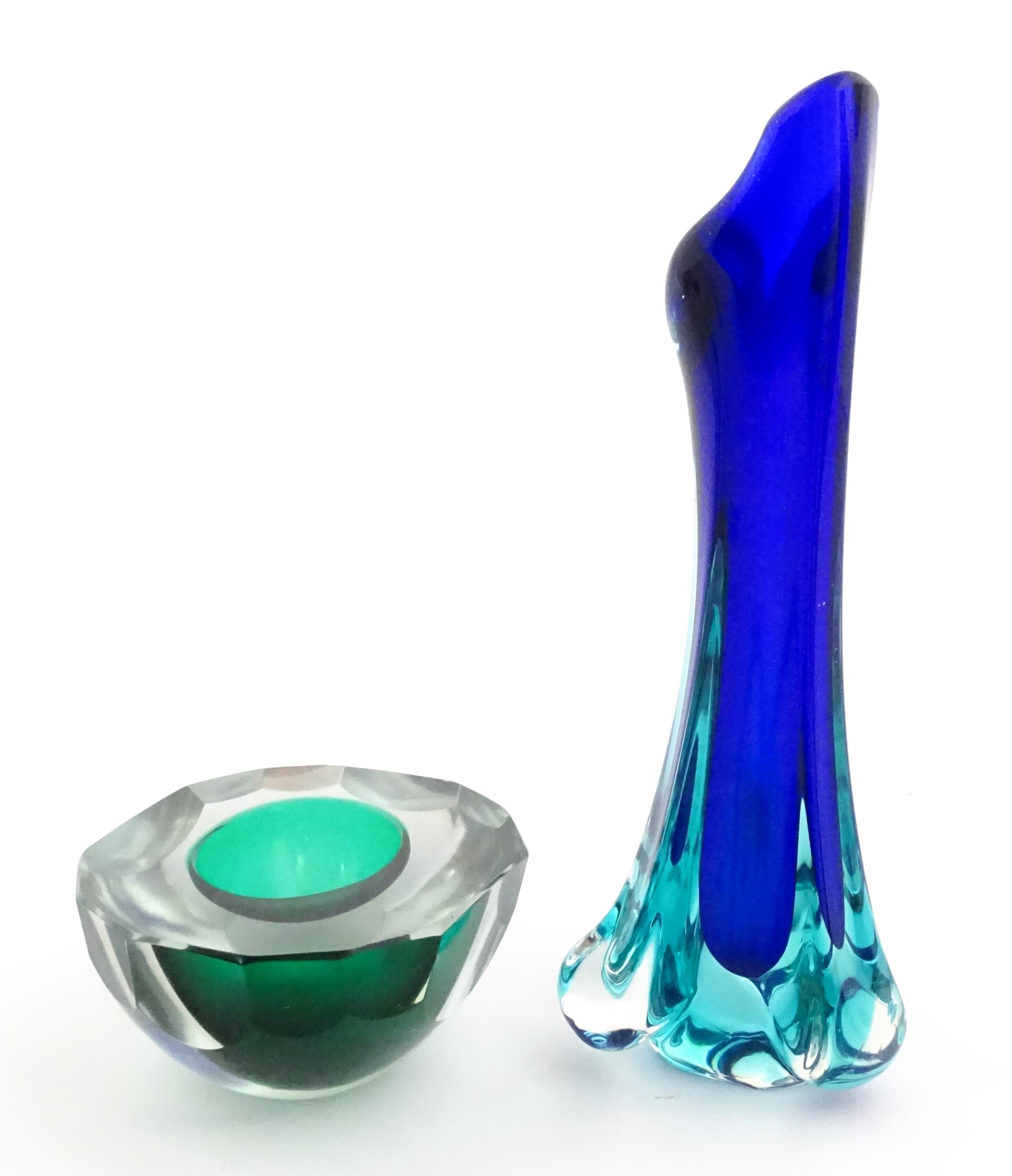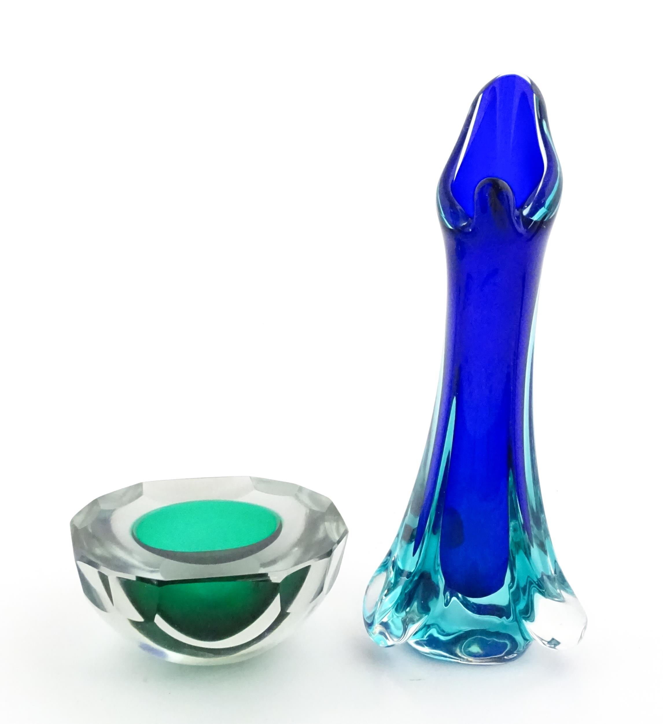A Murano sommerso glass ash tray of green and clear glass, together with a Murano glass vase. The vase approx 10 3/4" high