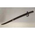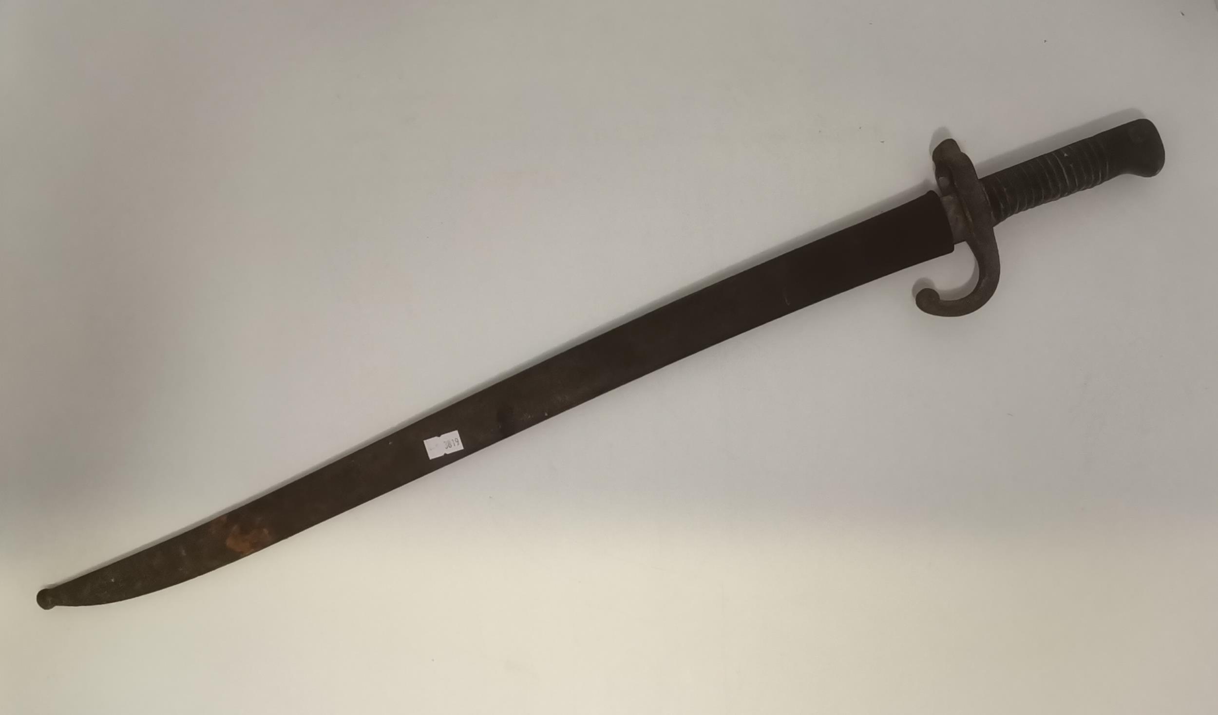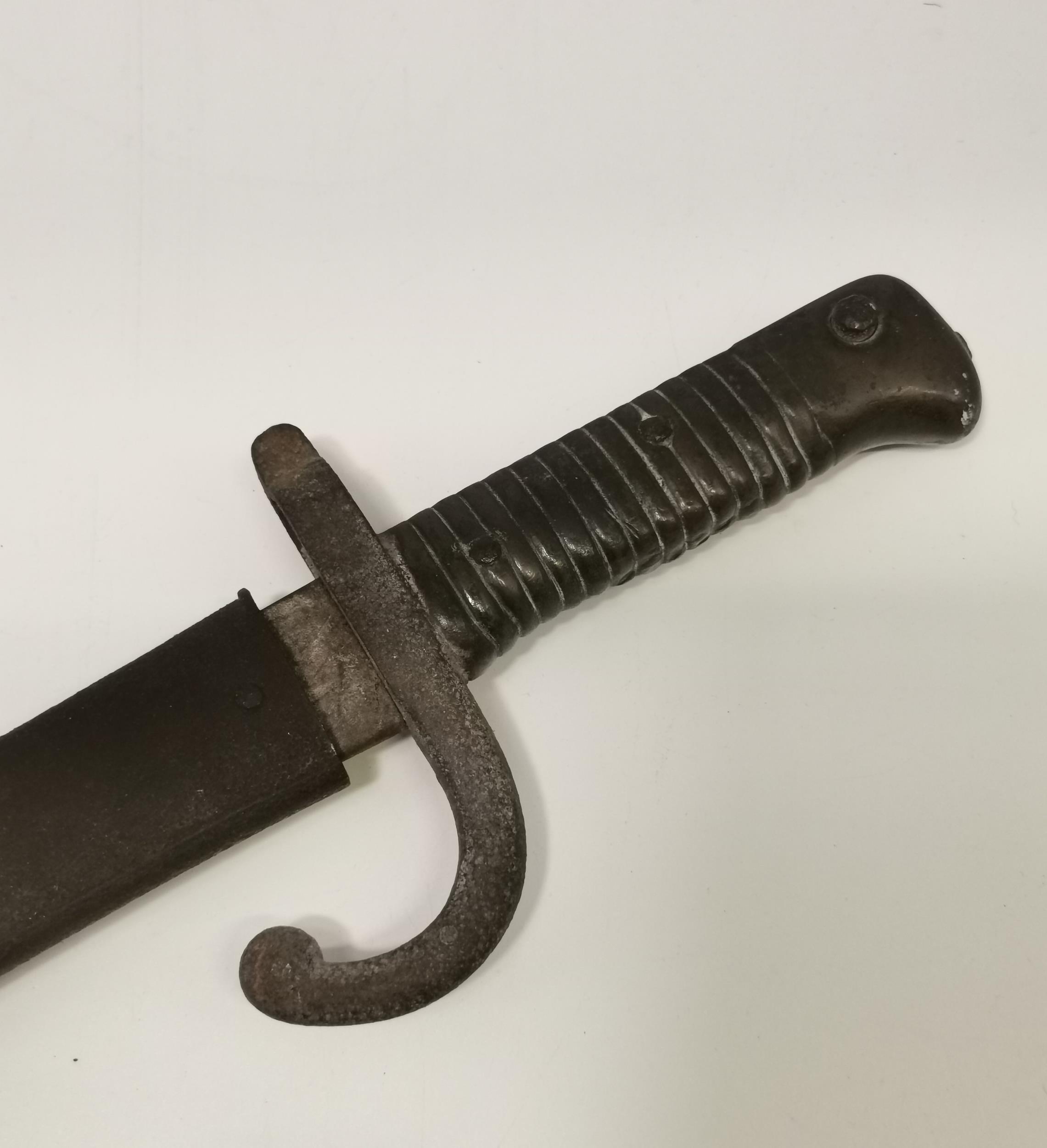 A French M1866 chassepot bayonet, 22½" blade, back edge marked Tulle arsenal and dated February 1872, with brass ribbed grip and steel scabbard.