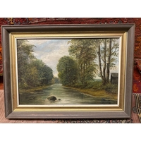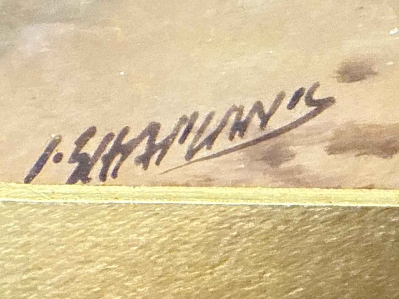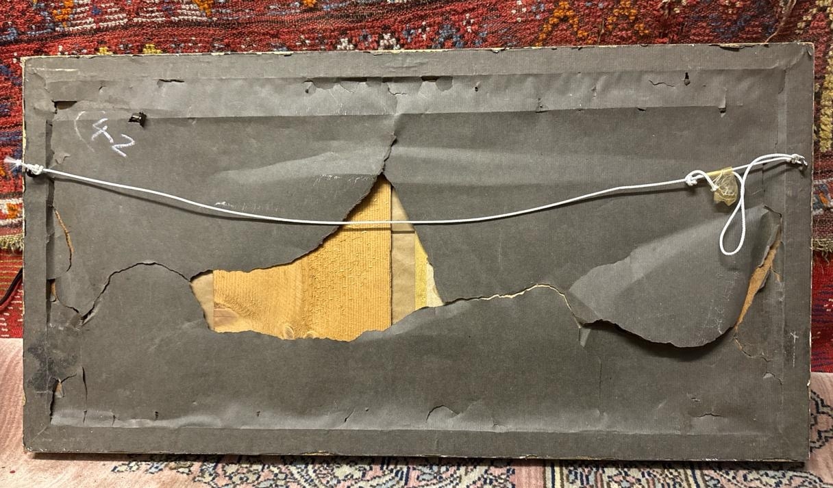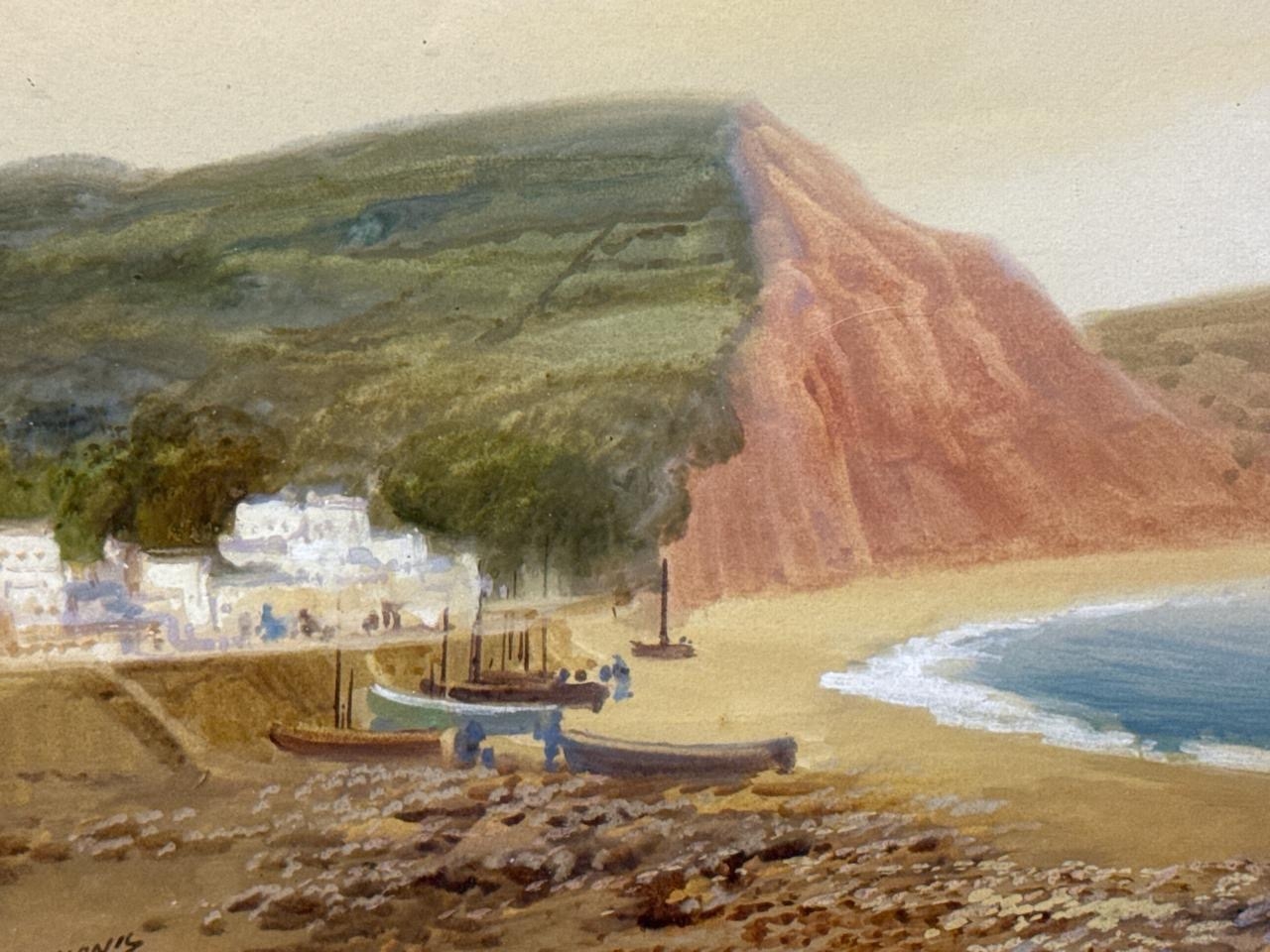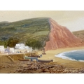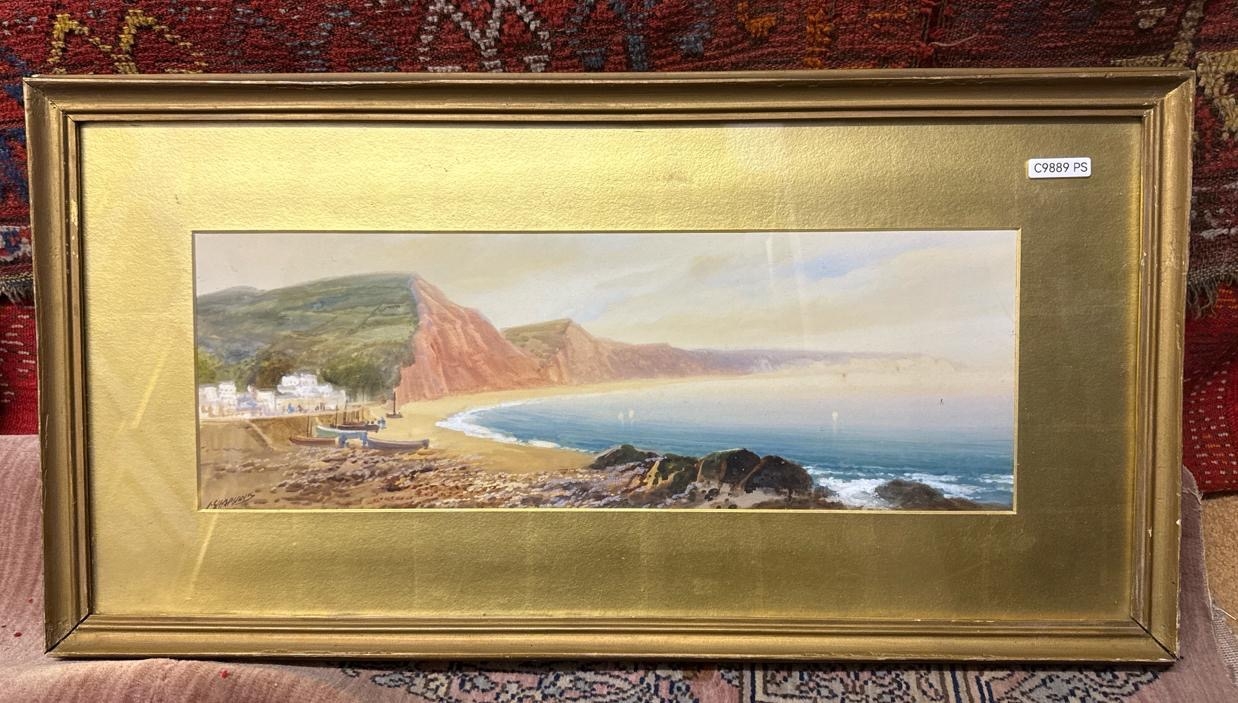 Framed original painting of a coastal scene, possibly Golden Cap in Dorset, Indistinctly signed, frame approx 39cm x 75cm