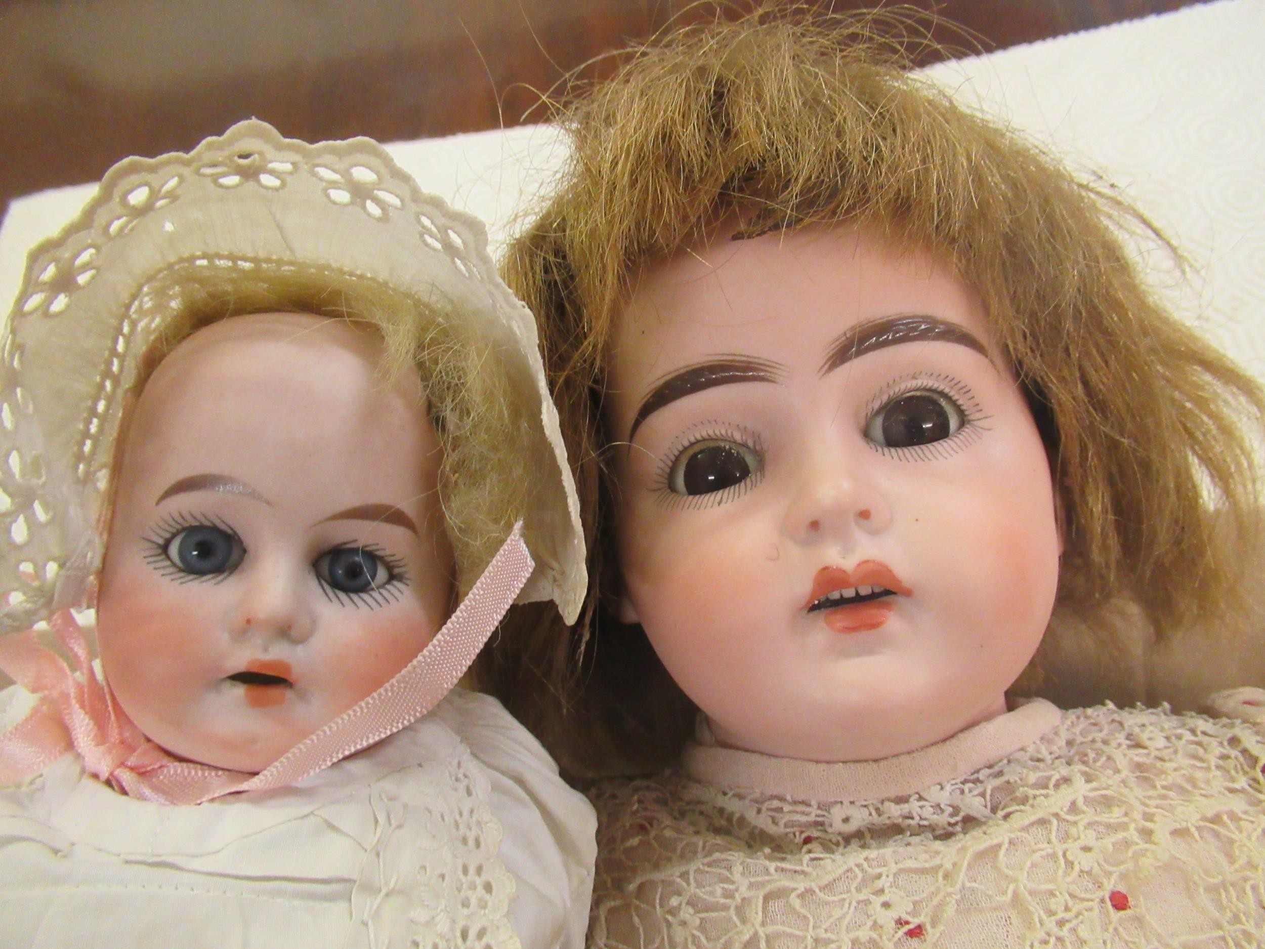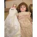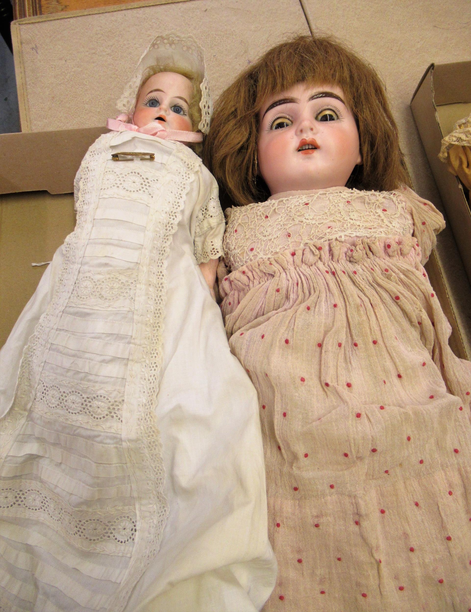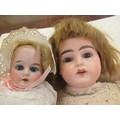 Early 20th Century German bisque headed doll with sleeping eyes, open mouth and four teeth on a jointed composition body, 54cms high approximately together with another smaller German bisque headed doll