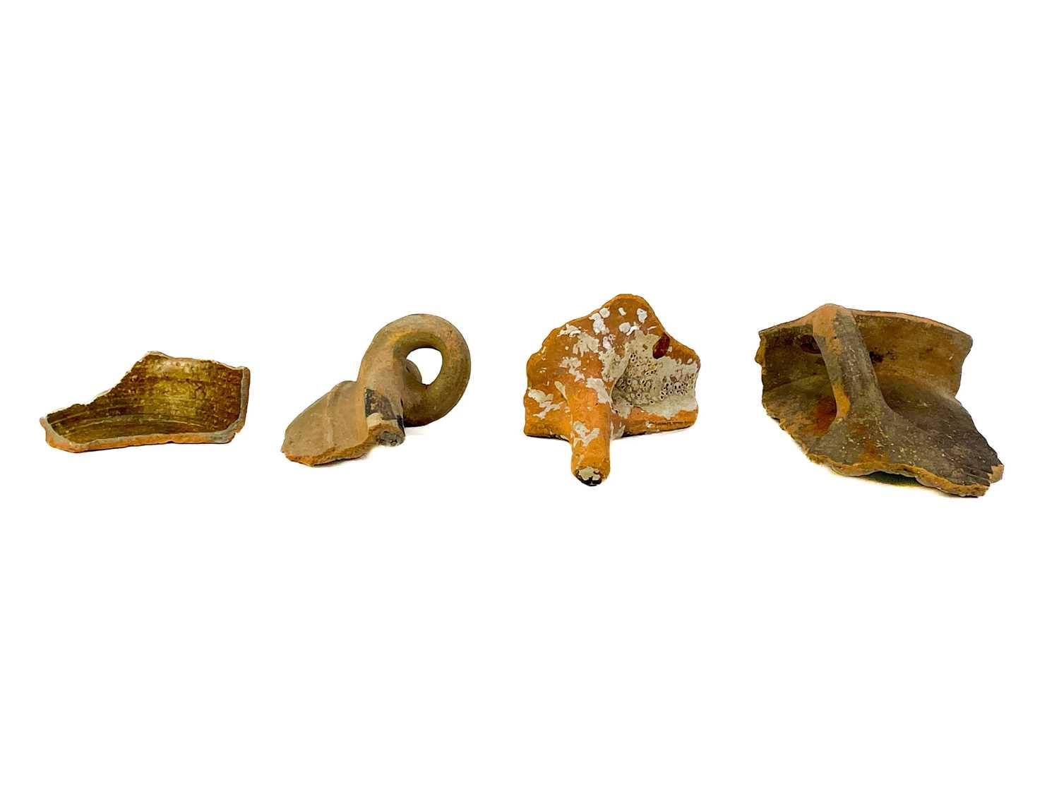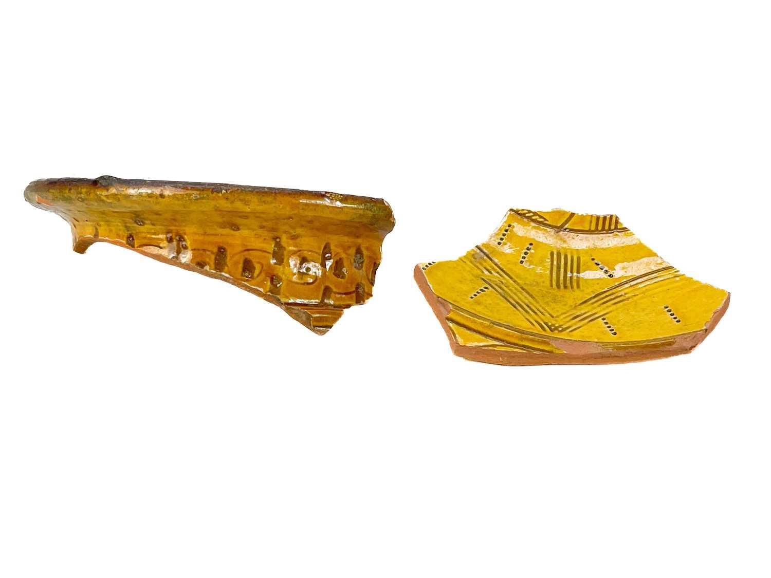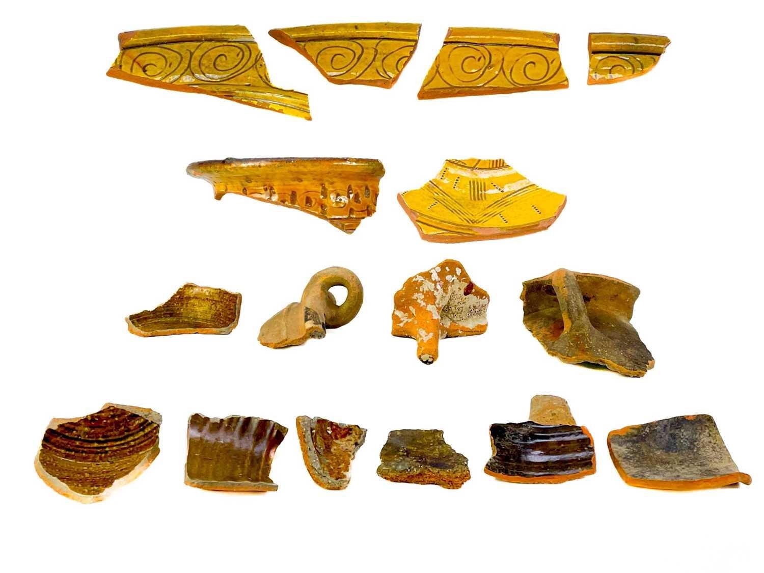 A collection of post Medieval and later pottery shards. Some with incised decoration, one piece appears to be a wreck recovery (box).