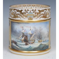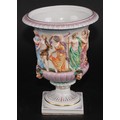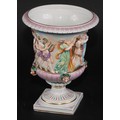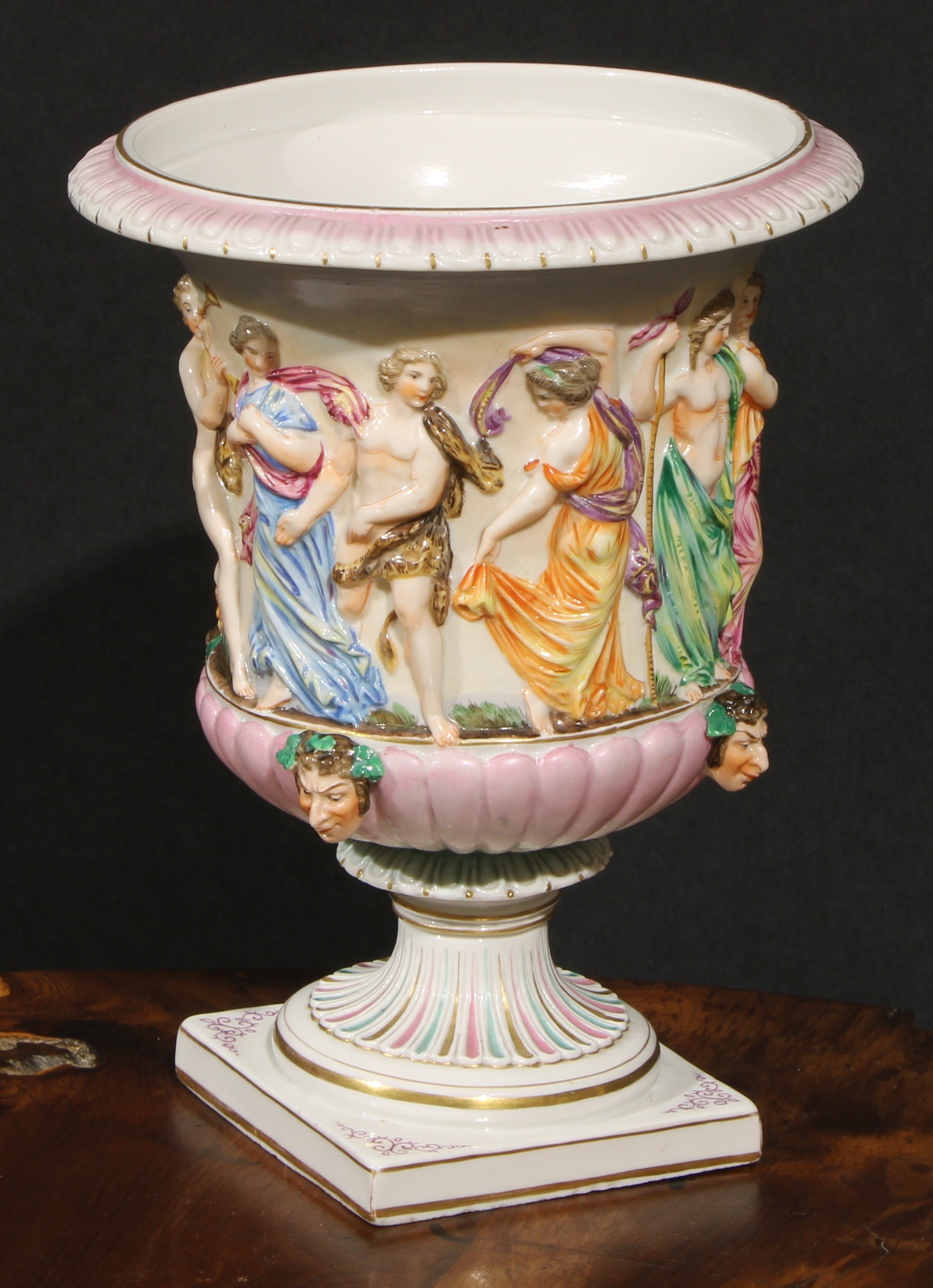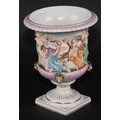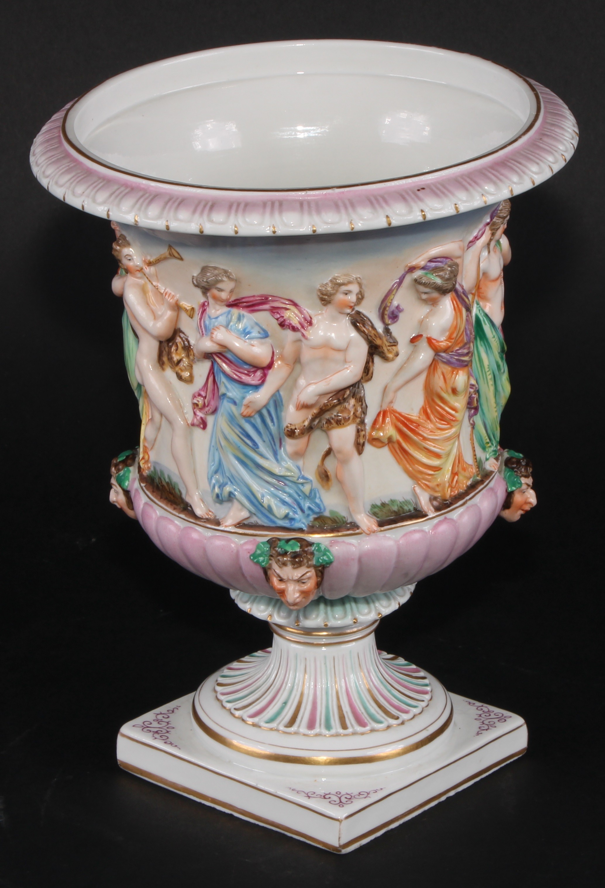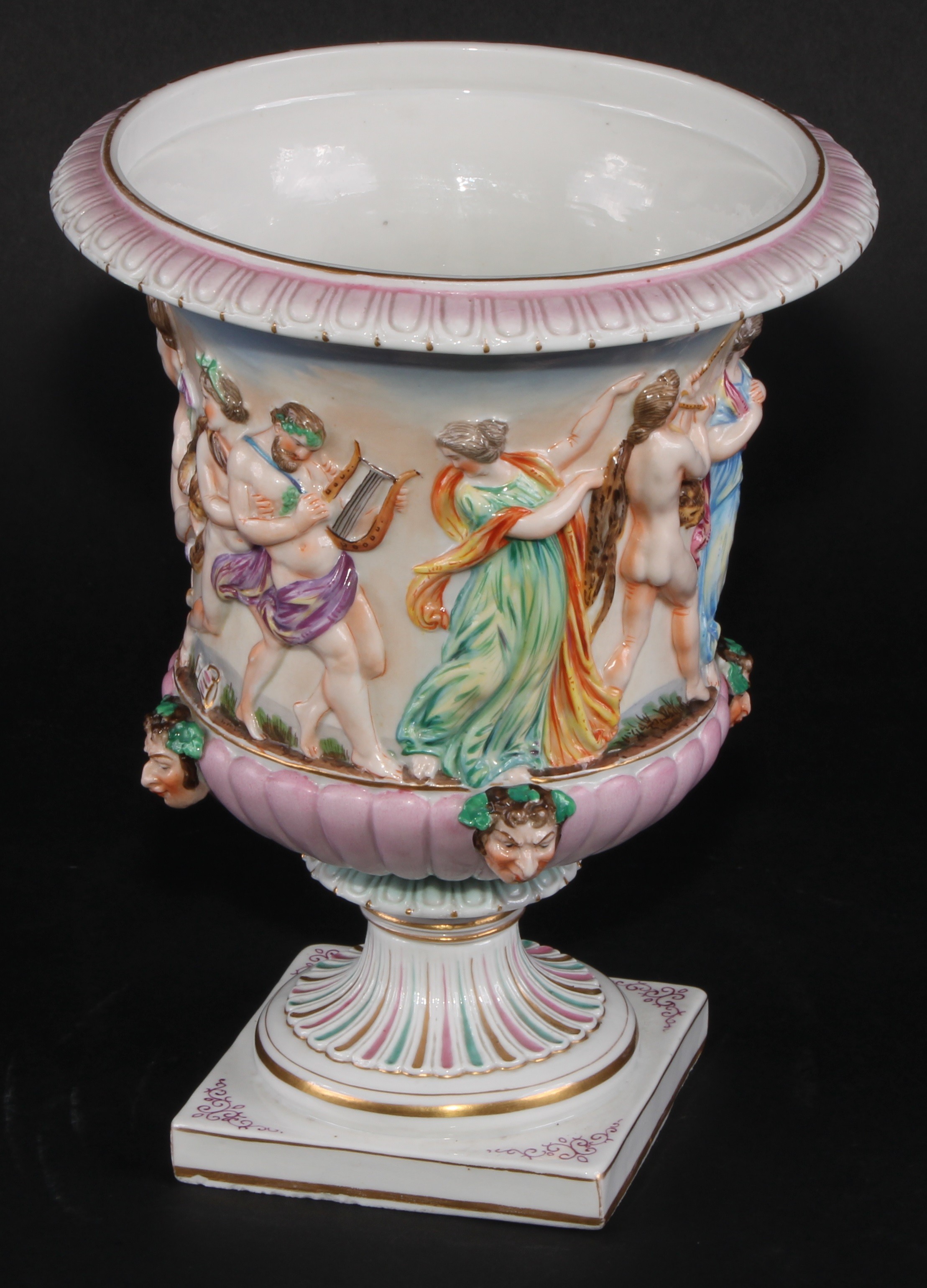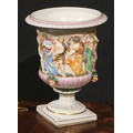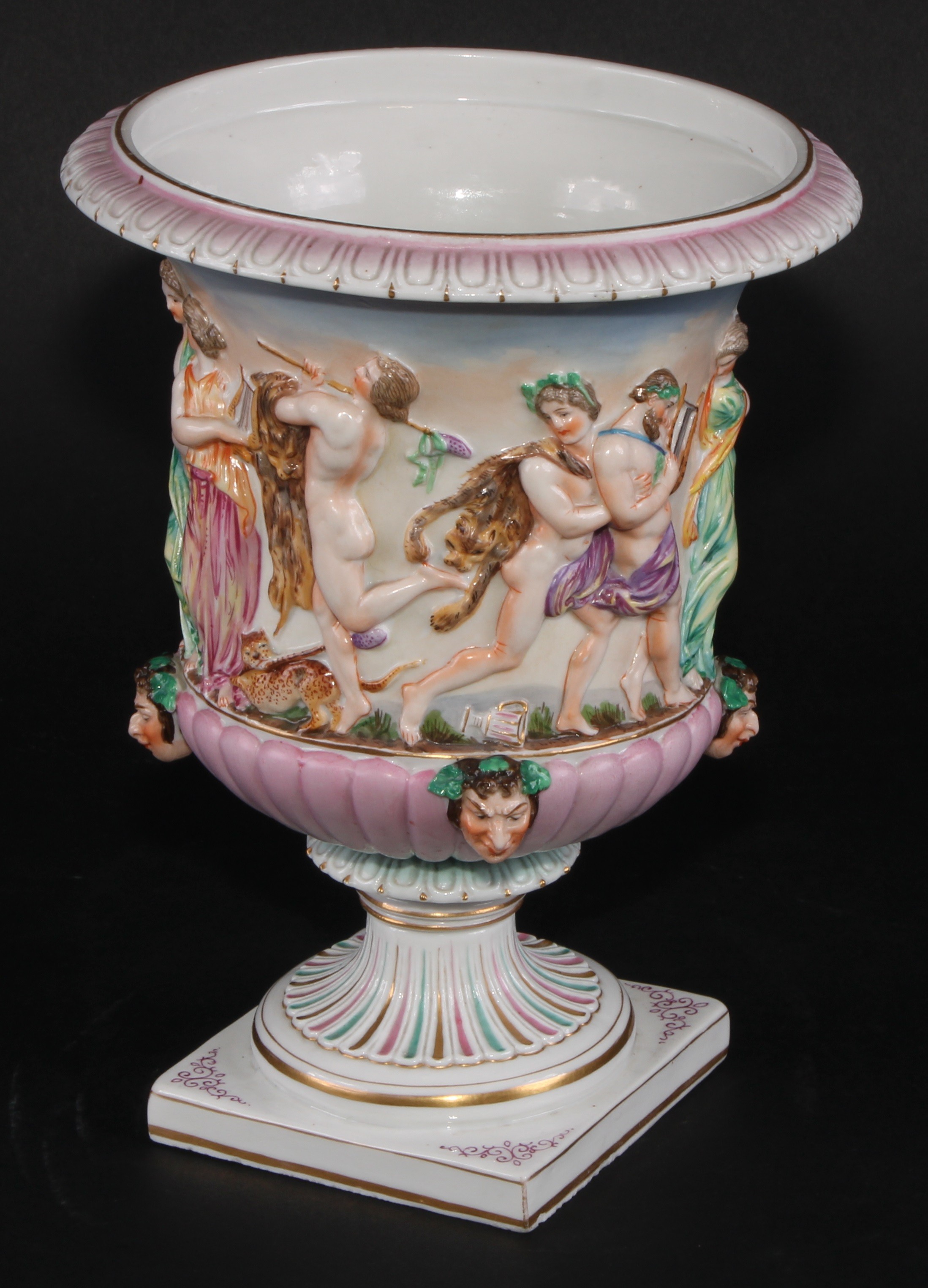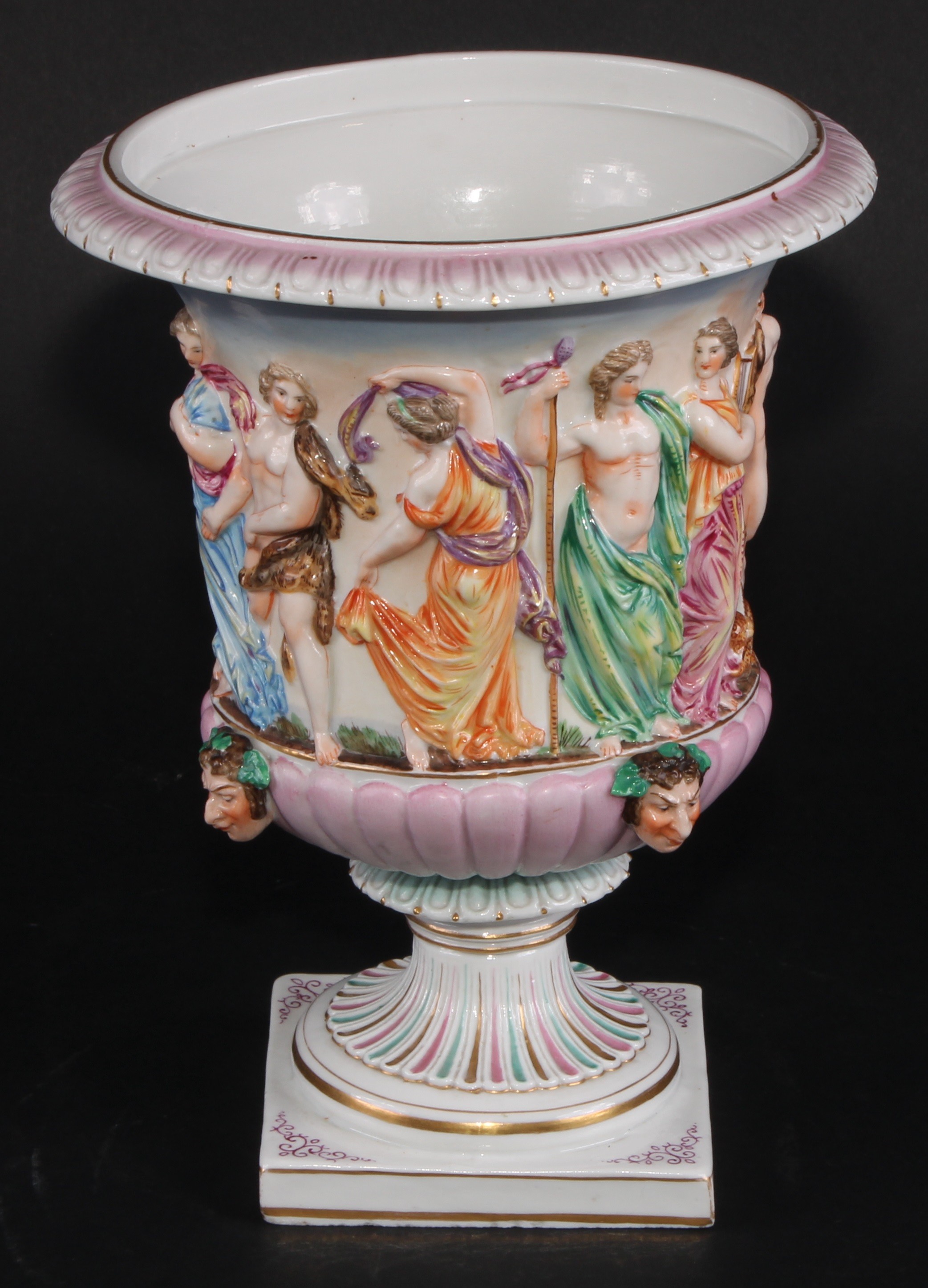 A Naples porcelain campana shaped mantel urn, moulded in relief with classical figures dancing and playing instruments above a stop fluted band interspersed by amusing Bacchus masks, gadrooned socle, square pedestal base, 20cm high, marks erased, c.1900