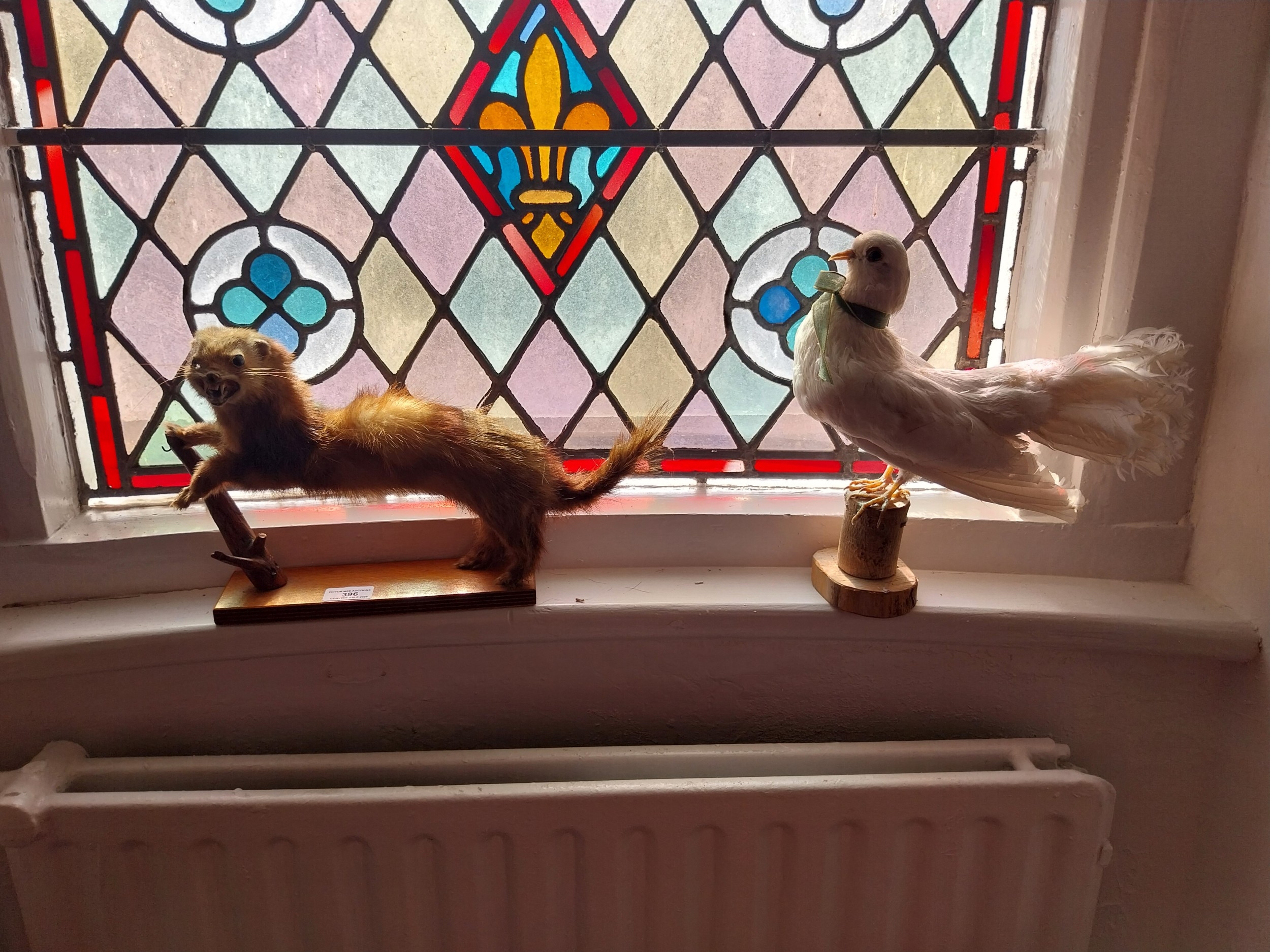 Early 20th. C. taxidermy Dove and Weasel. { 31cm H X 30cm W X 15cm D & 25cm H X 40cm W X 12cm D }.