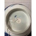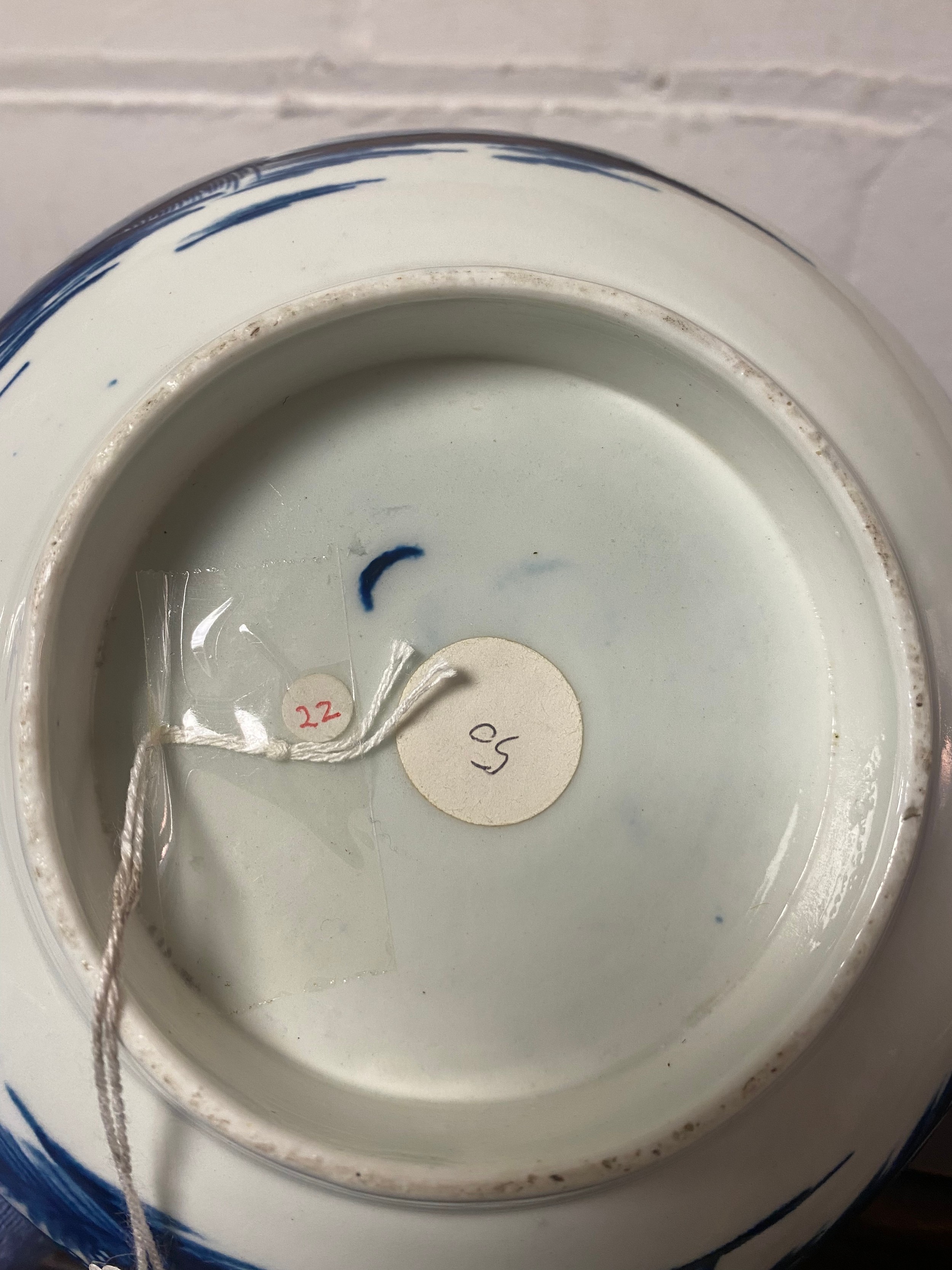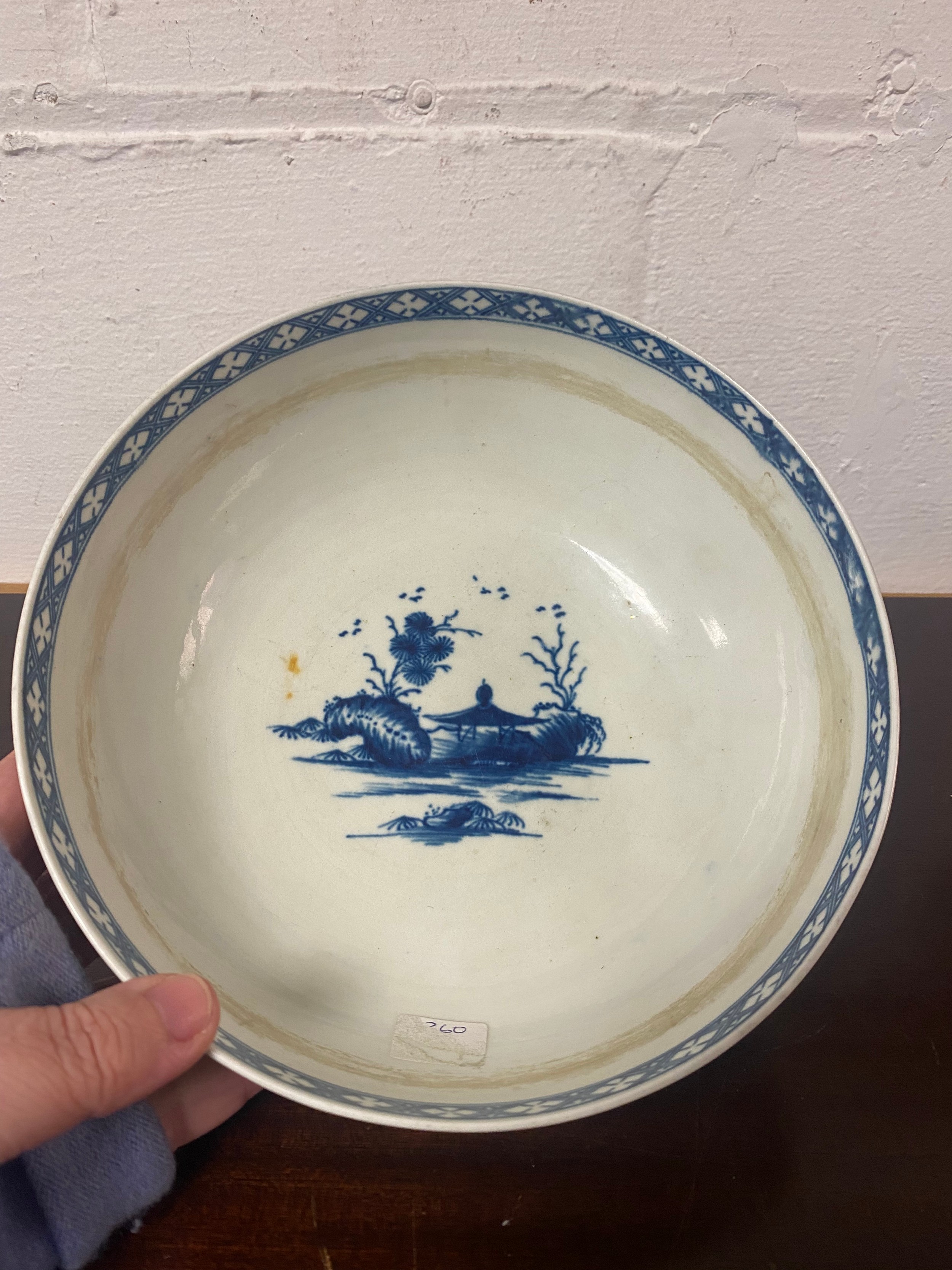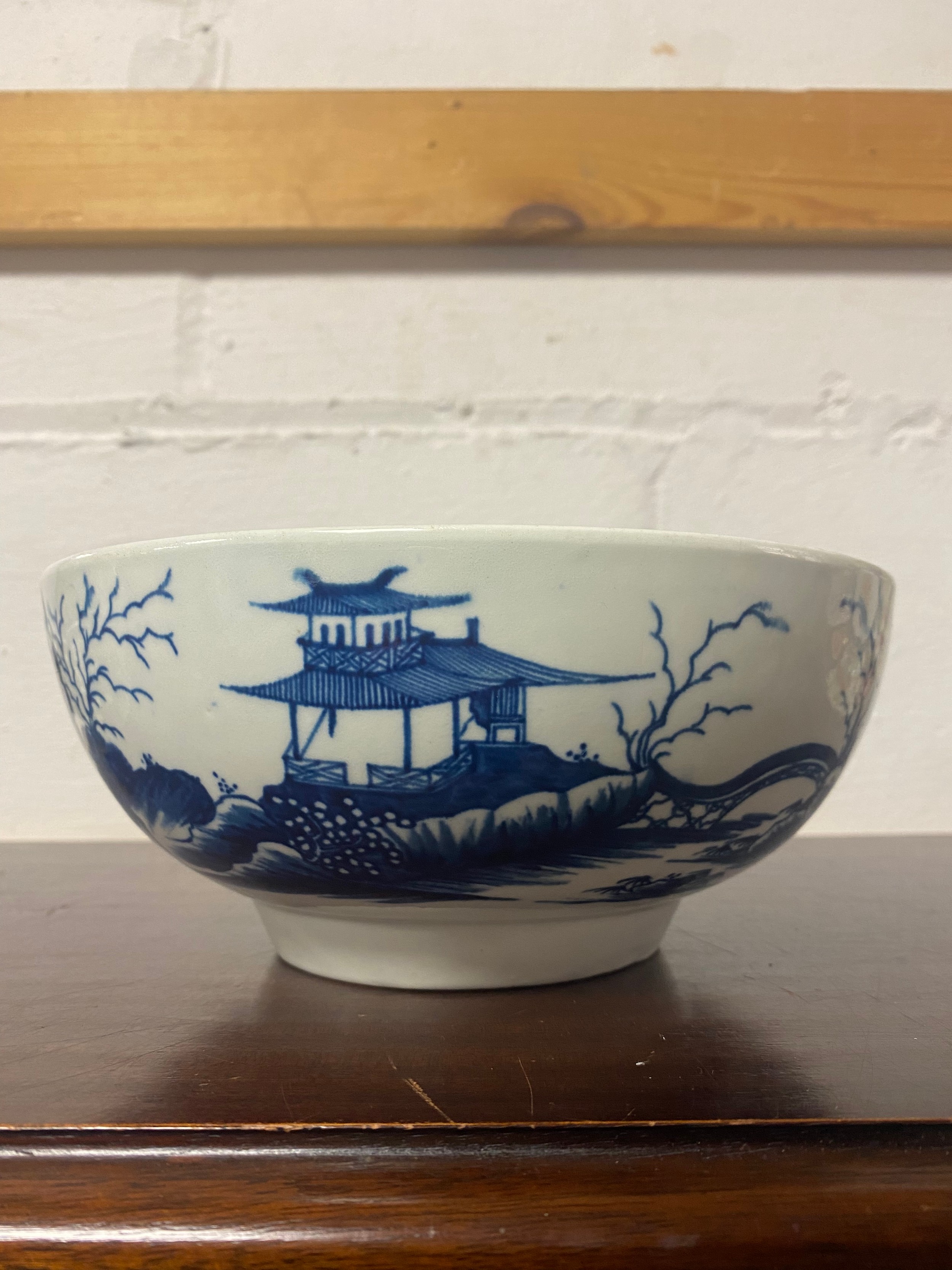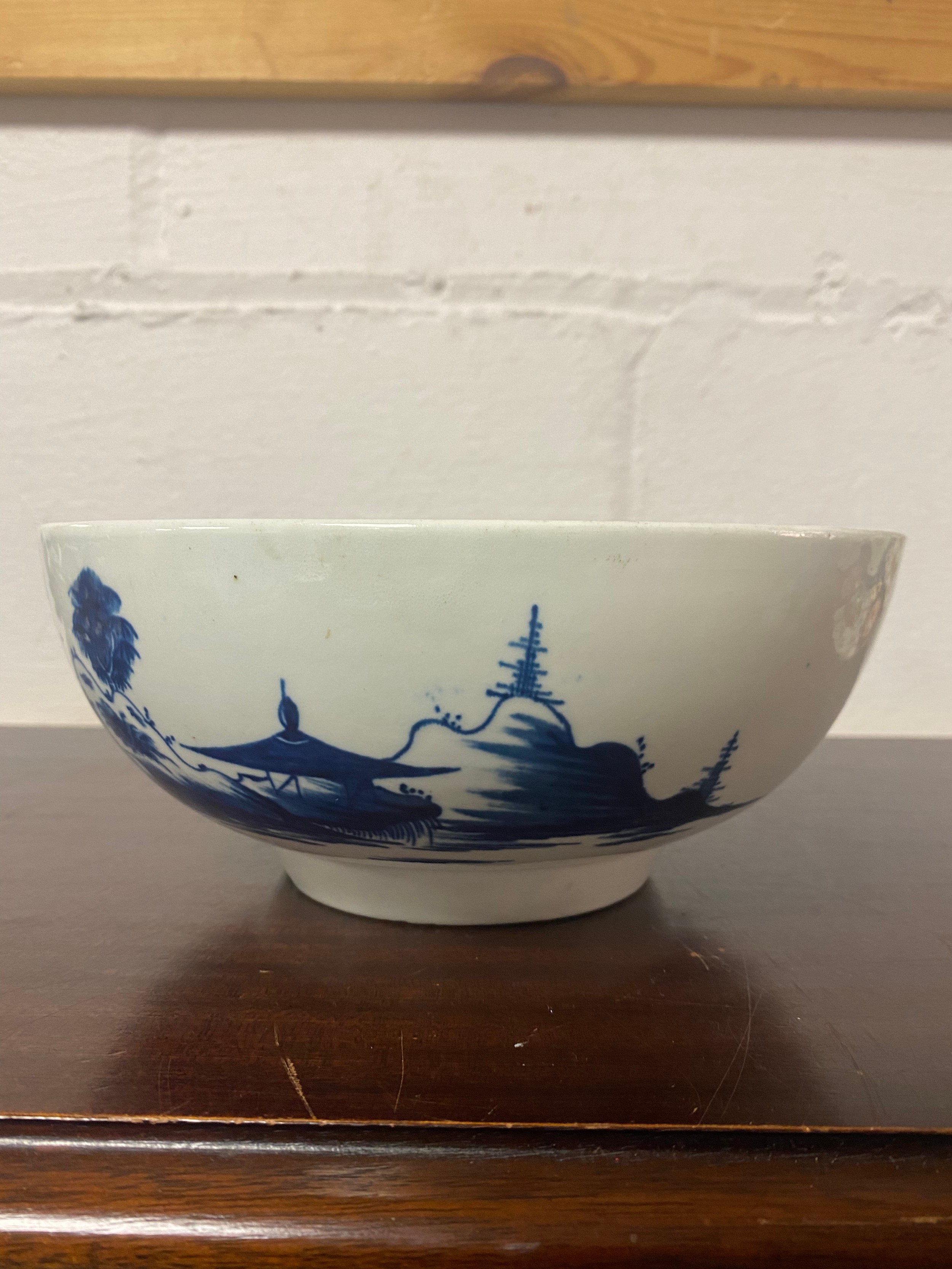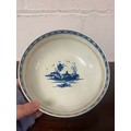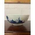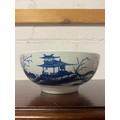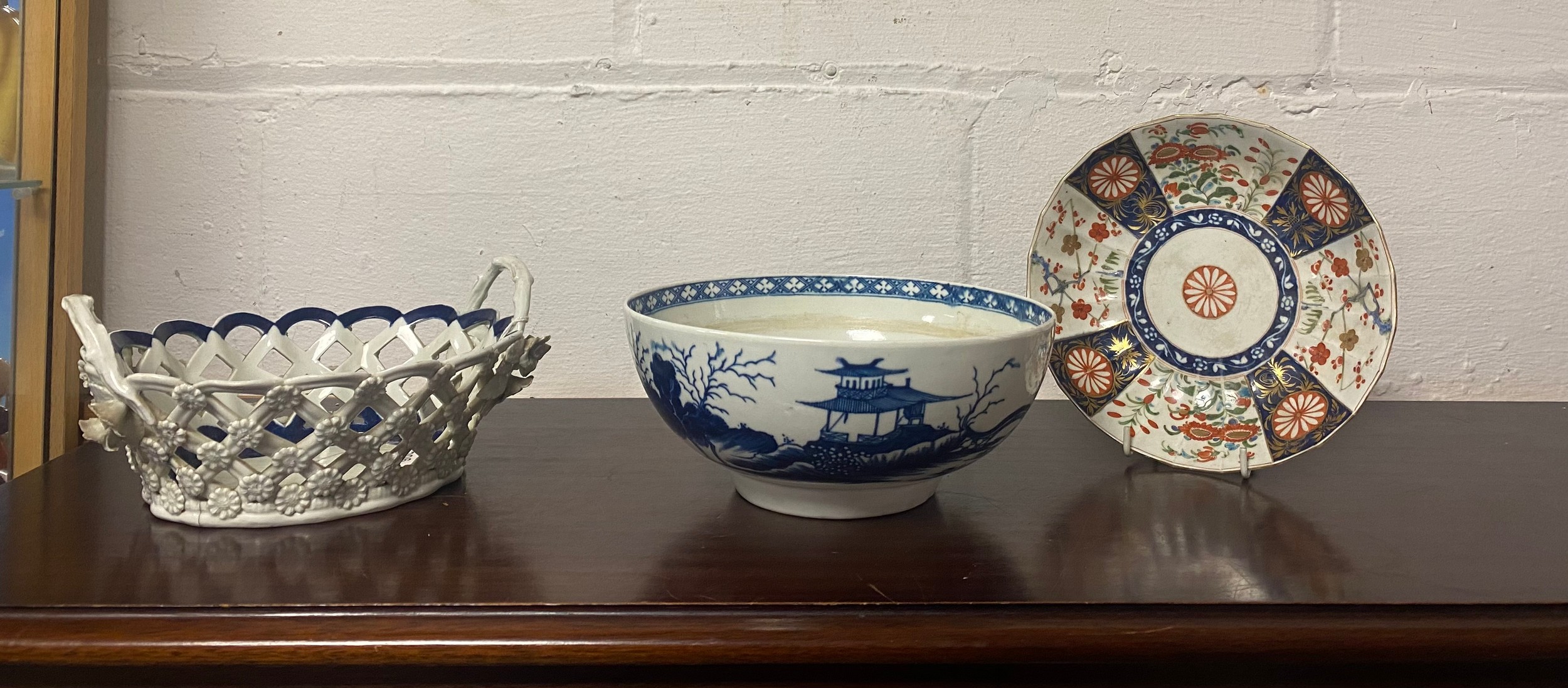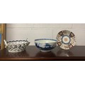 An 18th century Worcester blue and white bowl, decorated with the 'Precipice' pattern, a continuous landscape scene to exterior, crescent mark to underside, together with a pierced basket (a/f) and a scalloped dish (3) -