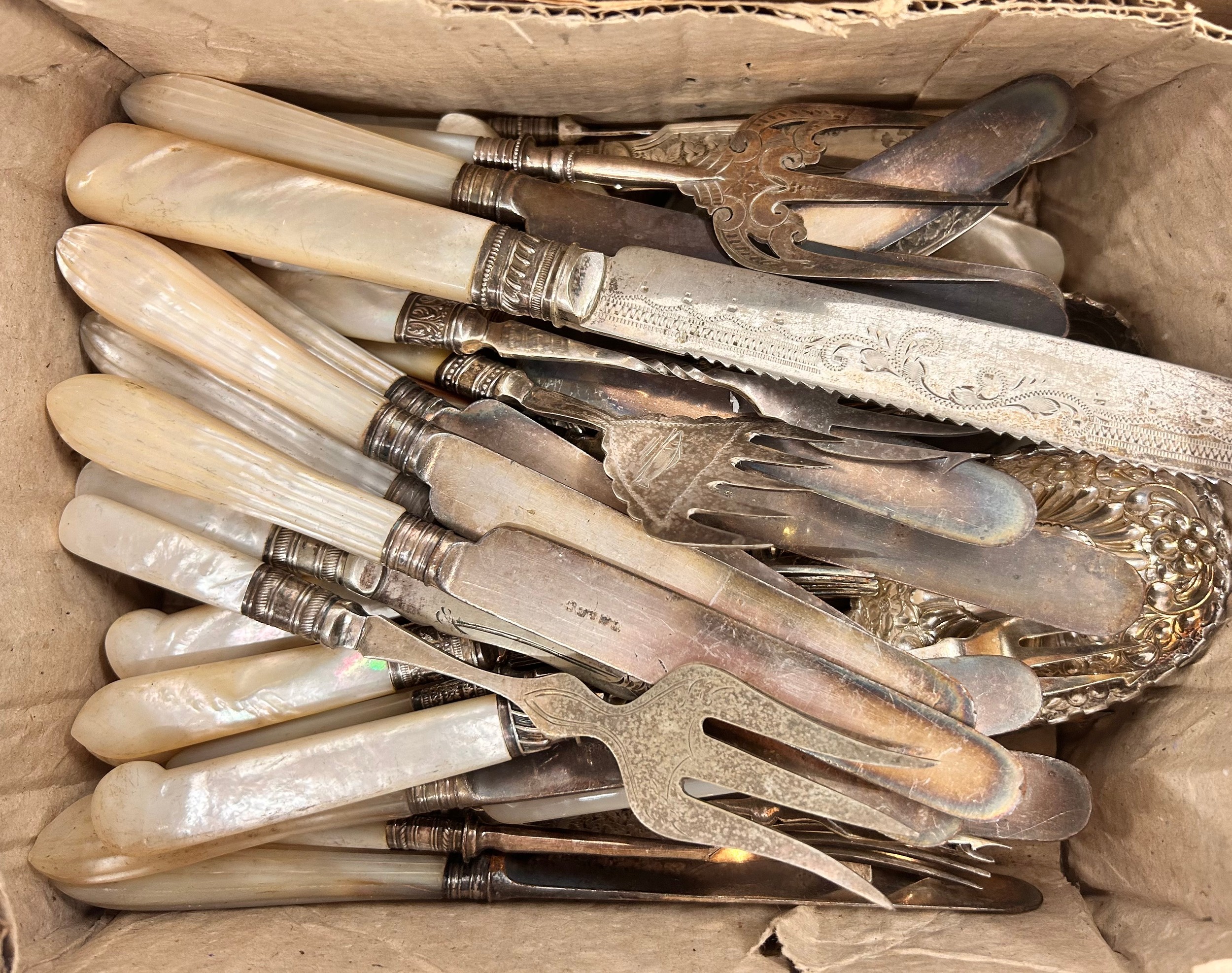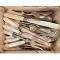A collection of plated flatware most with mother of pearl handles