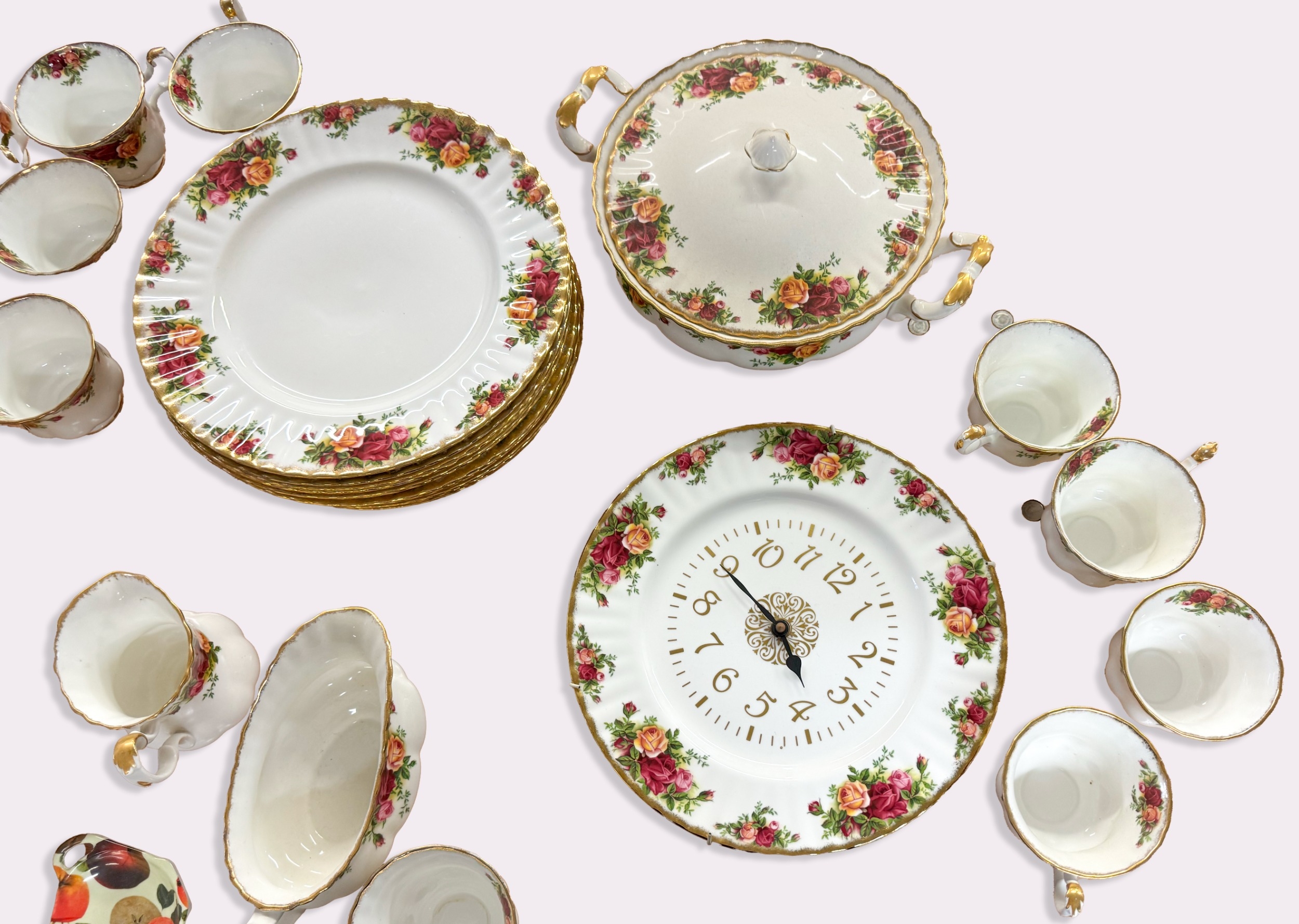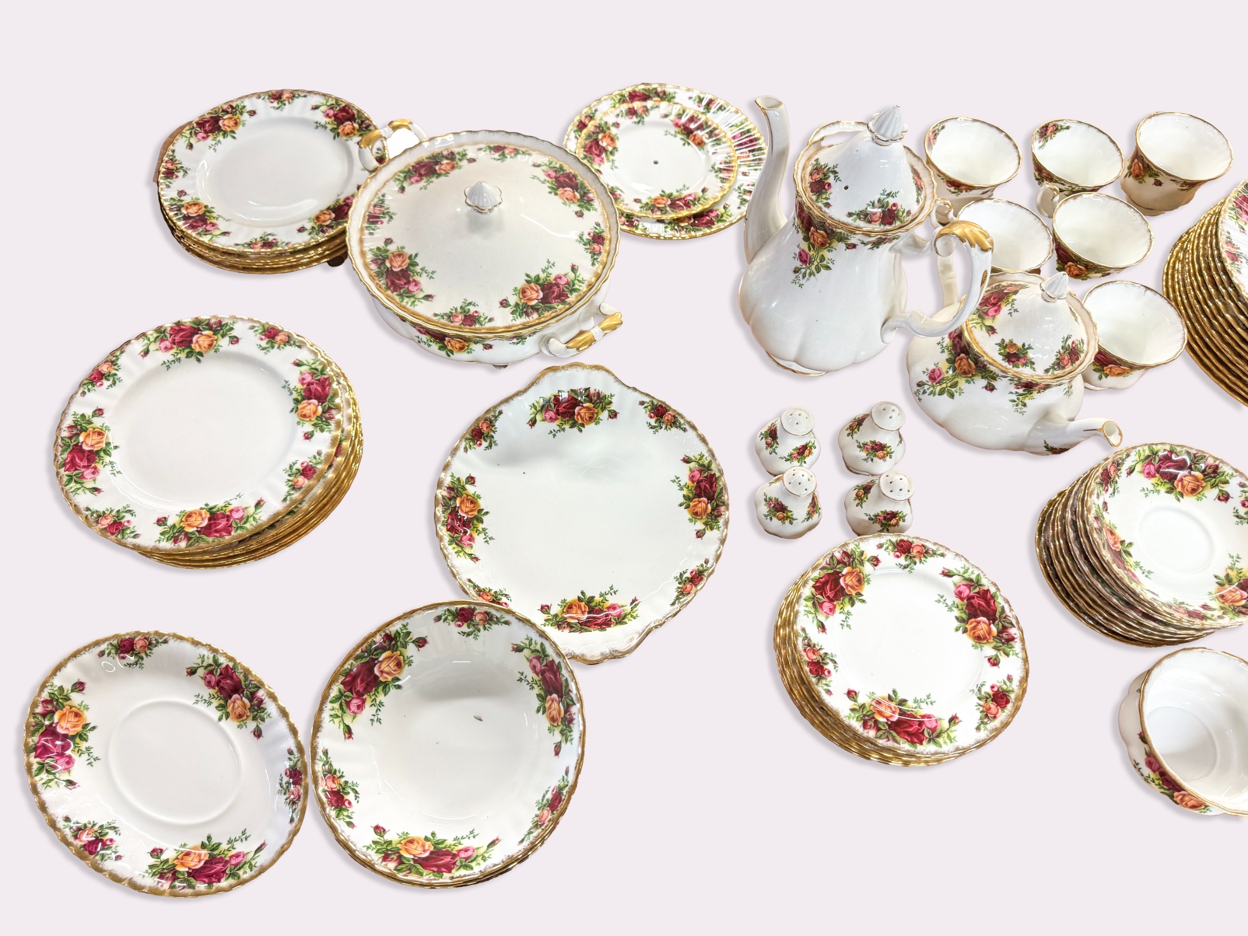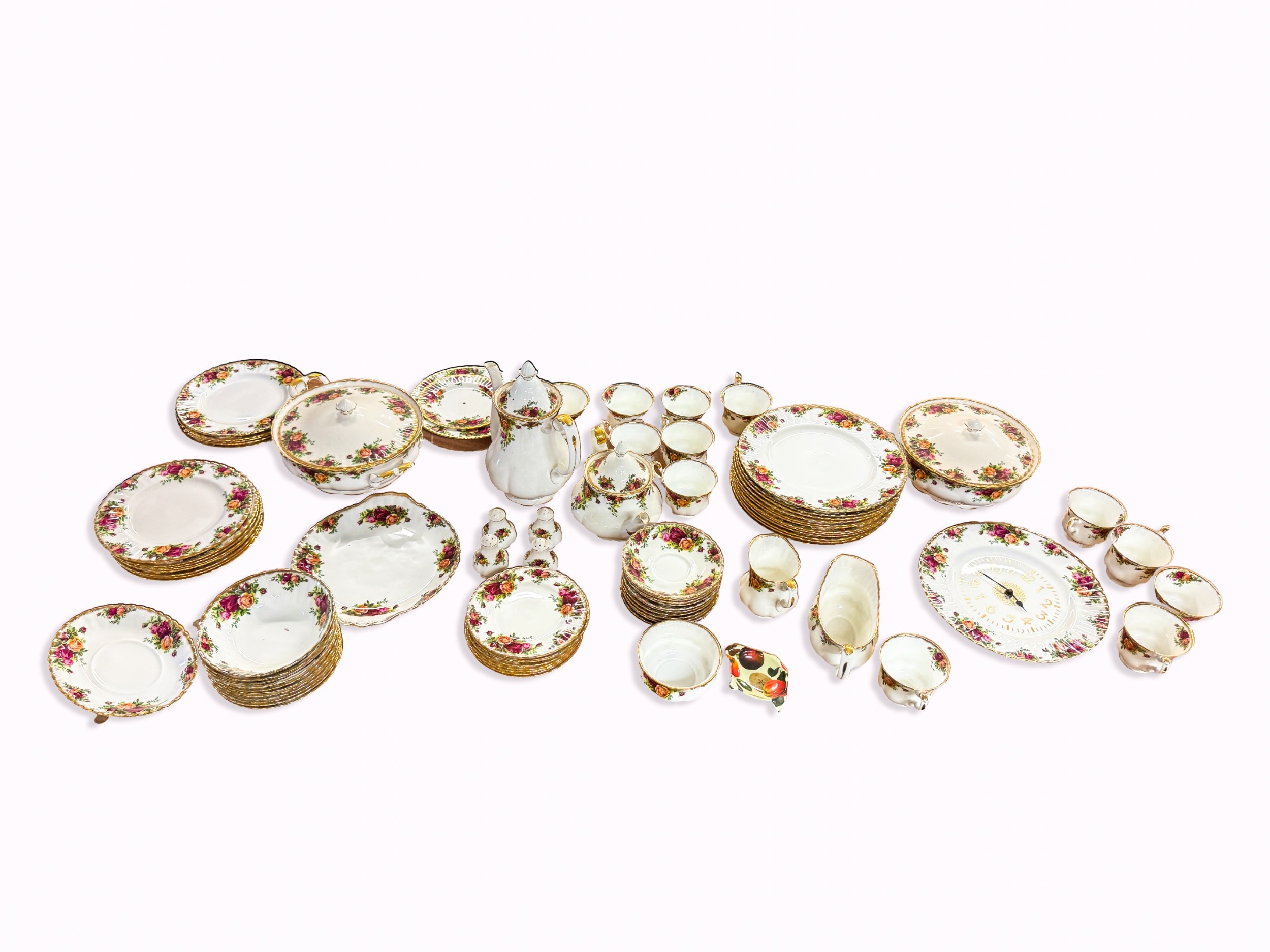 An extensive partial tea service of Royal Albert 'Old Country Roses' pattern, comprising of 13 side plates, 10 small side plates, 11 bowls, a cake stand, a platter, two tiers of a cake stand without supports, twelve dinner plates, twelve cups and saucers (one cup a/f), a coffee pot, teapot, milk jug, sugar bowl, gravy boat and saucer, two pairs of salt and pepper shakers, two tureens, together with a battery operated wall clock.