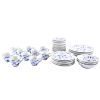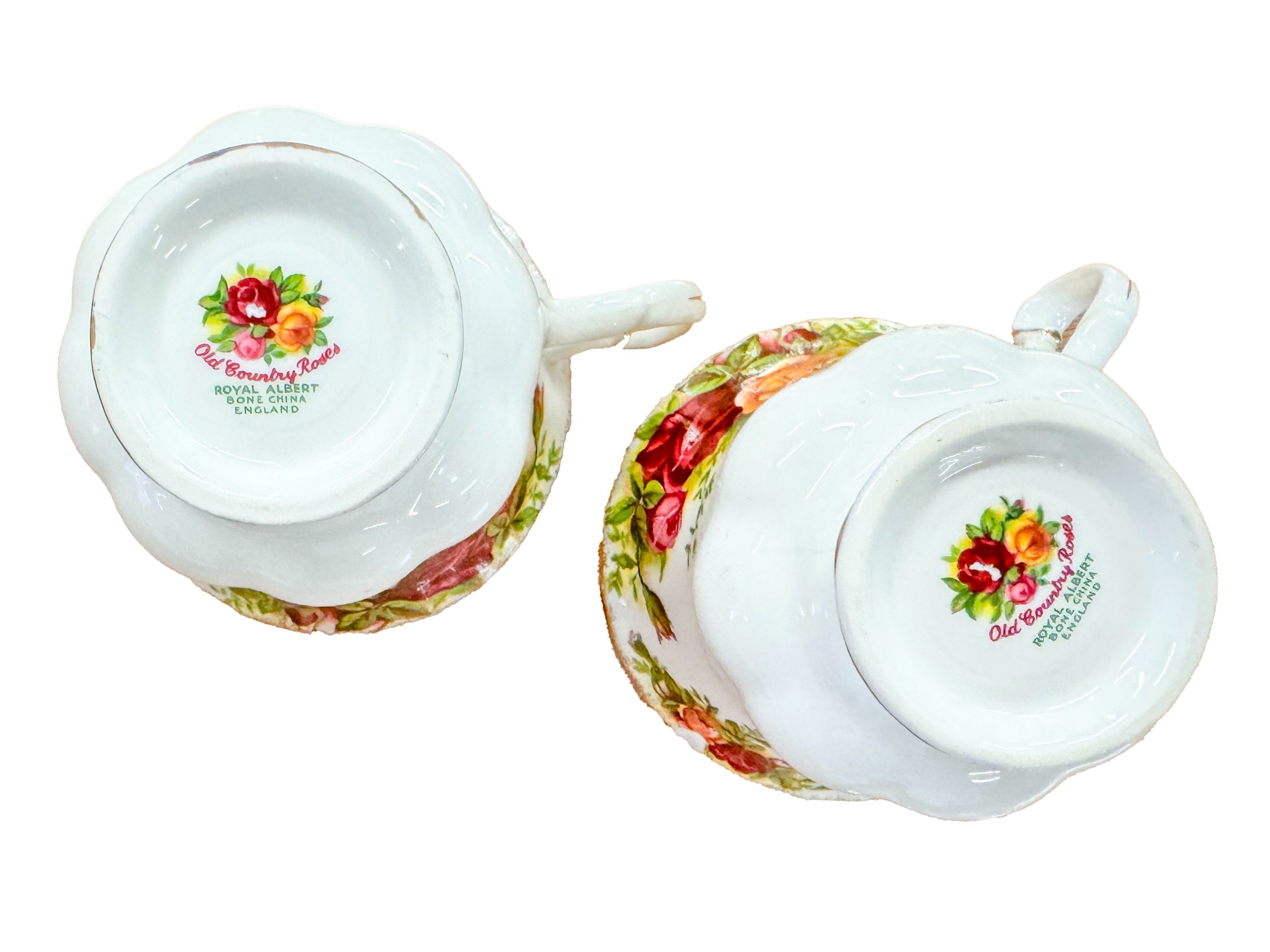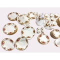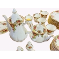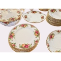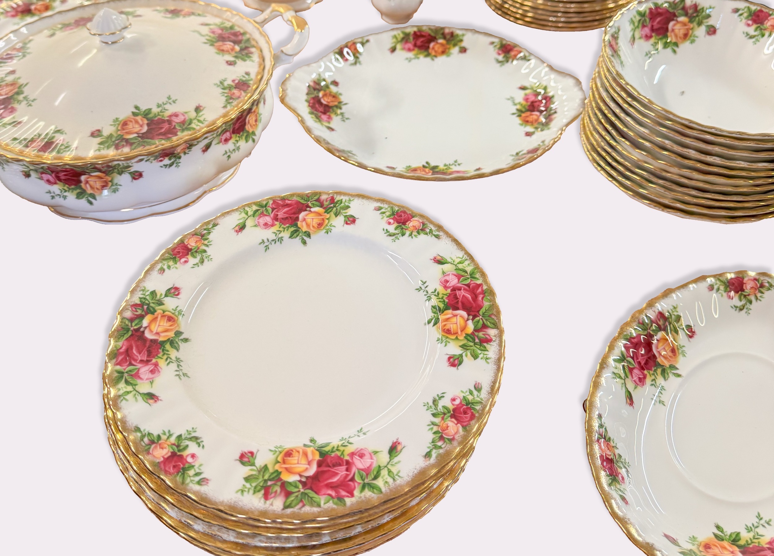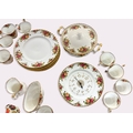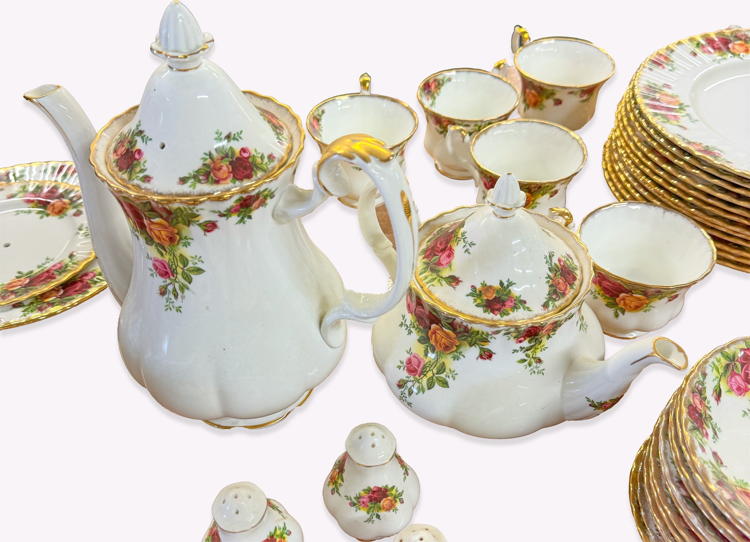 An extensive partial tea service of Royal Albert 'Old Country Roses' pattern, comprising of 13 side plates, 10 small side plates, 11 bowls, a cake stand, a platter, two tiers of a cake stand without supports, twelve dinner plates, twelve cups and saucers (one cup a/f), a coffee pot, teapot, milk jug, sugar bowl, gravy boat and saucer, two pairs of salt and pepper shakers, two tureens, together with a battery operated wall clock.