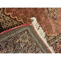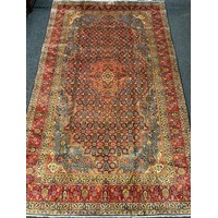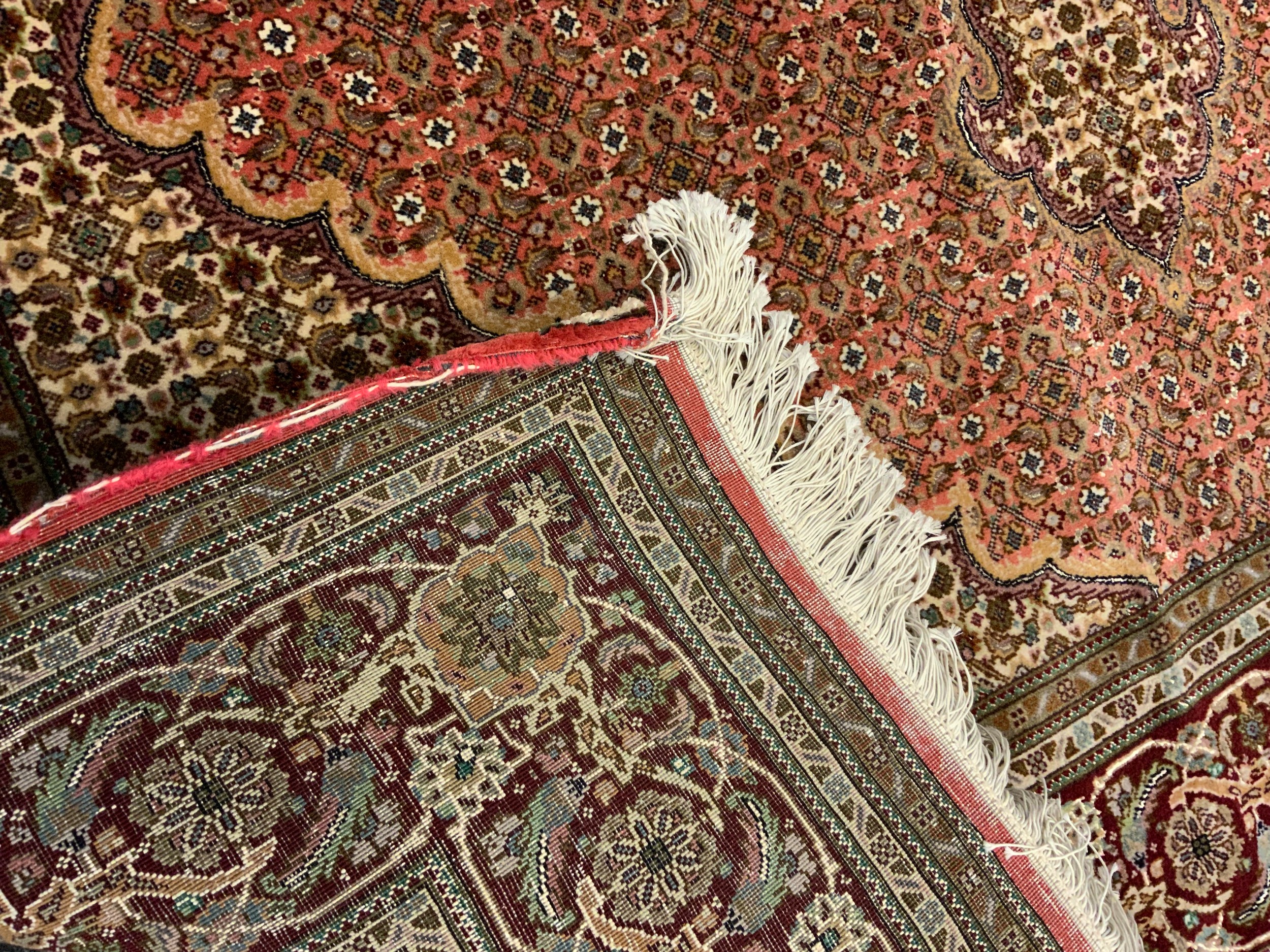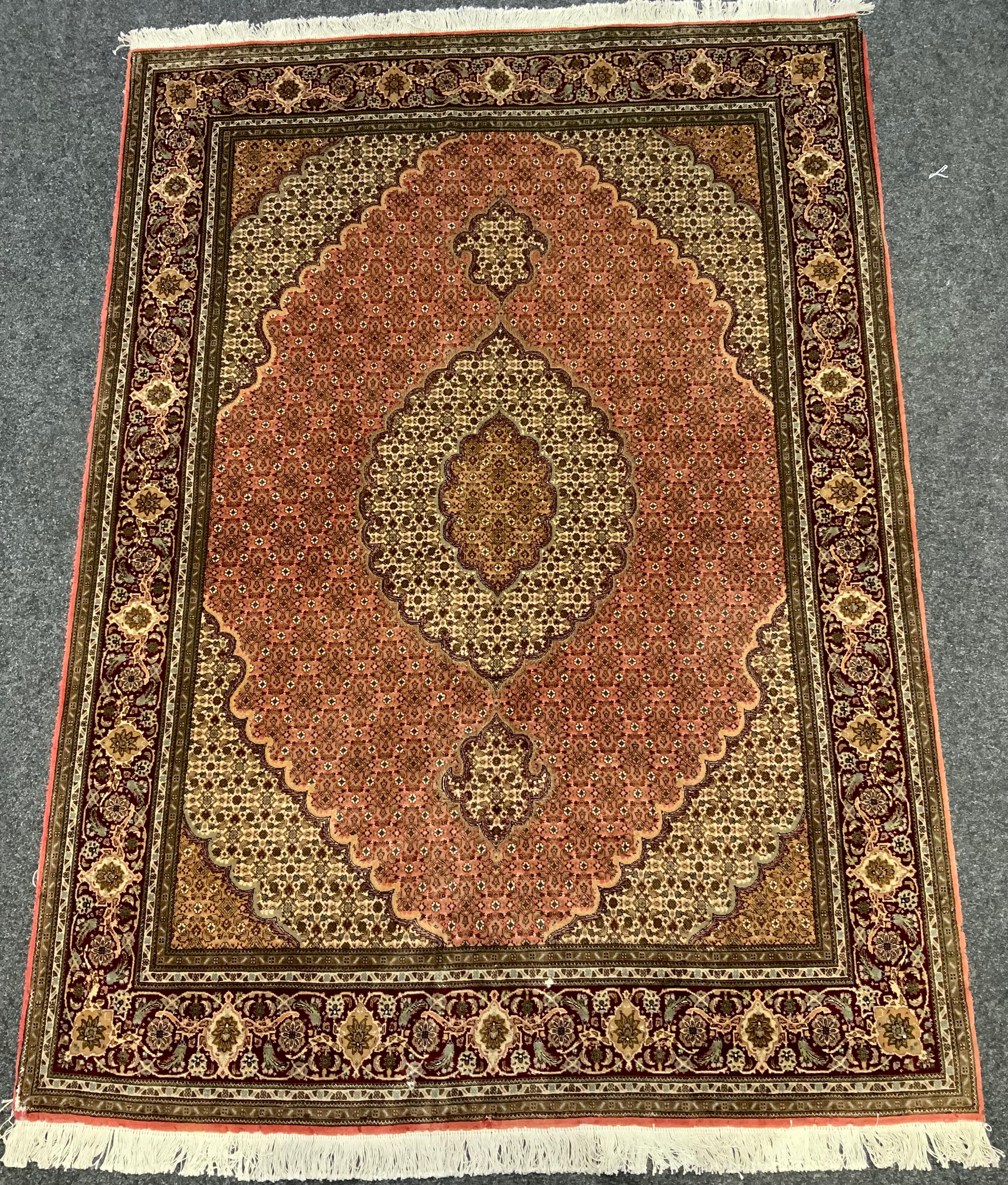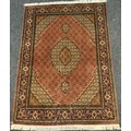 A fine Persian, hand-made, Tabriz rug / carpet, woven with stylised floral motifs in shades of burgundy, ochre, and pale green, 210cm x 153cm.
