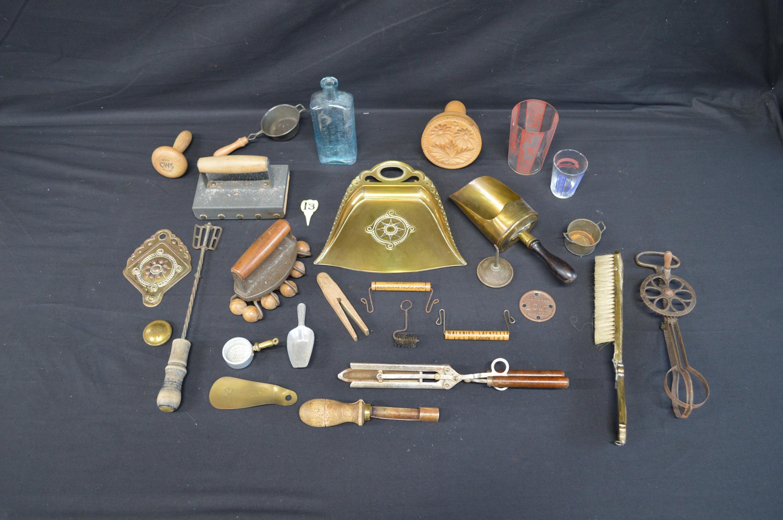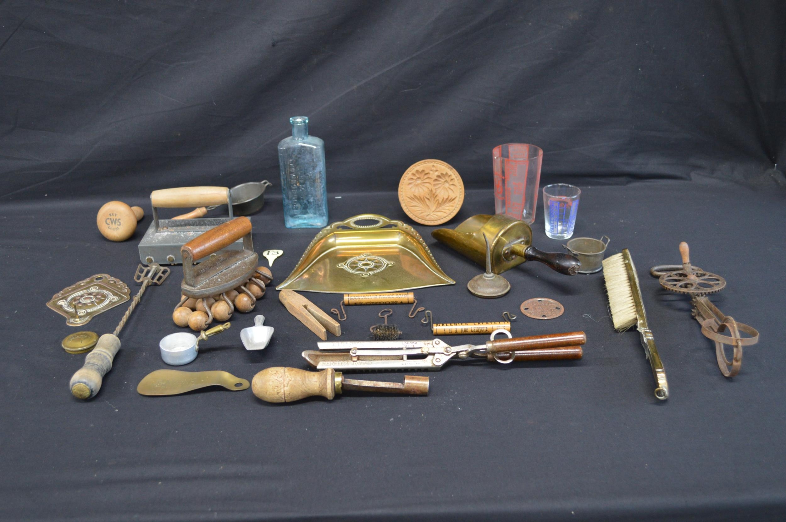 Collection of mostly kitchenalia to include: brass scoop, crumb tray with brush and hand operated whisk etc