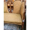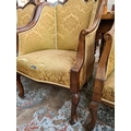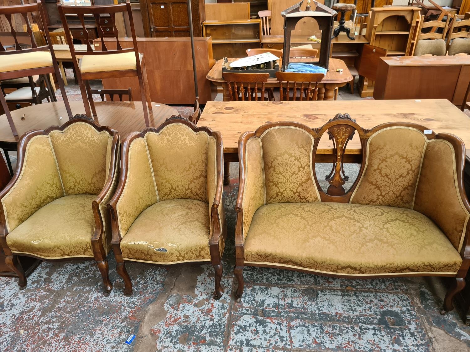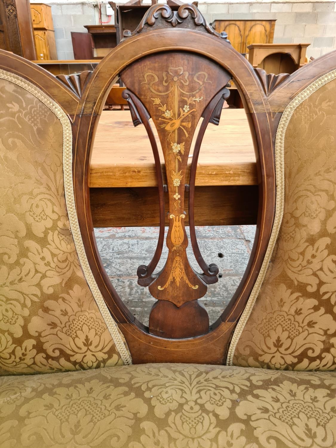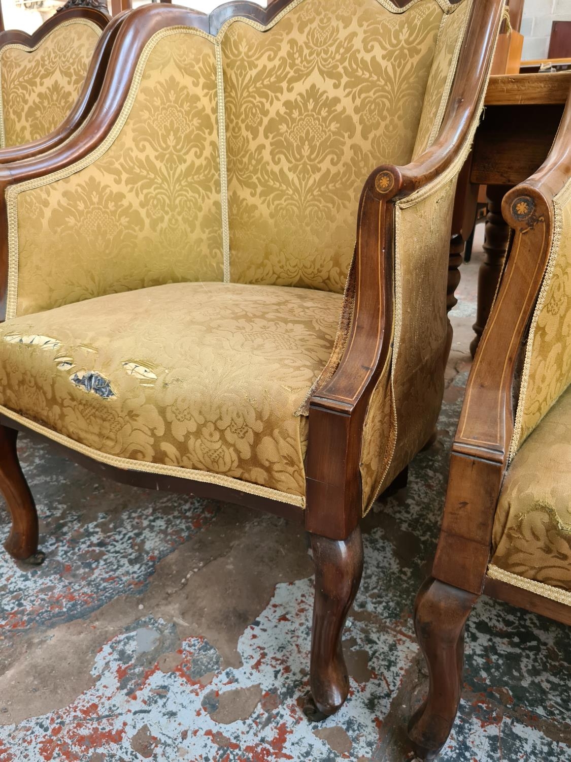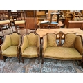 An Edwardian inlaid mahogany framed parlour suite comprising two seat sofa with central oval fretwork back with decorative swag inlay, yellow floral upholstery, cabriole supports and original castors together with two matching armchairs
