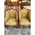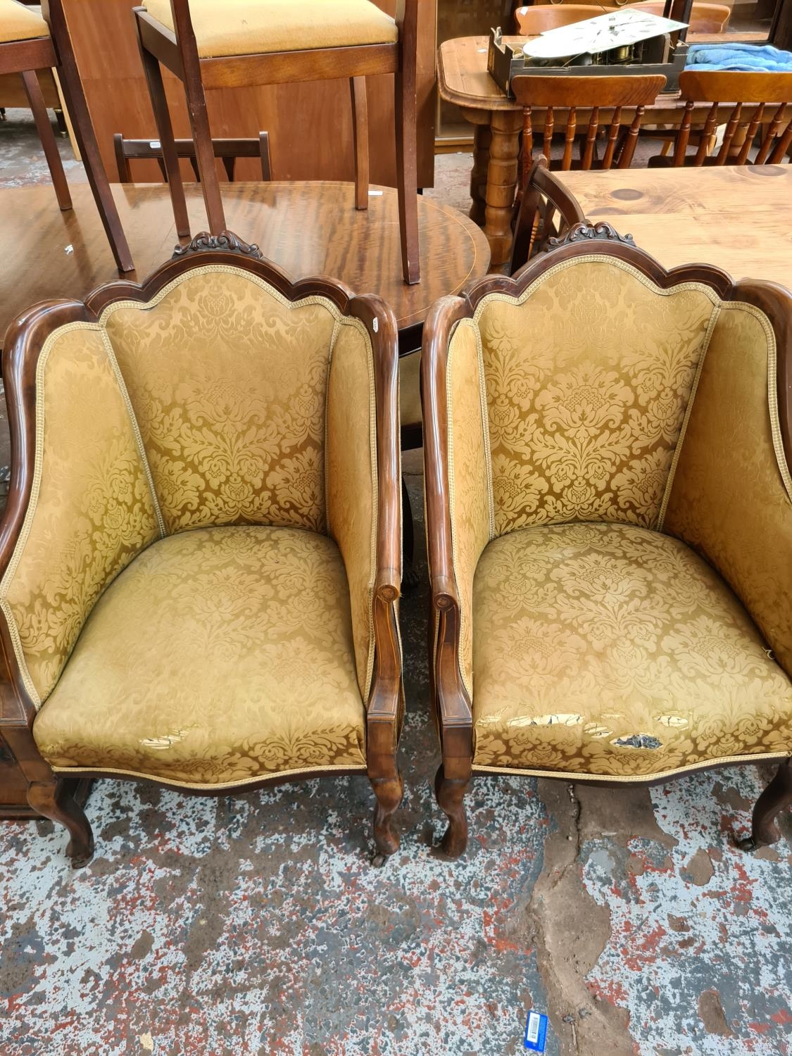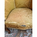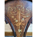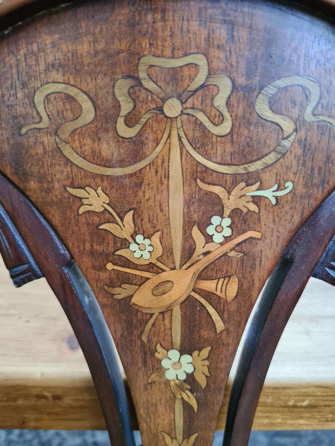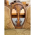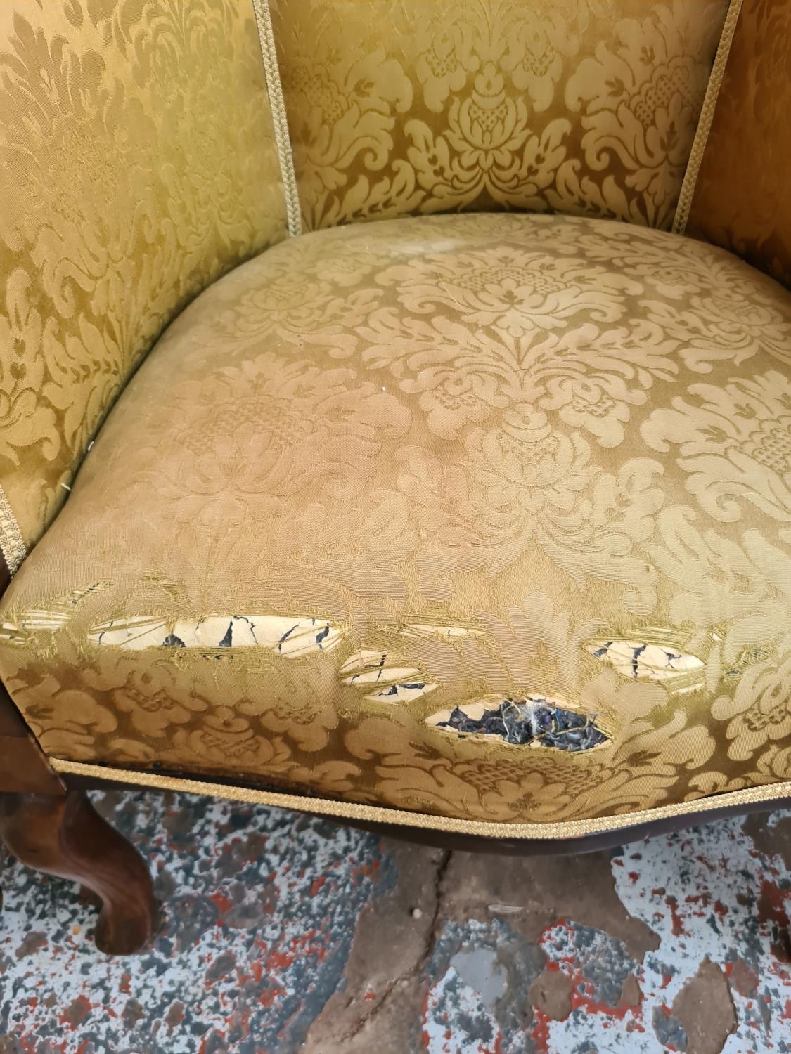 An Edwardian inlaid mahogany framed parlour suite comprising two seat sofa with central oval fretwork back with decorative swag inlay, yellow floral upholstery, cabriole supports and original castors together with two matching armchairs