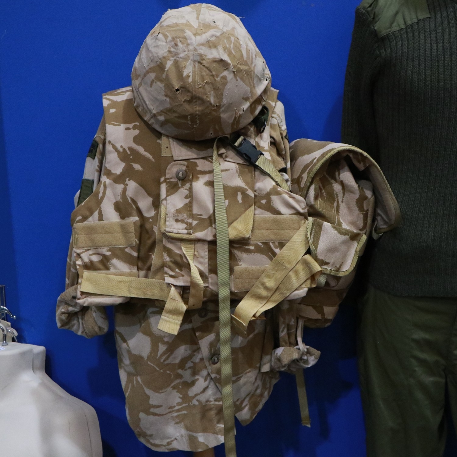 British military issue desert DPM camouflage body-armour vest, smock, helmet with cover and gas mask in case. UK P&P Group 3 (£35+VAT for the first lot and £10+VAT for subsequent lots)