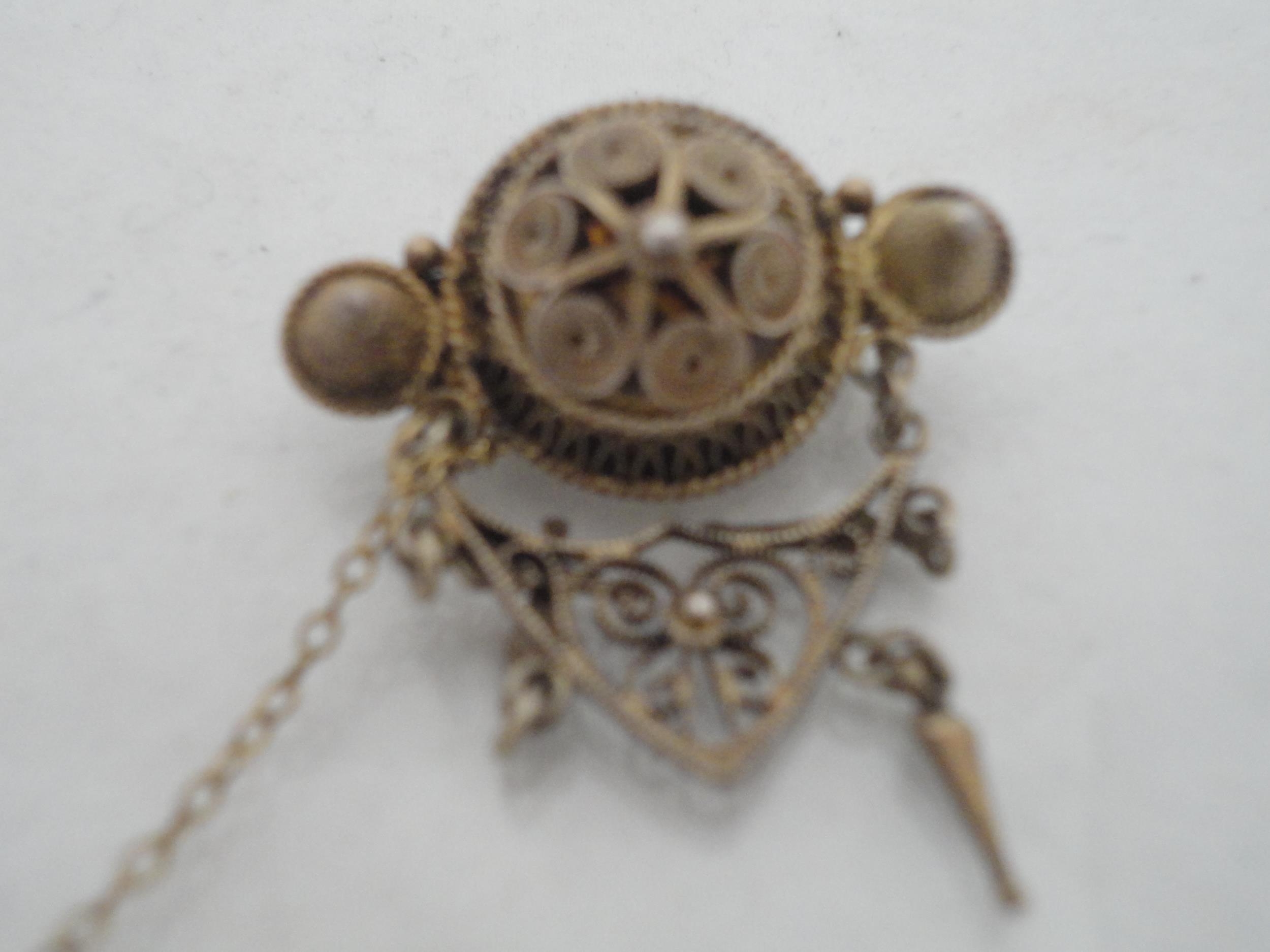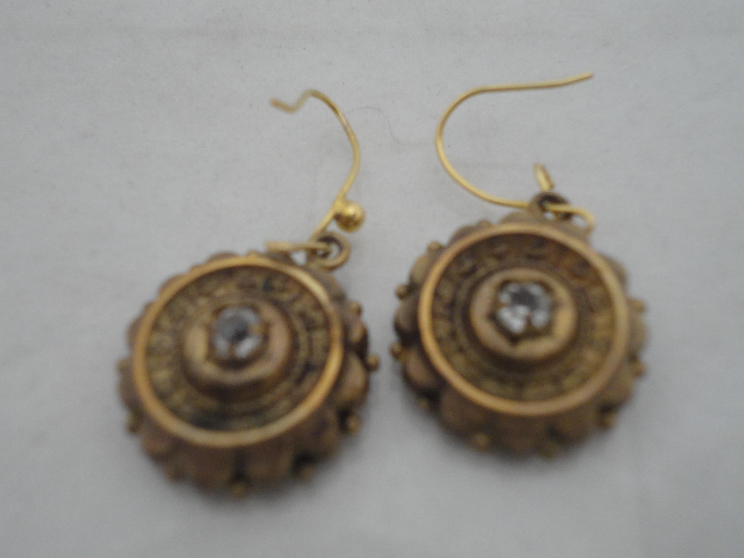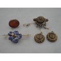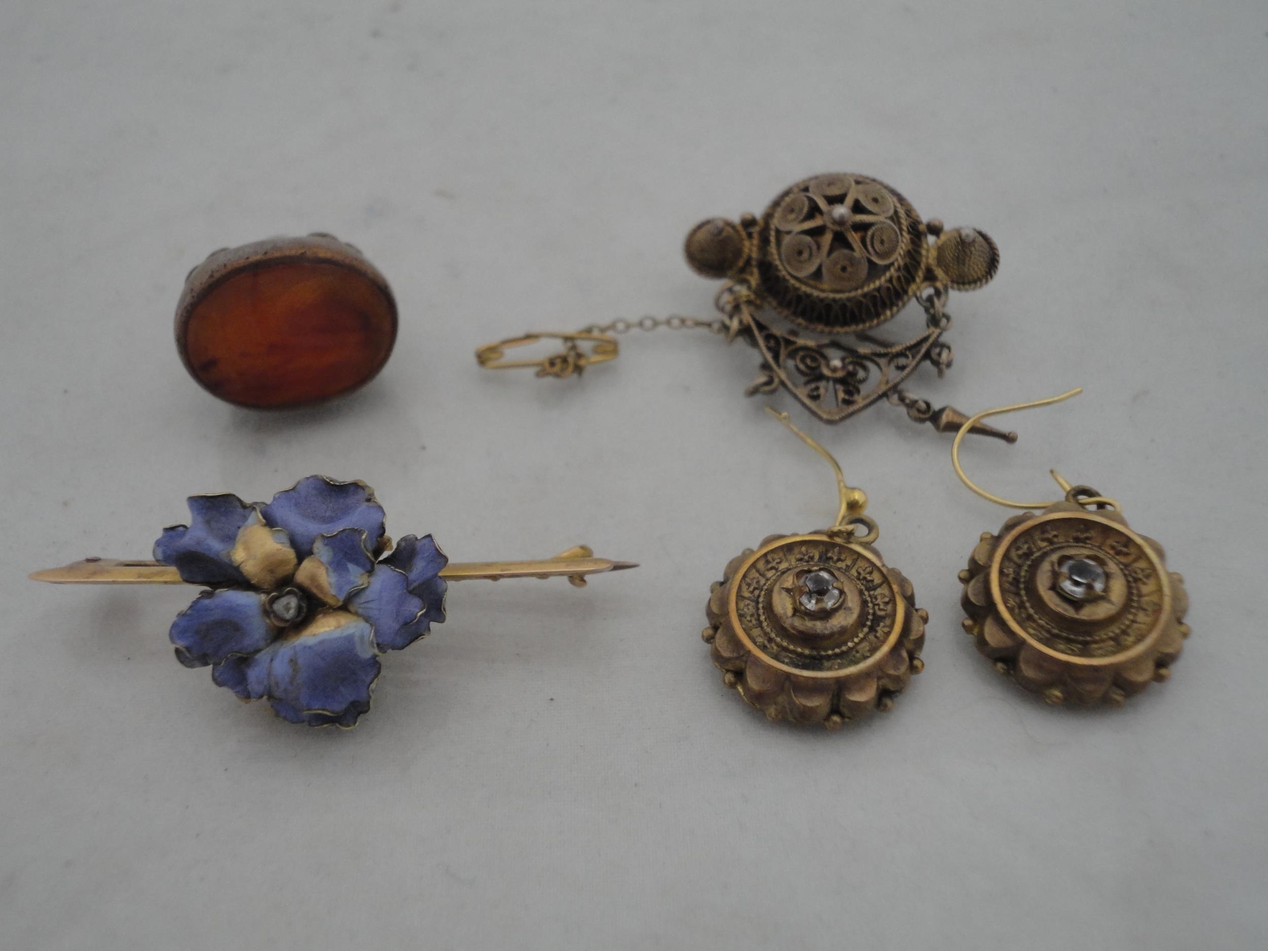 Decorative jewellery to include a yellow metal brooch with encrusted flowerhead, pair of Victorian balloon-shaped earrings, seal and a Victorian-style brooch.