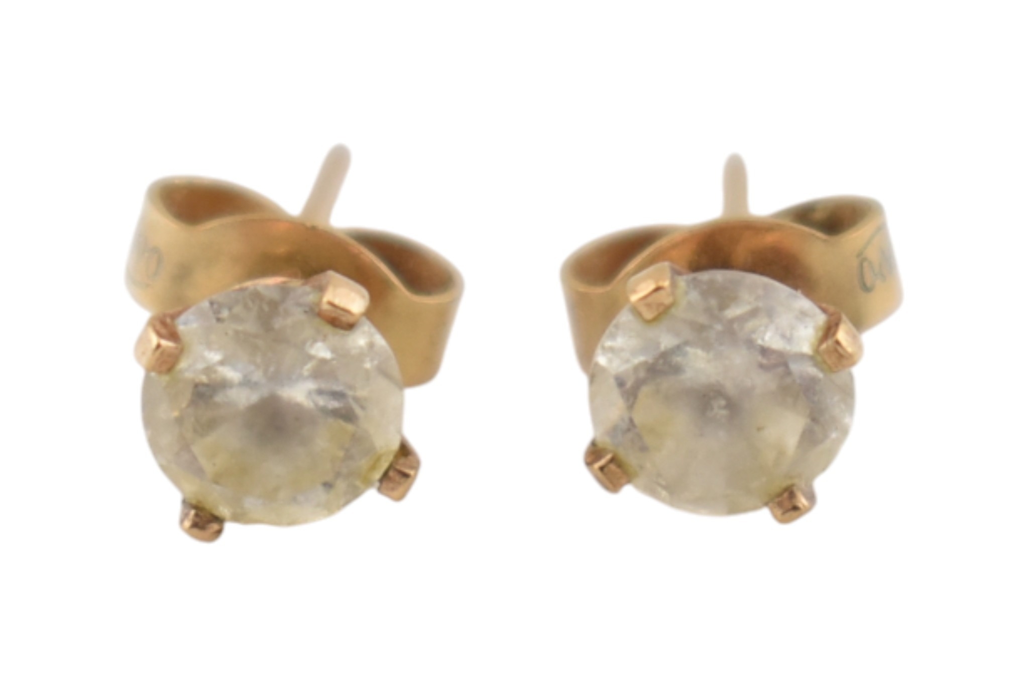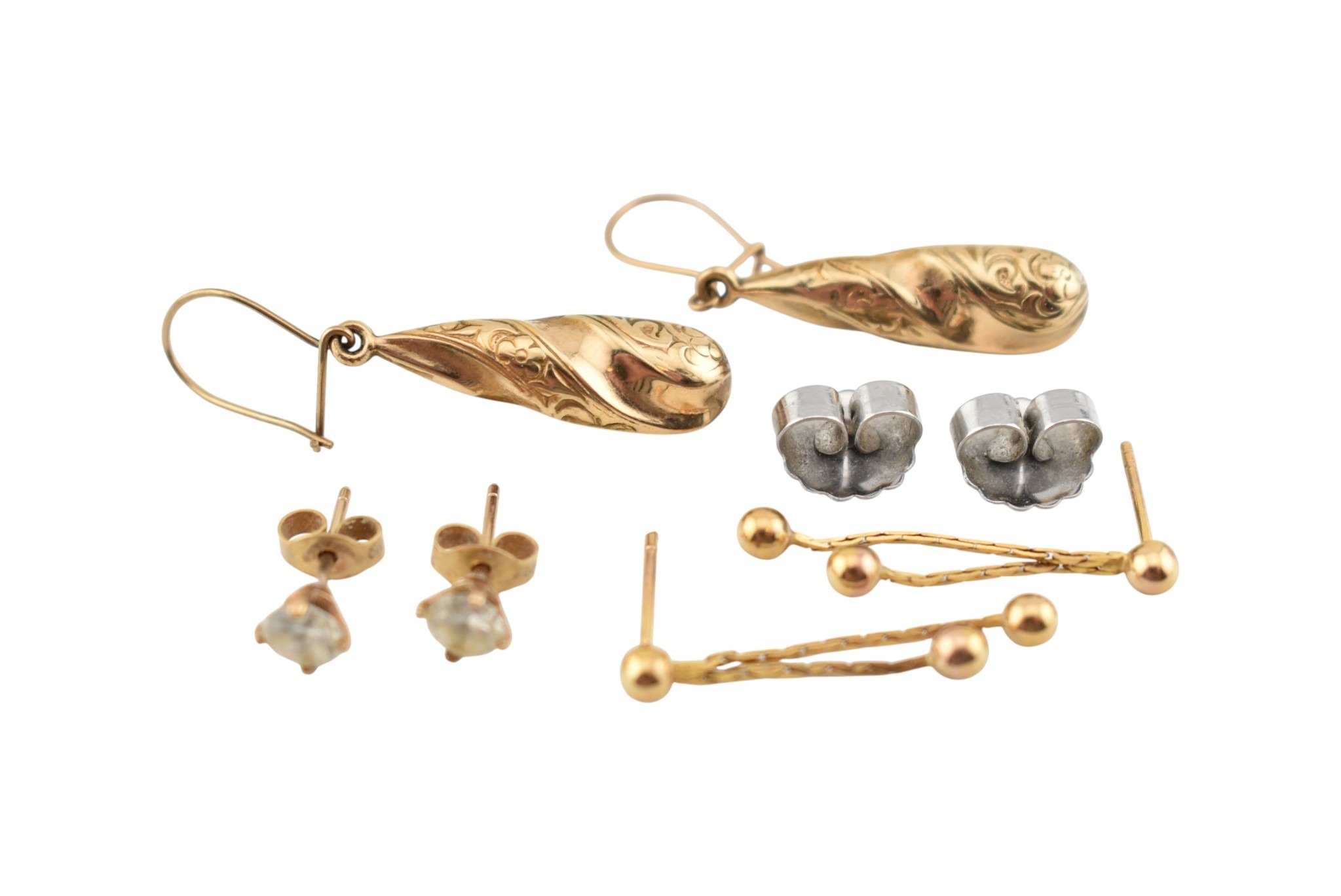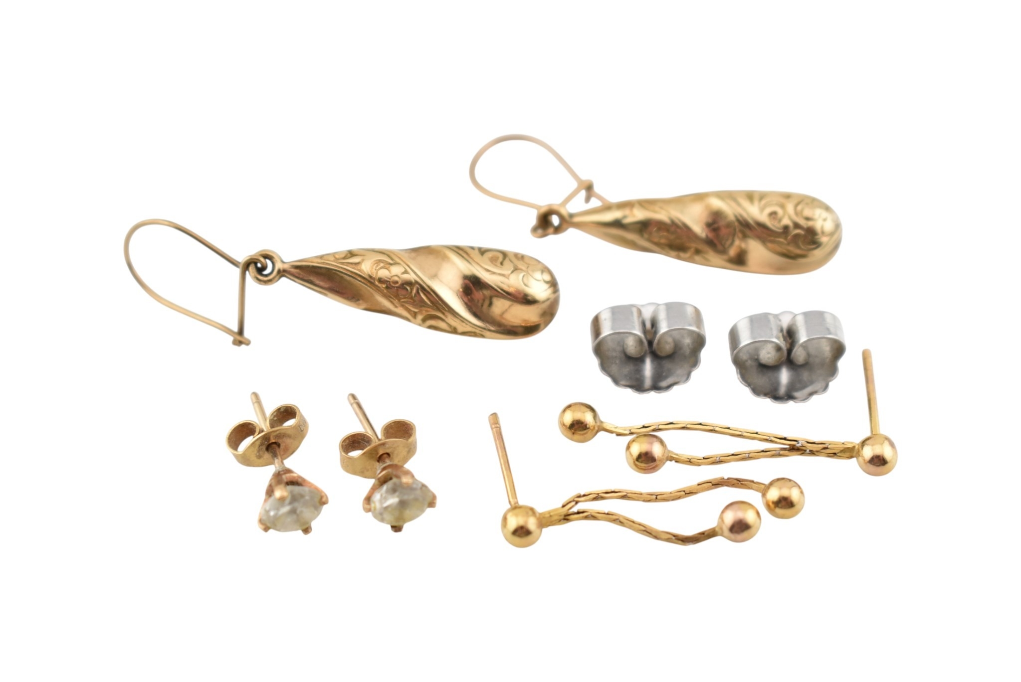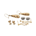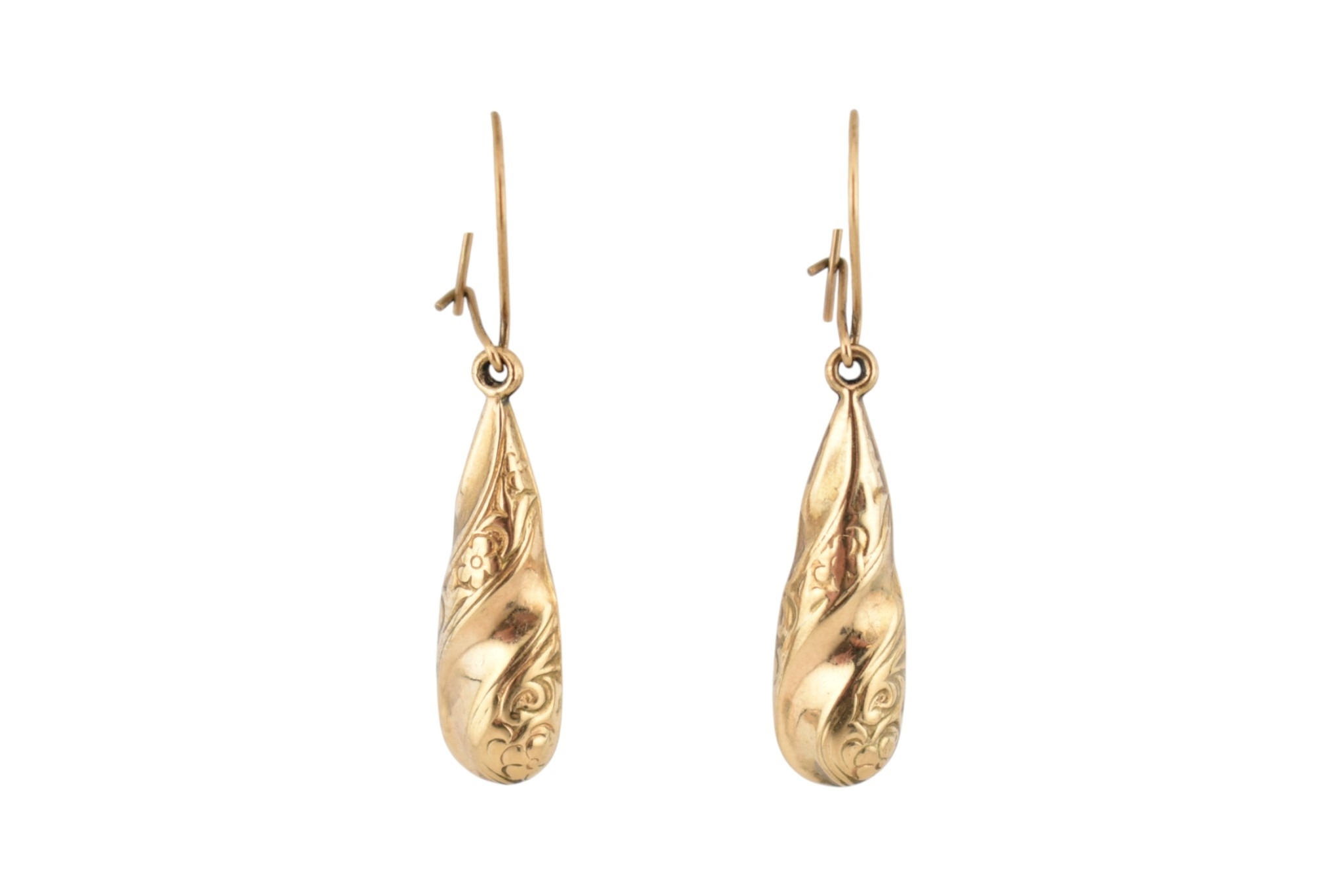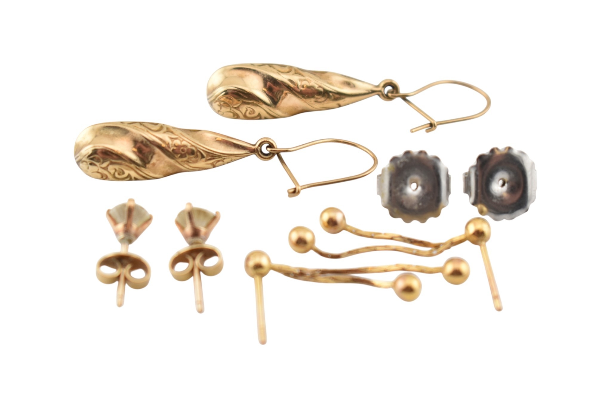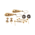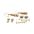 Three pairs of yellow metal pendant earrings. Unmarked, tests indicate 9ct gold. Weight 3.5g.