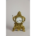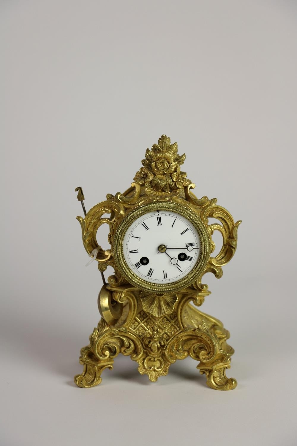 A 19th Century French ormolu Boudoir Clock, in the rococo style with enamel dial and Roman numerals, raised on scroll legs, 9" (23cms). (1)