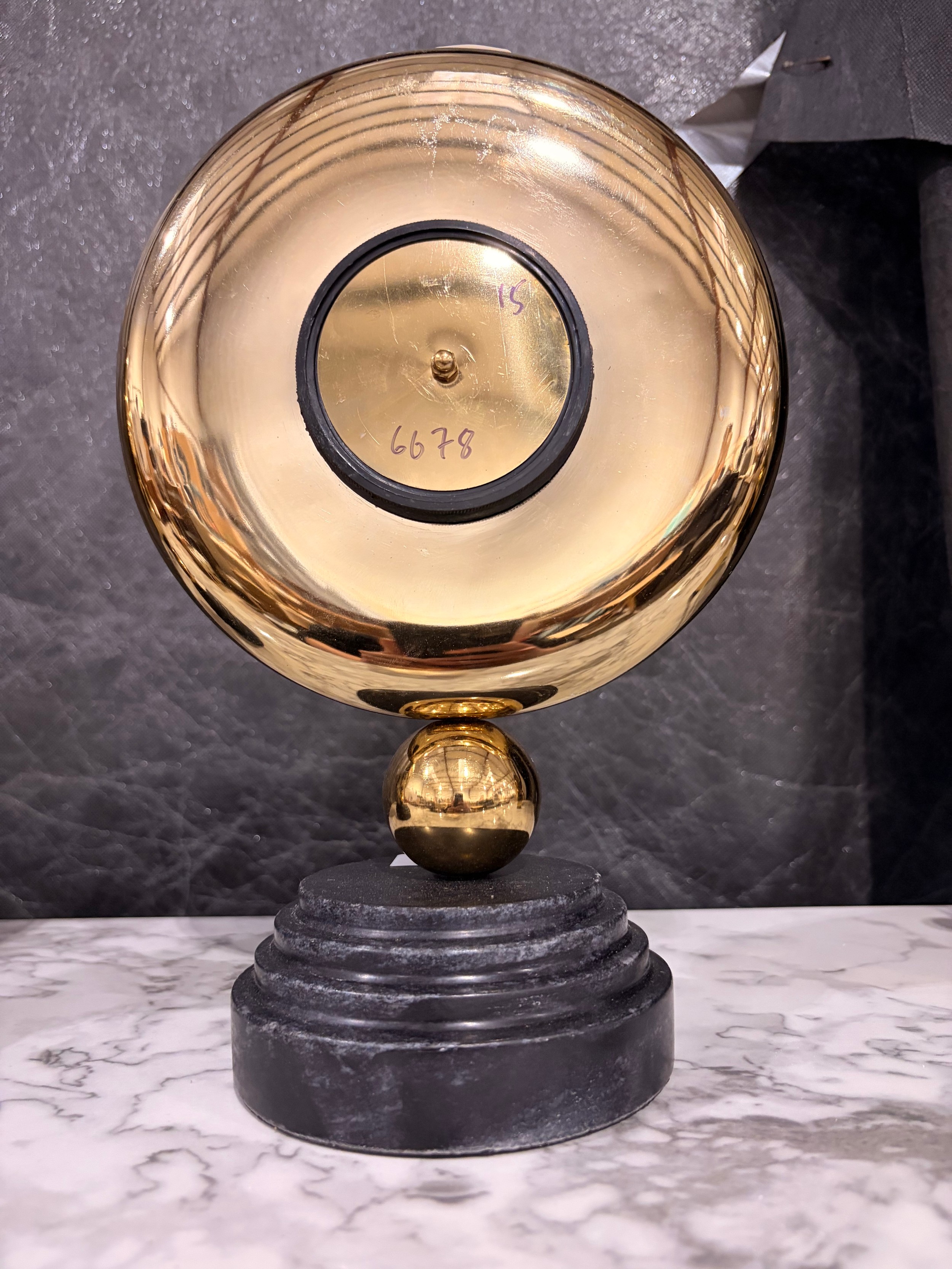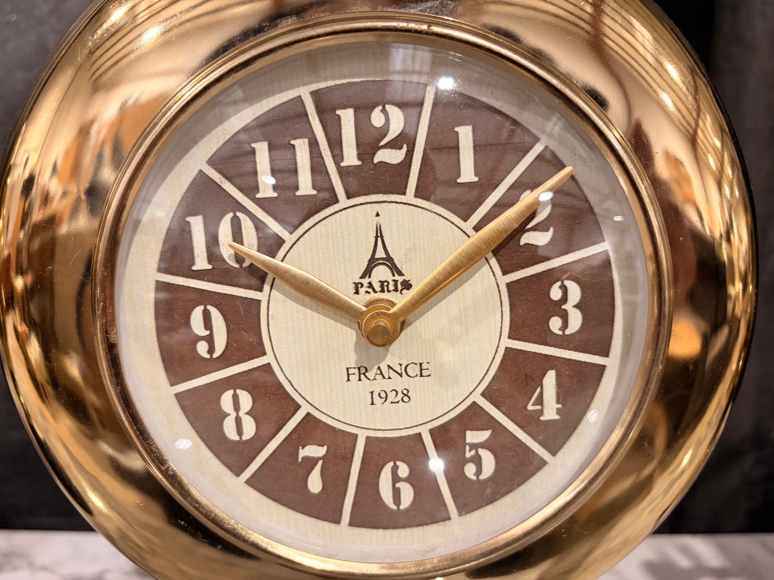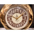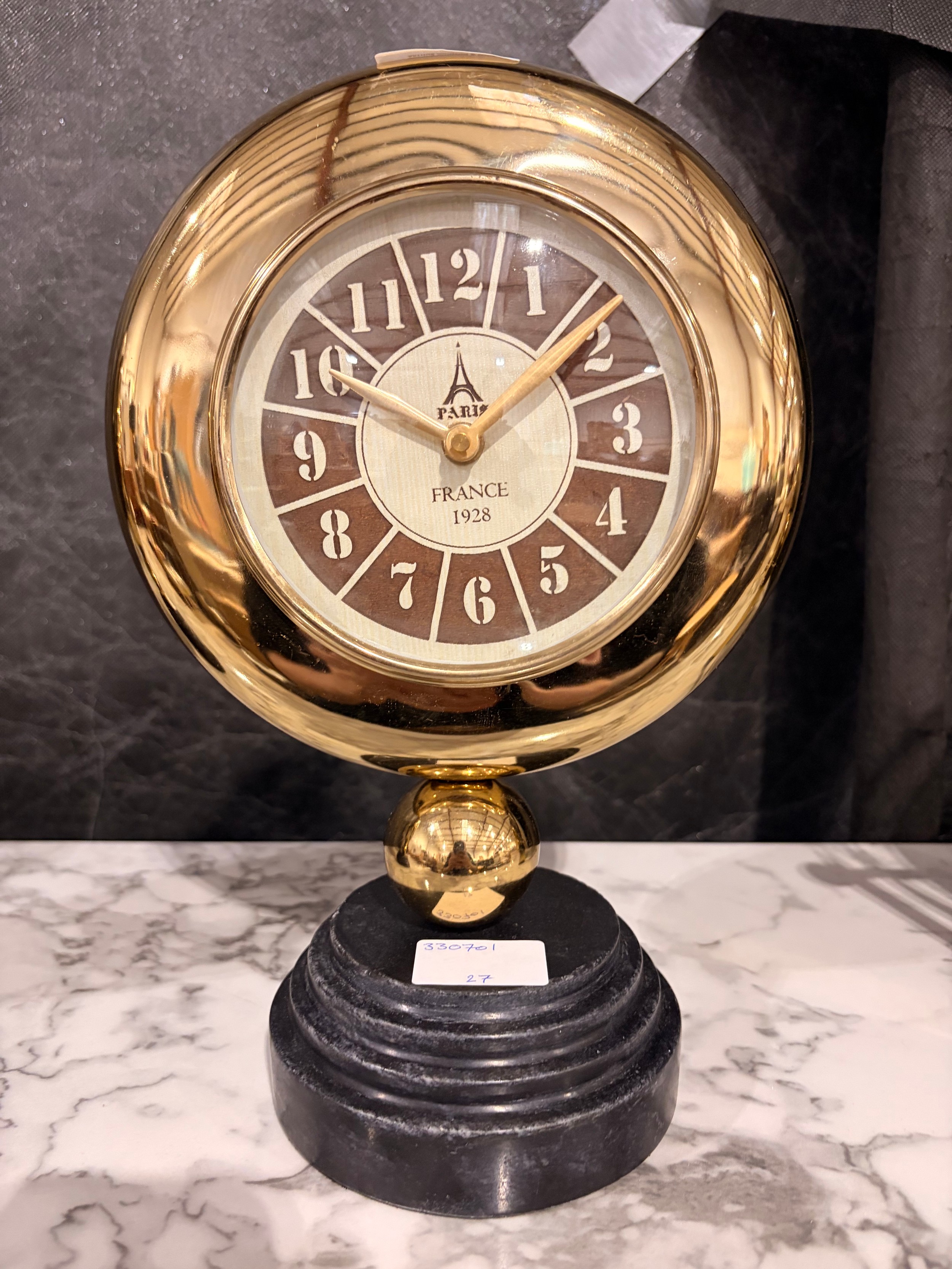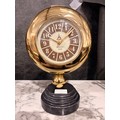 A Minster gold effect mantle clock on a circular black marble base