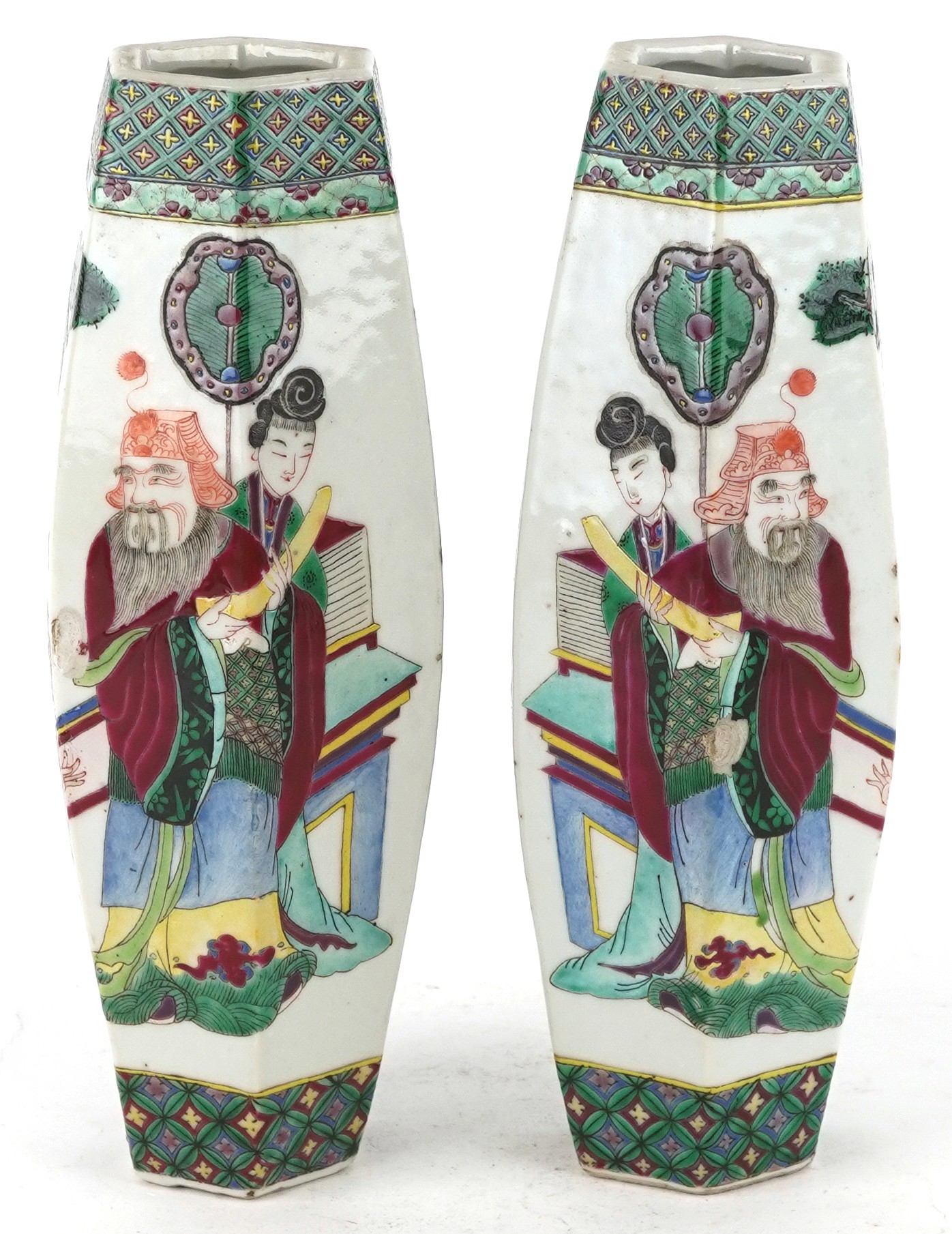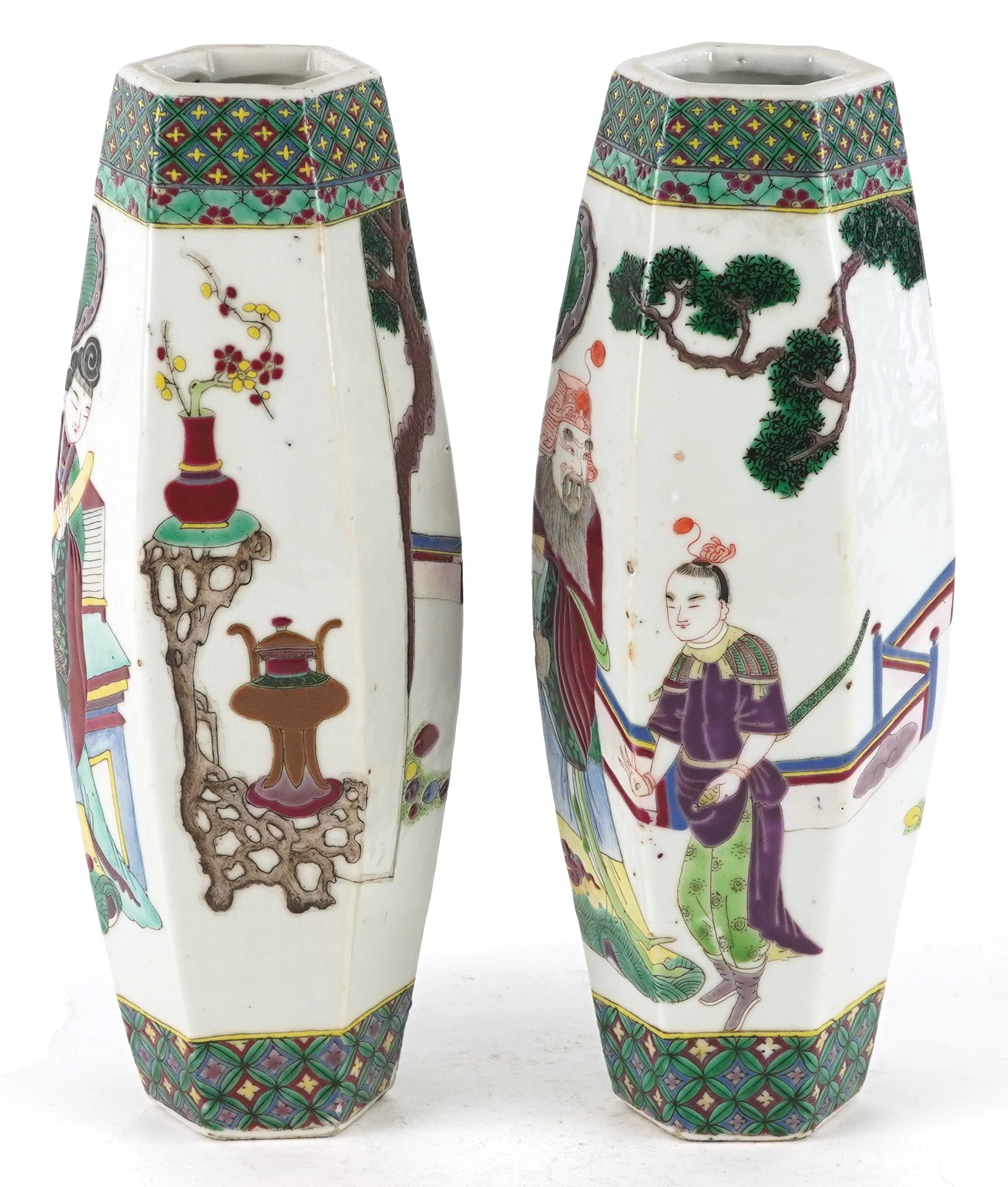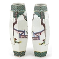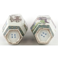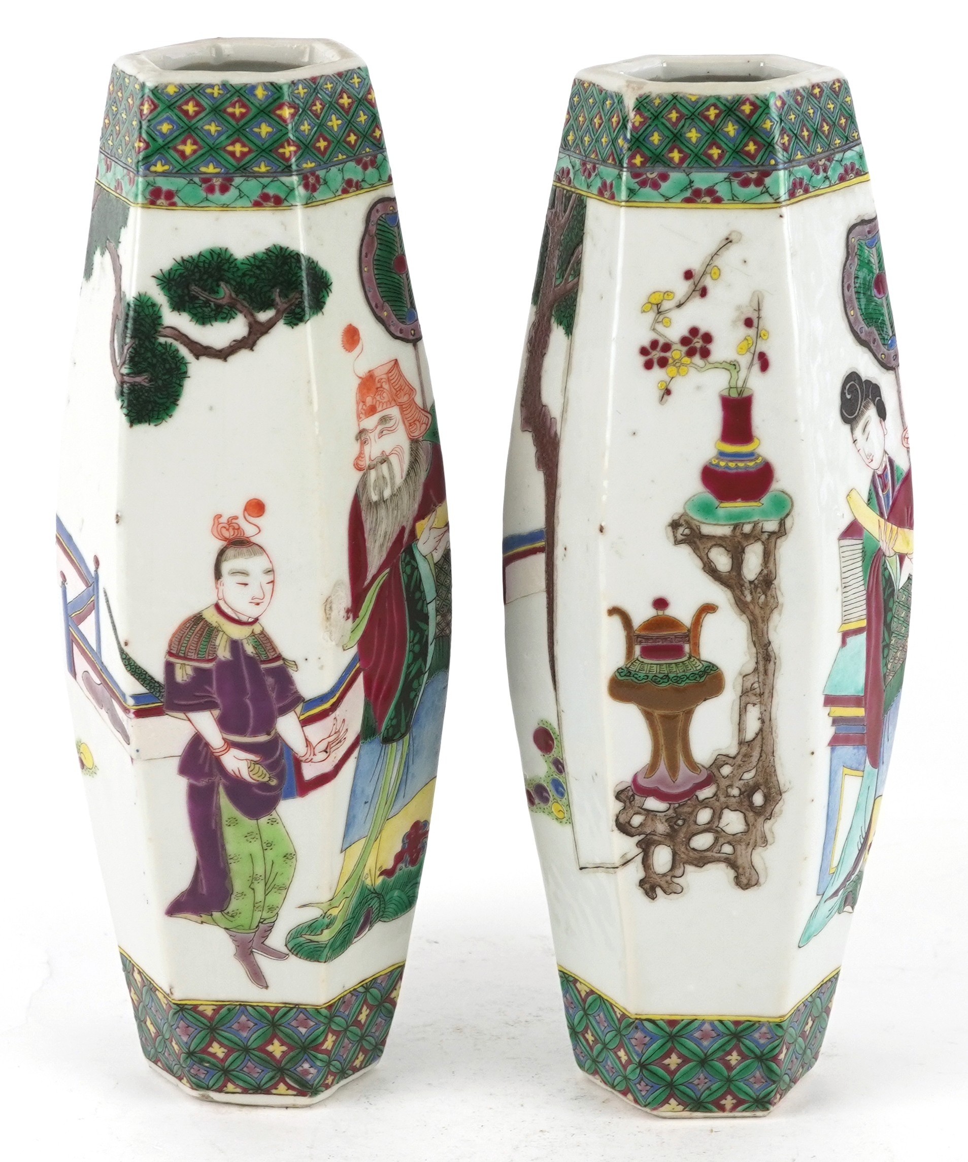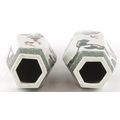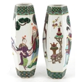 A pair of Chinese porcelain hexagonal vases hand painted with an emperor and attendants, four figure character marks to the base, 26cm high.