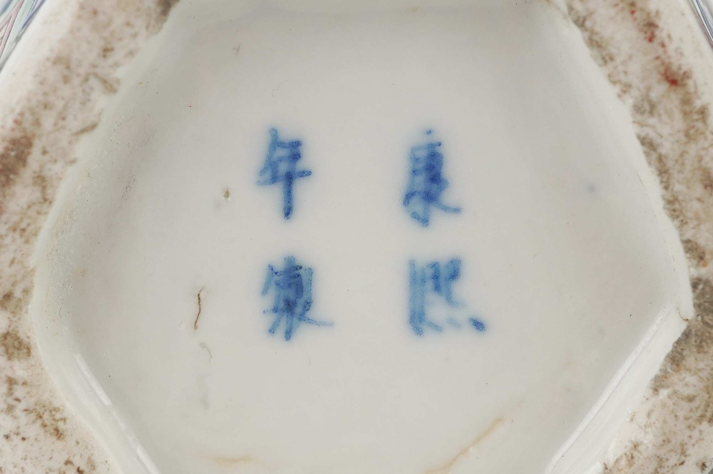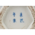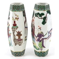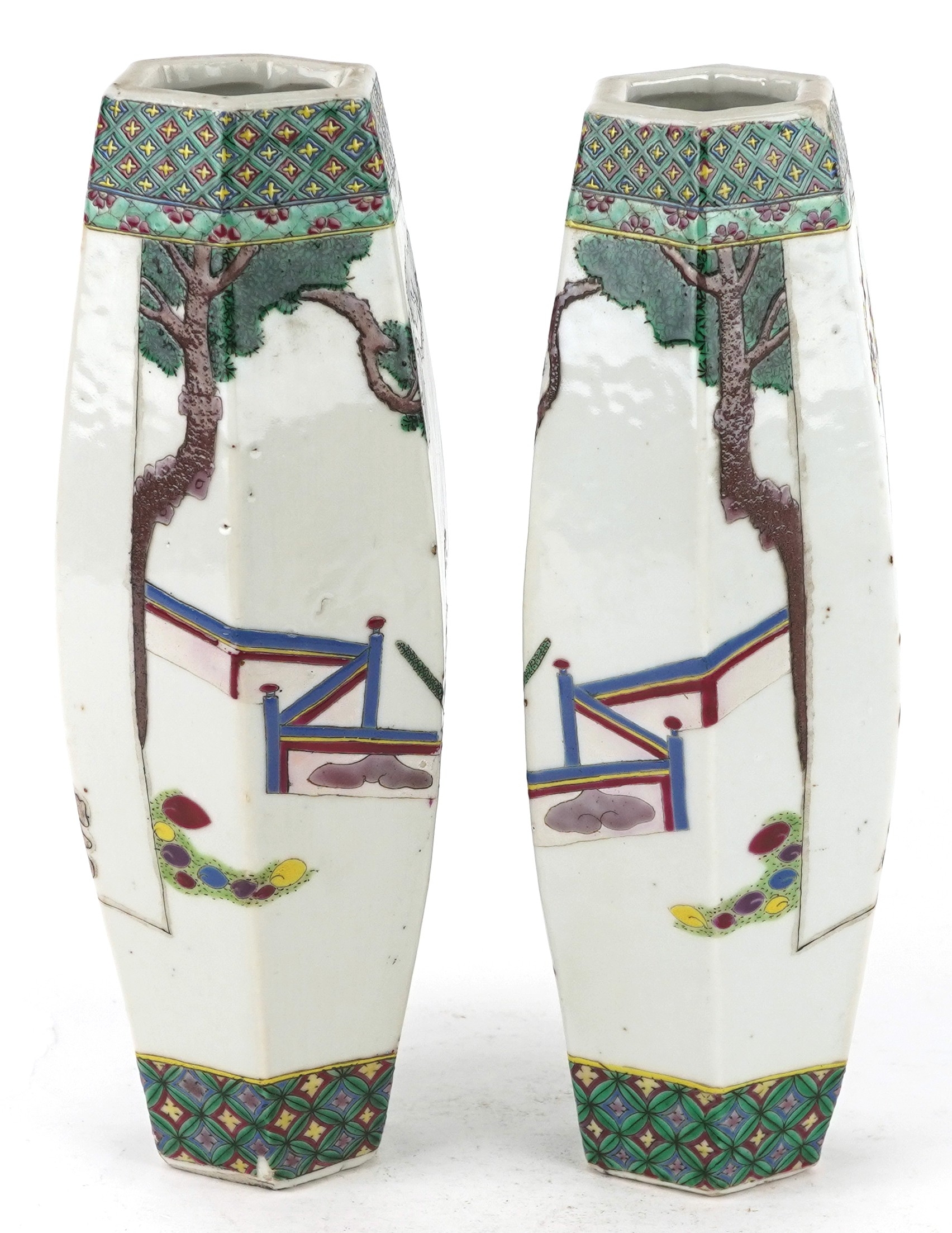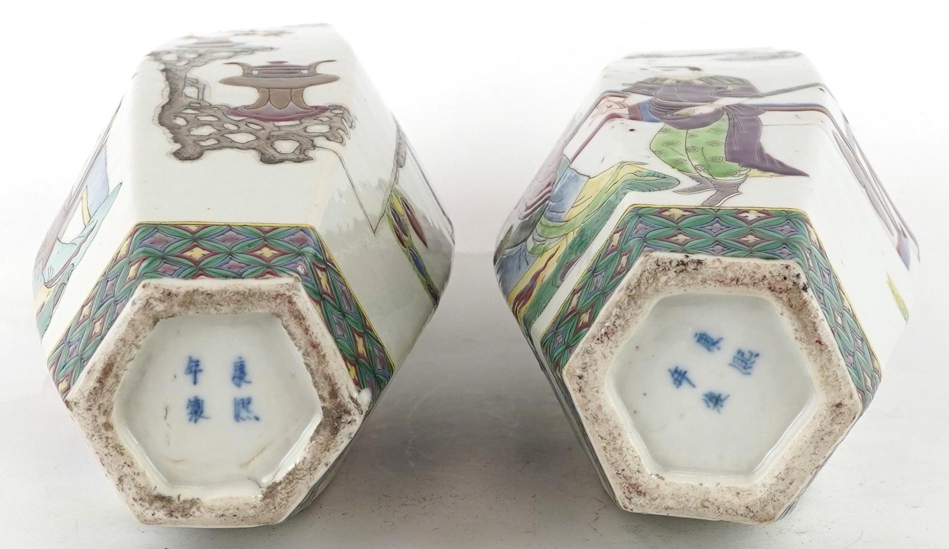 A pair of Chinese porcelain hexagonal vases hand painted with an emperor and attendants, four figure character marks to the base, 26cm high.