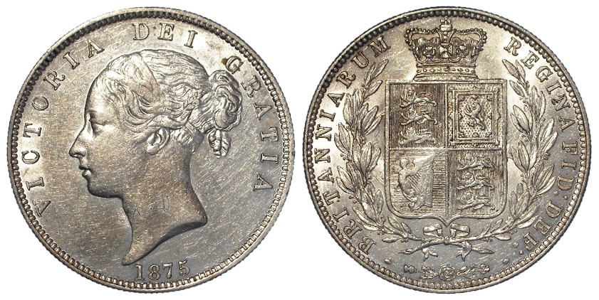 Halfcrown 1875 aEF, small graffiti initials on neck.