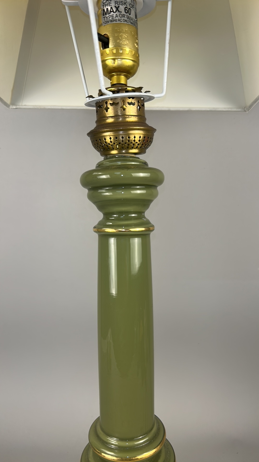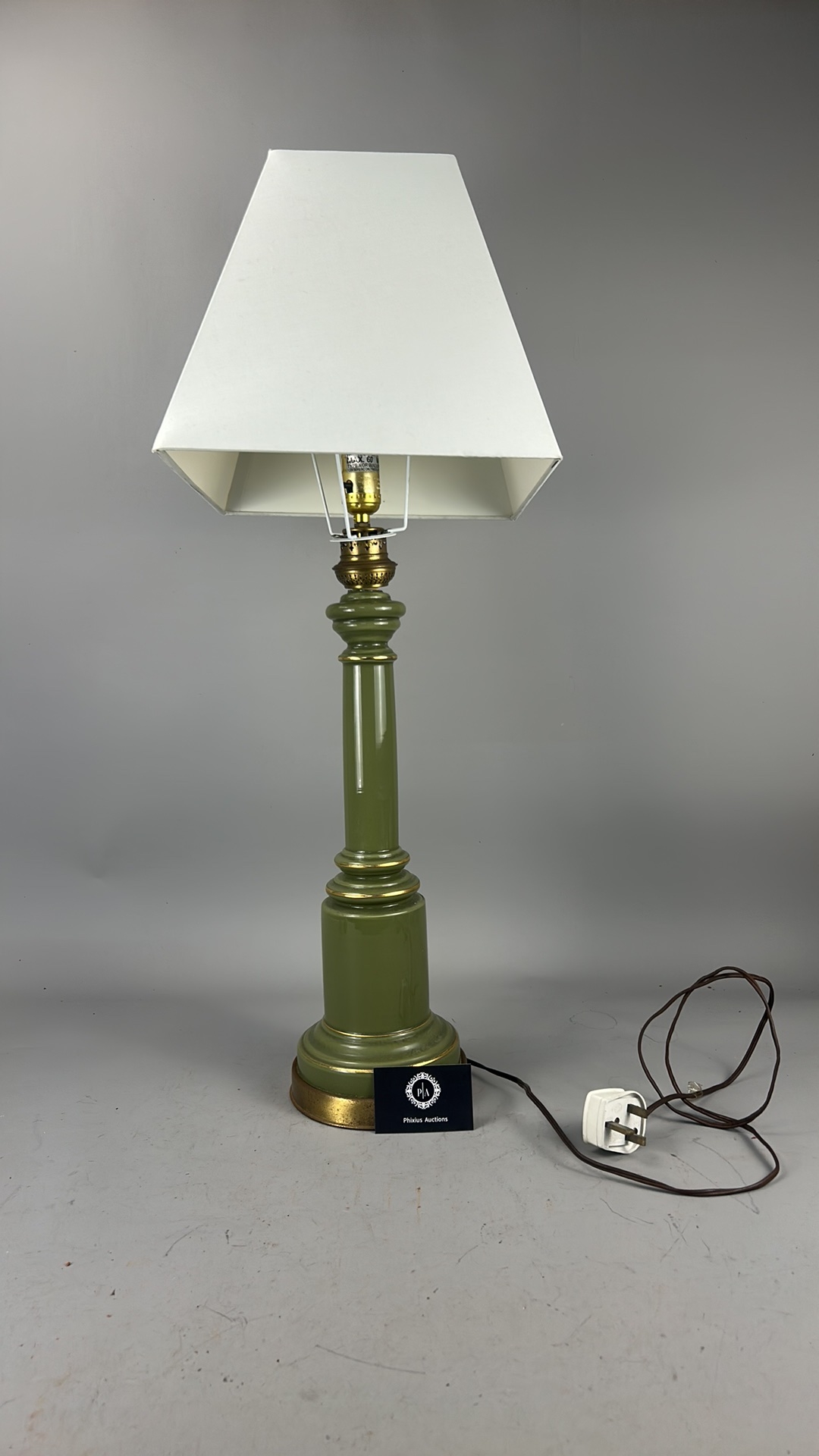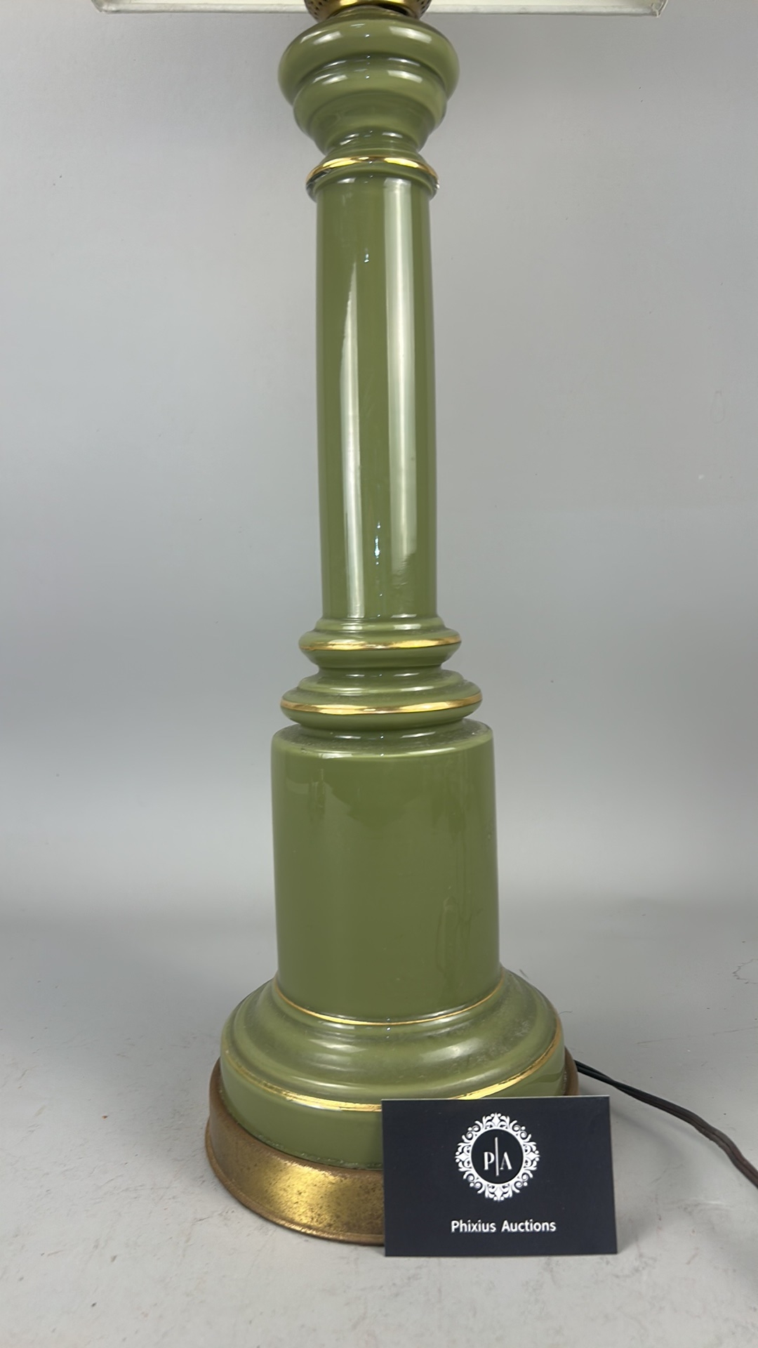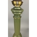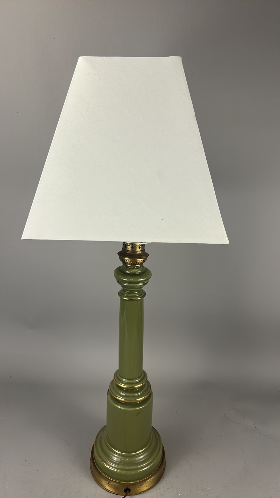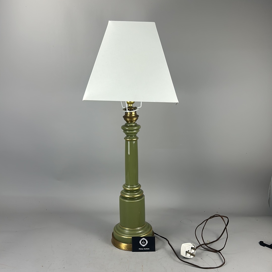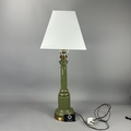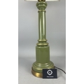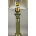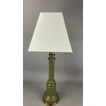 Olive green glass columnar table lamp with gilt metal mounts and square cream fabric shade, wired for electricity.