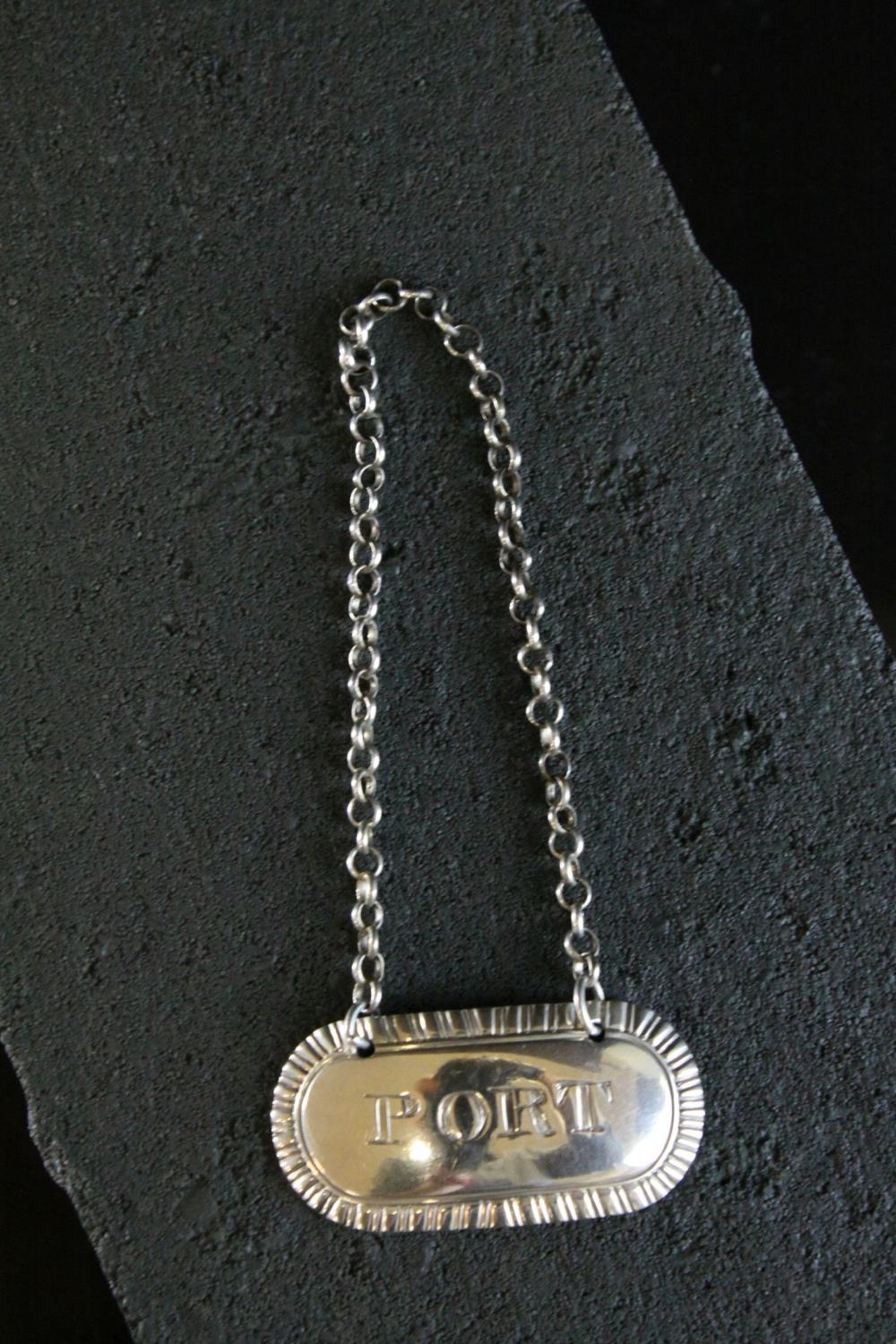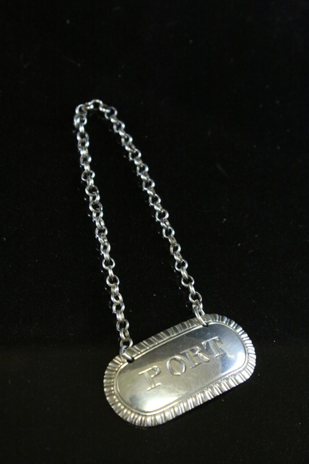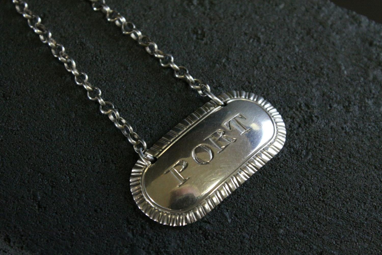 A fully hallmarked George III sterling silver Port decanter label, maker marked for Samuel Knight with a date letter for 1815.