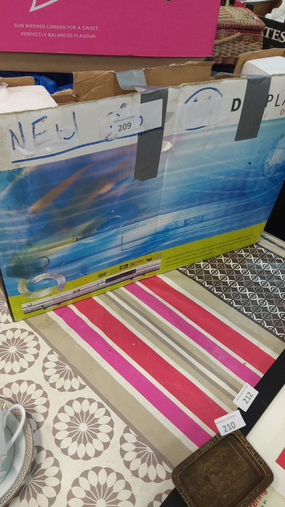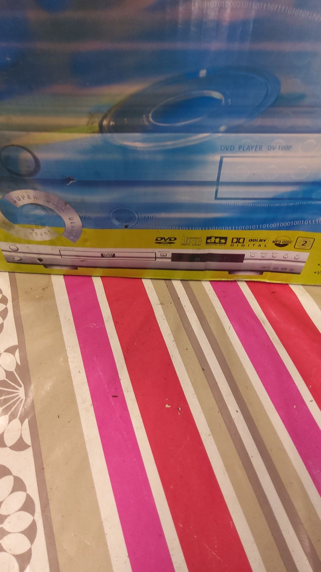 Boxed DVD Player DV-100P features Dolby Digital, DTS support, and Super Slim design. It is in new condition with original packaging.