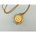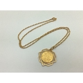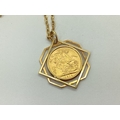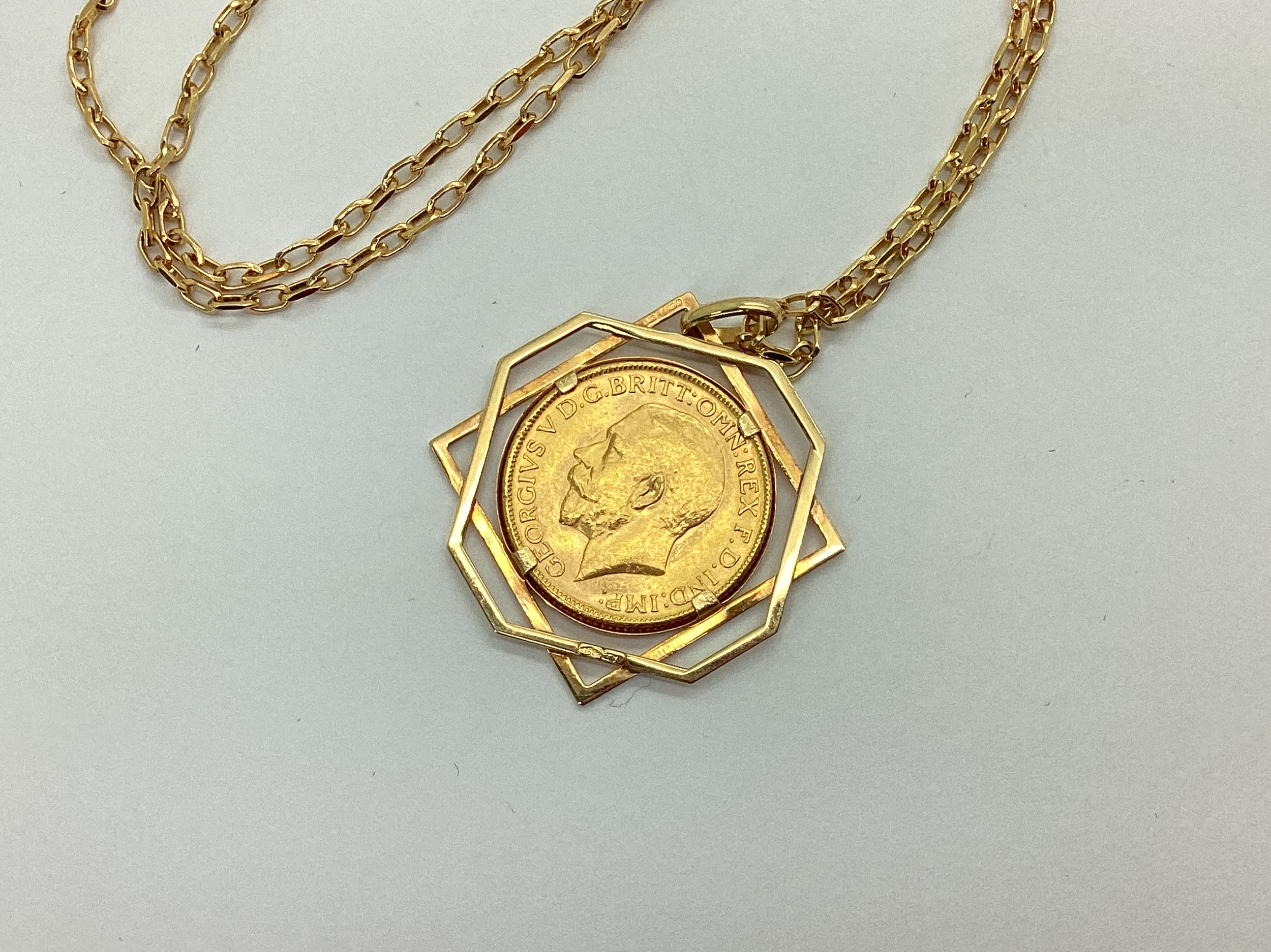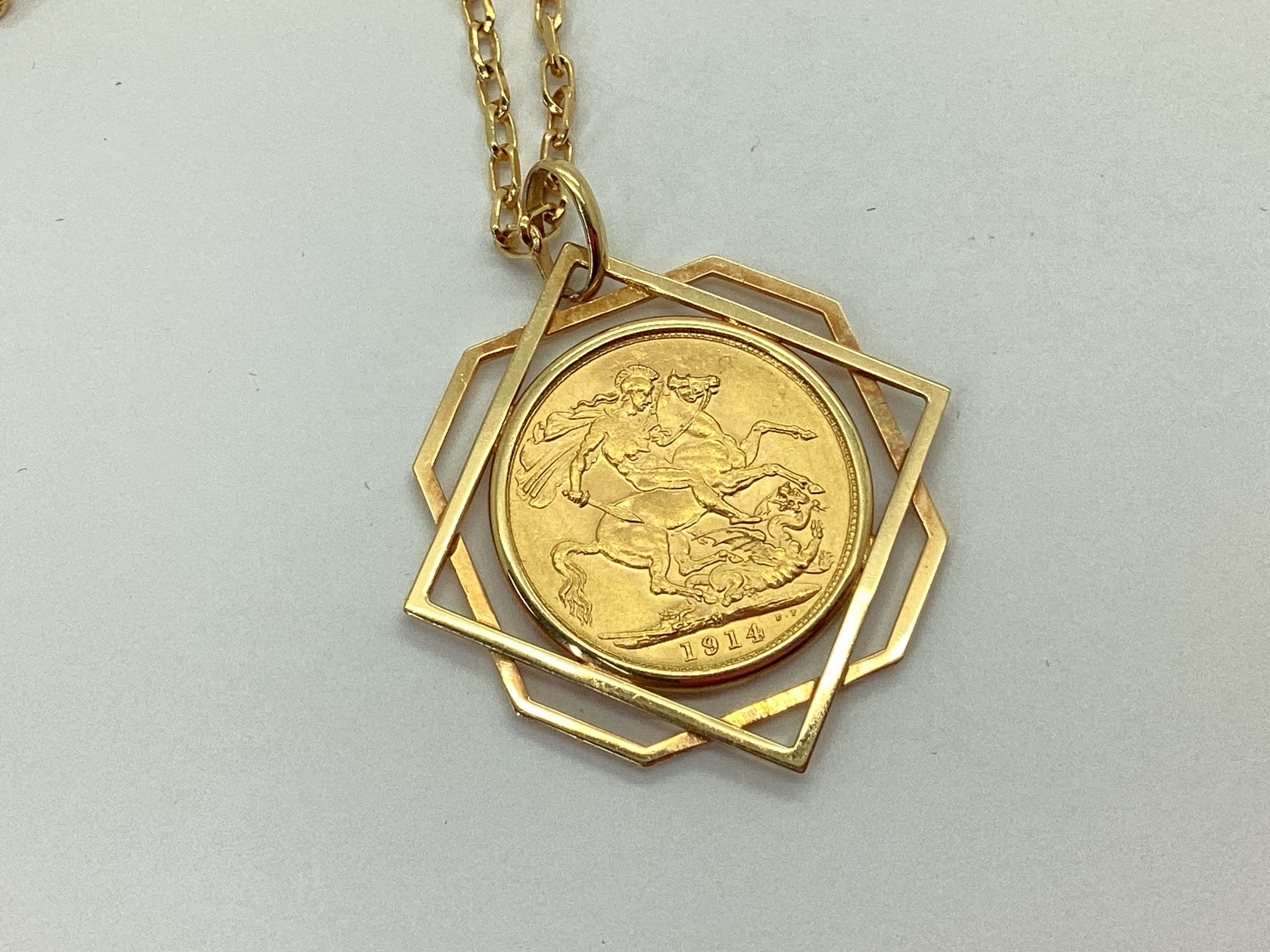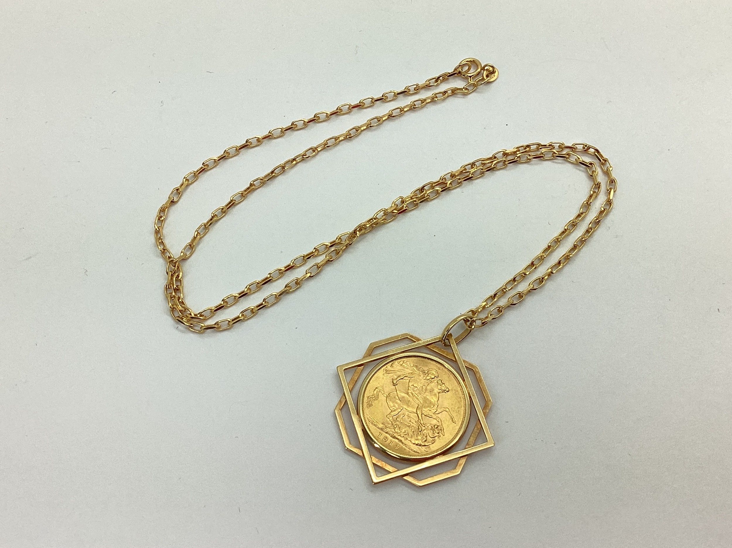 A George V Full Sovereign, 1914, loose set within a geometric openwork mount, stamped "375", on a fancy oval link chain, stamped "375".