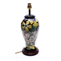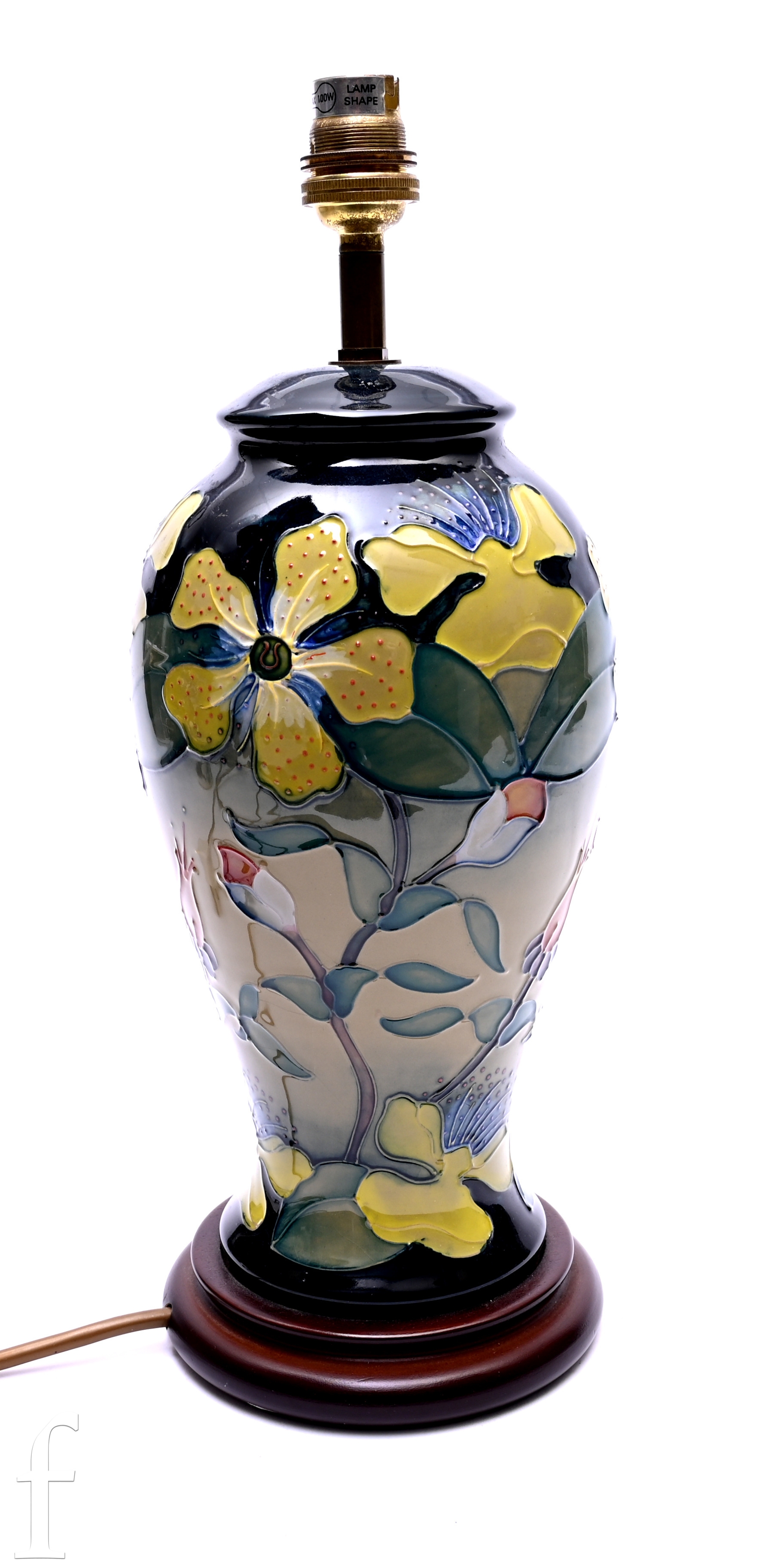 Rachel Bishop for Moorcroft Pottery, a Hypericum pattern lamp base, circa 1994, of shouldered form, tube line decorated with yellow flower heads and buds on meandering leafy stems over graded blue to olive ground, height 29cm (excluding fittings), with matching shade.