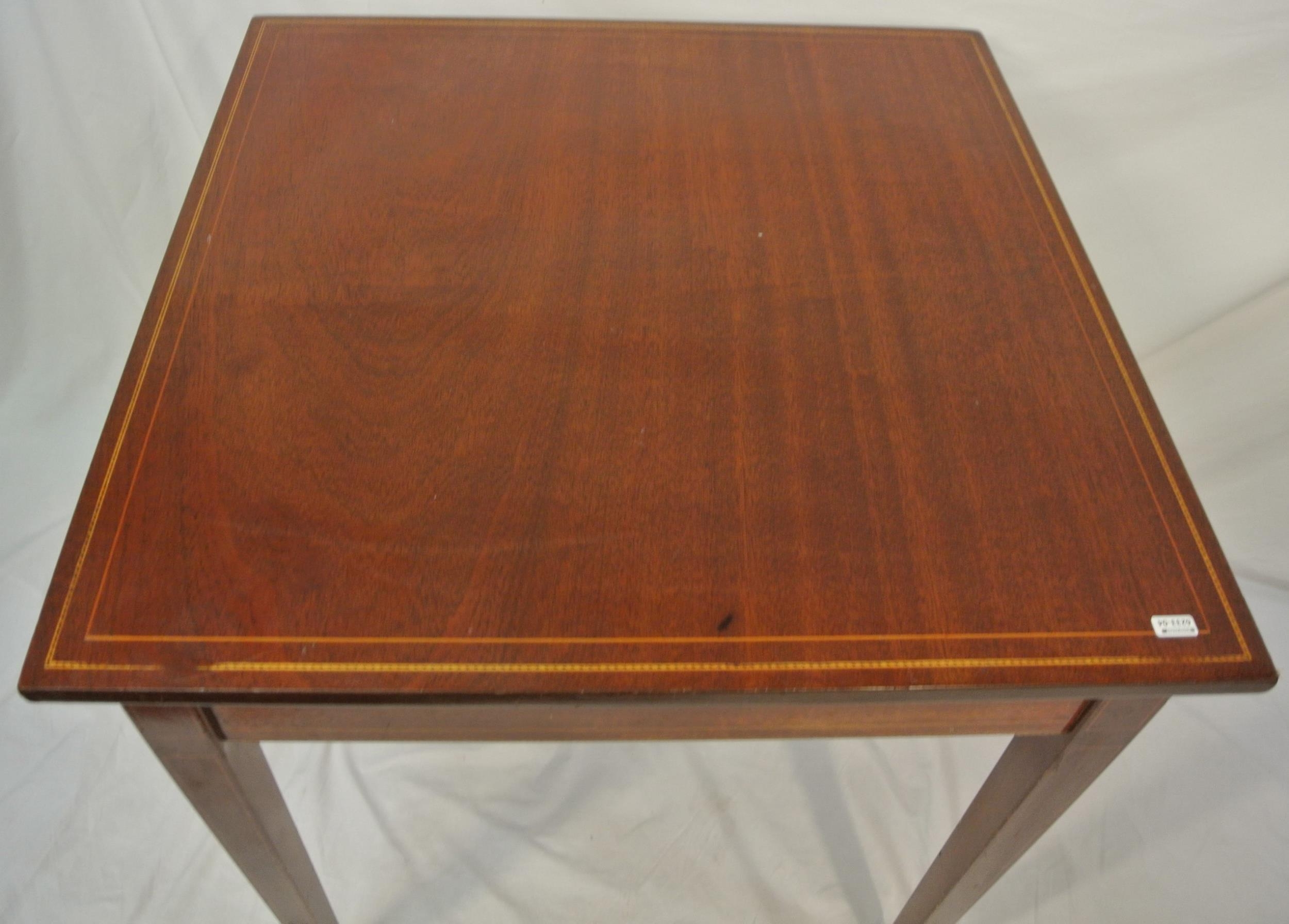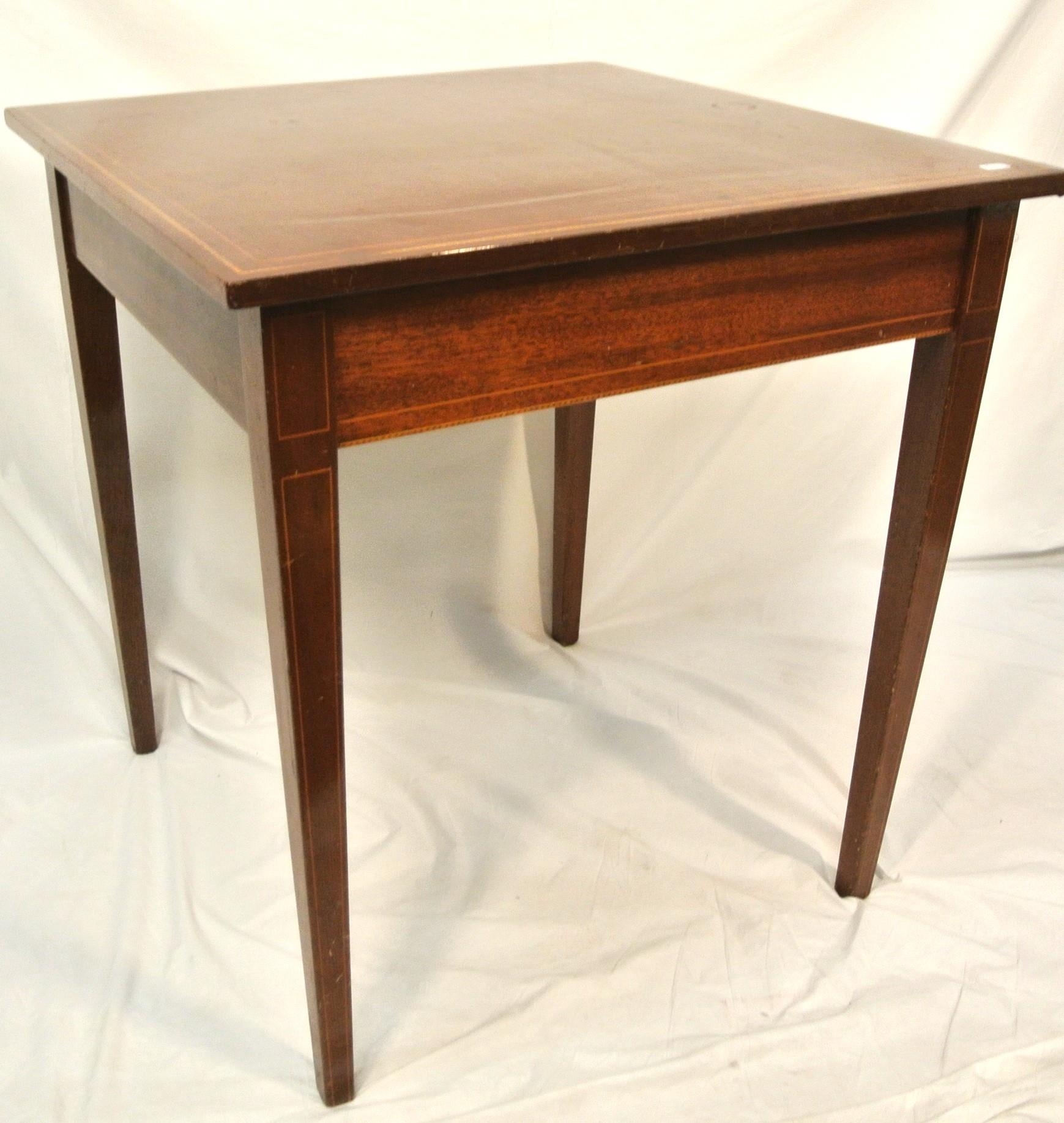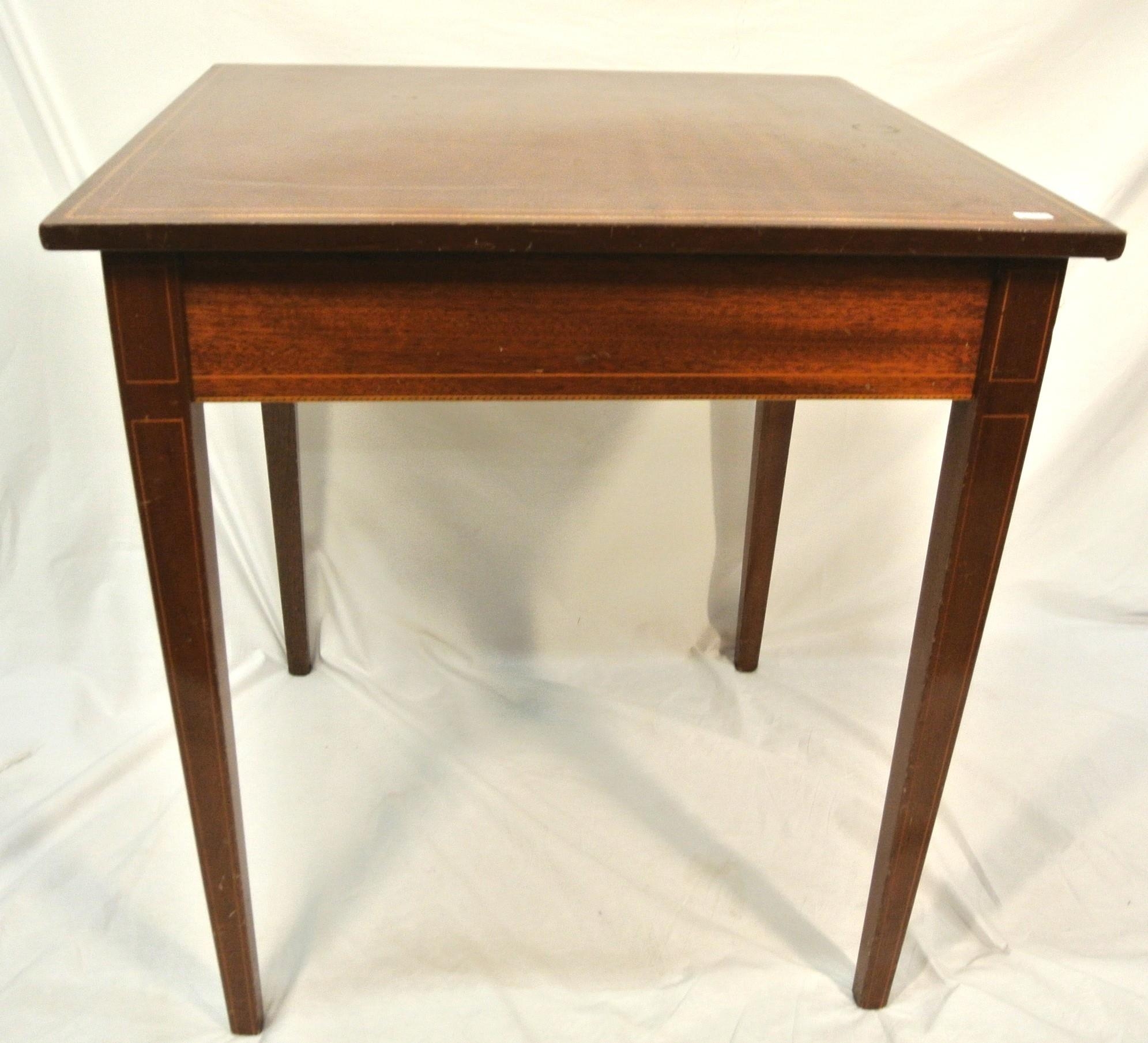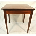 Edwardian inlaid mahogany square occasional table with herringbone inlay, on square tapering legs