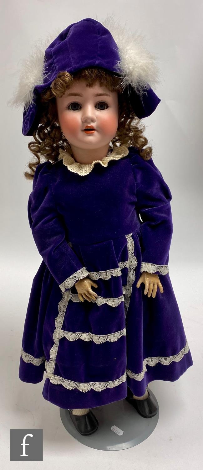 A Schoneau and Hoffmeister bisque socket head doll, head mould 914, with sleeping blue eyes with eyelashes, open mouth with teeth, painted features and later brunette wig, with composition and wood ball jointed body, height 65cm, head impressed Made in Germany S*PB*H 914 12, with doll stand and display case, S/D to fingers.