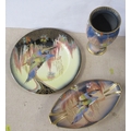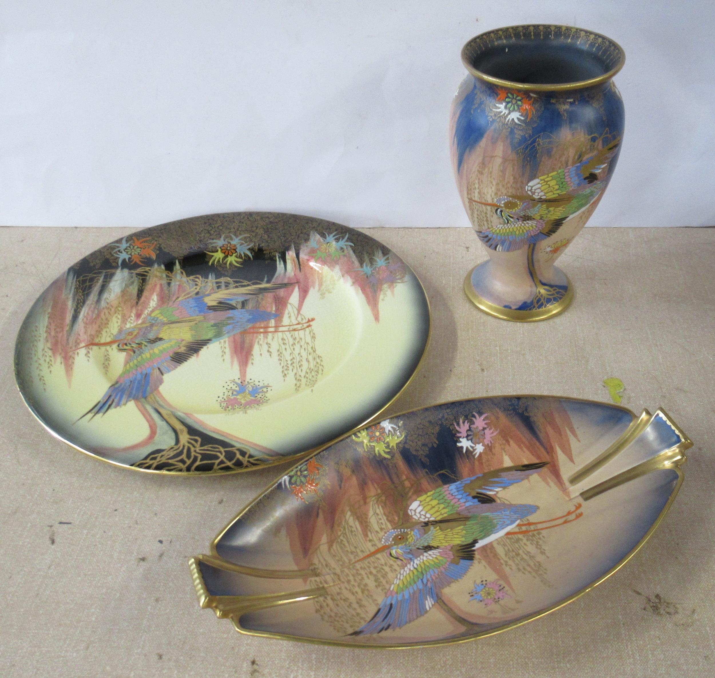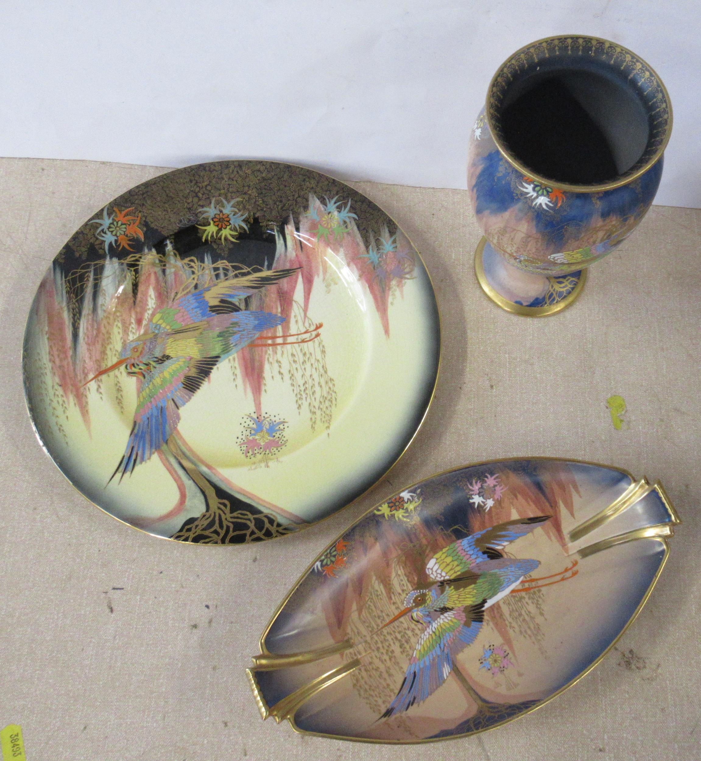 A Carlton Ware dish, plate and a vase, all decorated in the Sketching Bird pattern