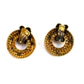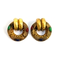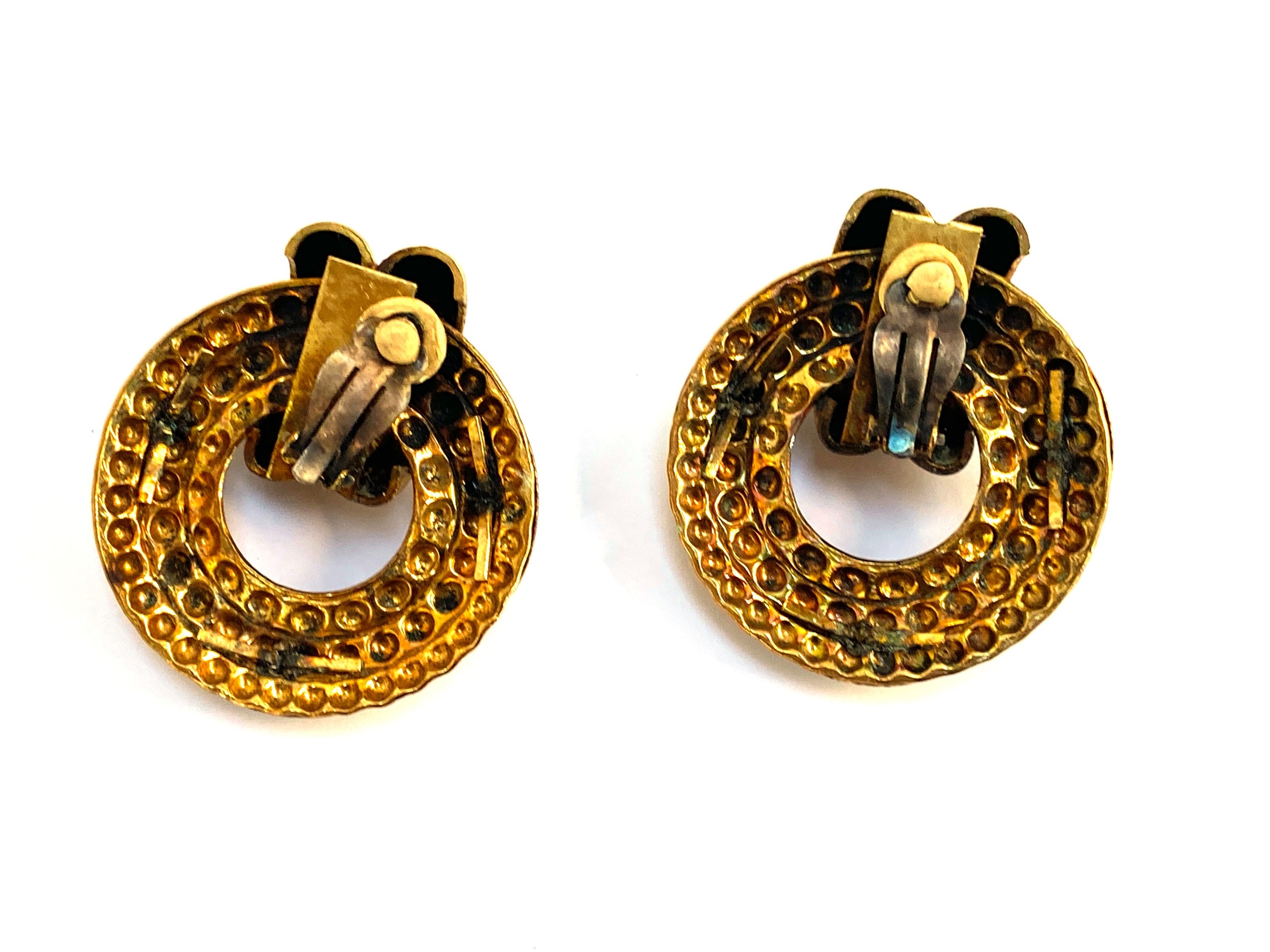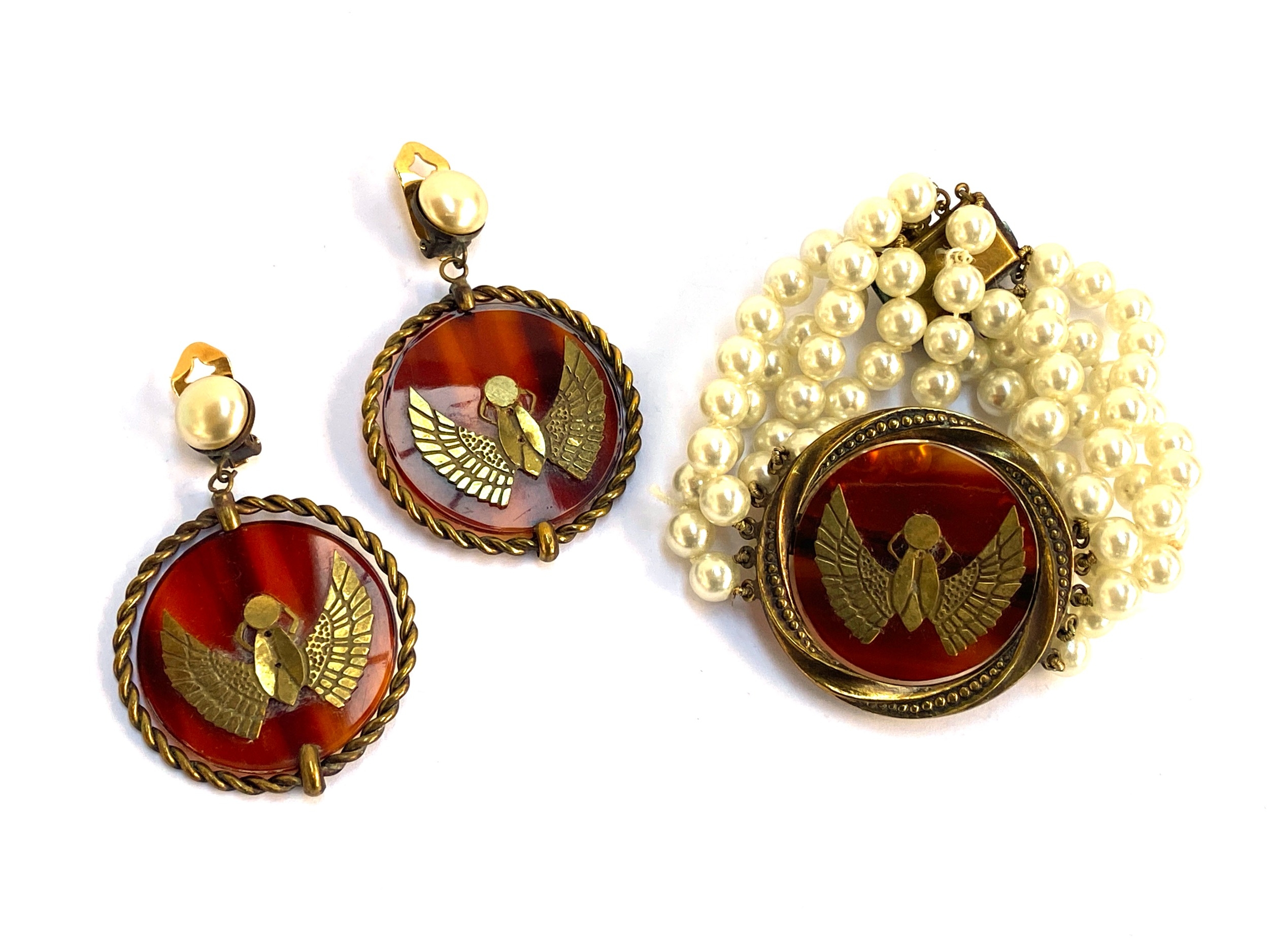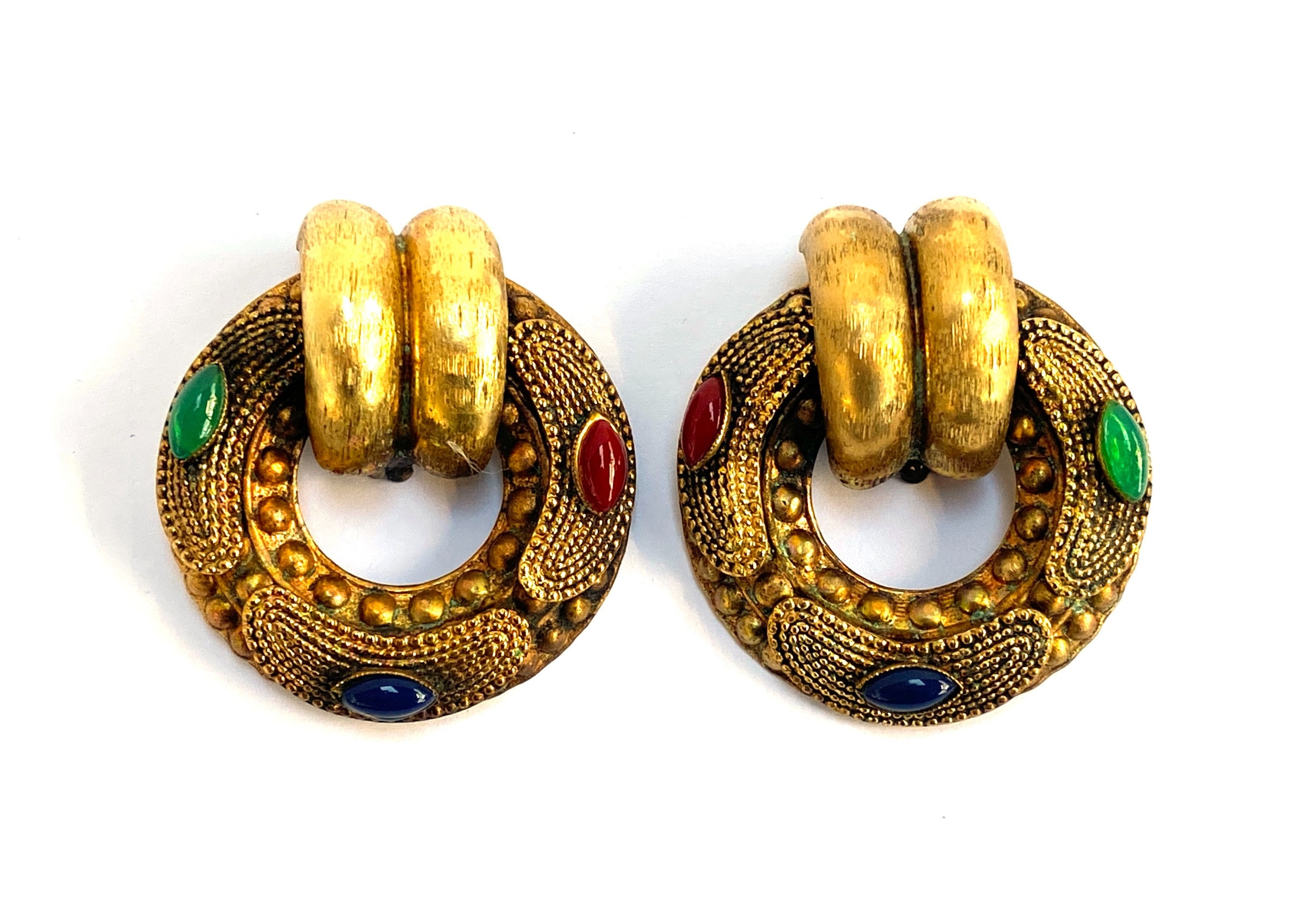 A pair of vintage gold tone clip on earrings, granulated design with marquise shaped red, blue and green cabochons, 5cmD; together with a pair of gilt metal earrings with faux tortoiseshell plastic medallion and applied brass Egyptian scarab beetle design, 4.5cmD, together with a matching faux pearl bracelet