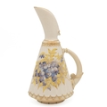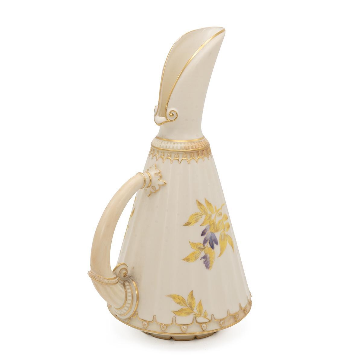 Royal Worcester early 20th century blush ivory ewer hand painted with wisteria and parcel gilt, unsigned in the manner of Raby. Good Royal Worcester marks to base including model number 1361 and registered design number 119478 (listed 1889). Height 25.5cm.