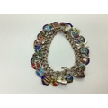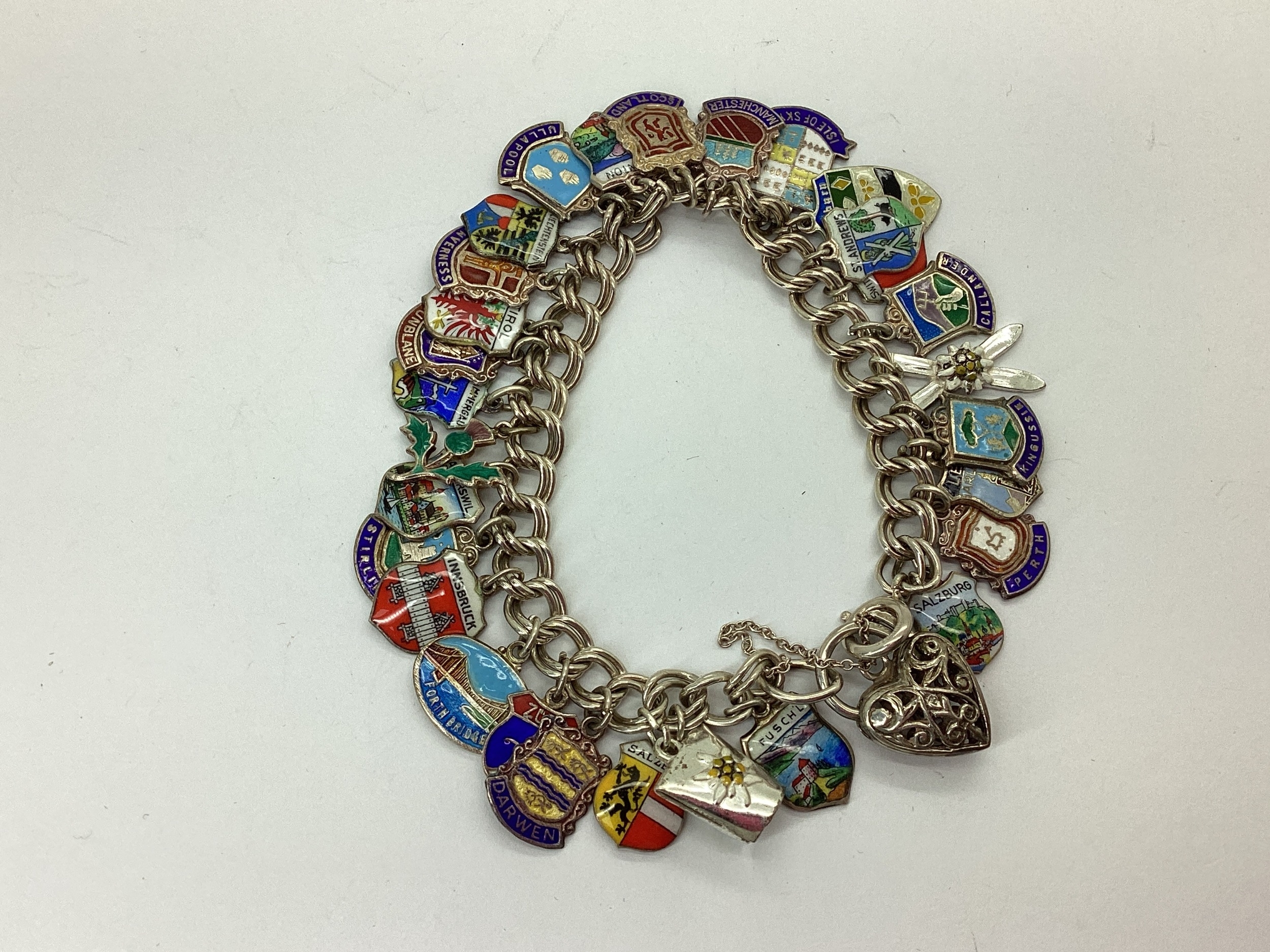 A Double Curb Link Charm Bracelet, to openwork heart shape padlock style clasp, suspending numerous assorted enamel souvenir shield charms. [937588]