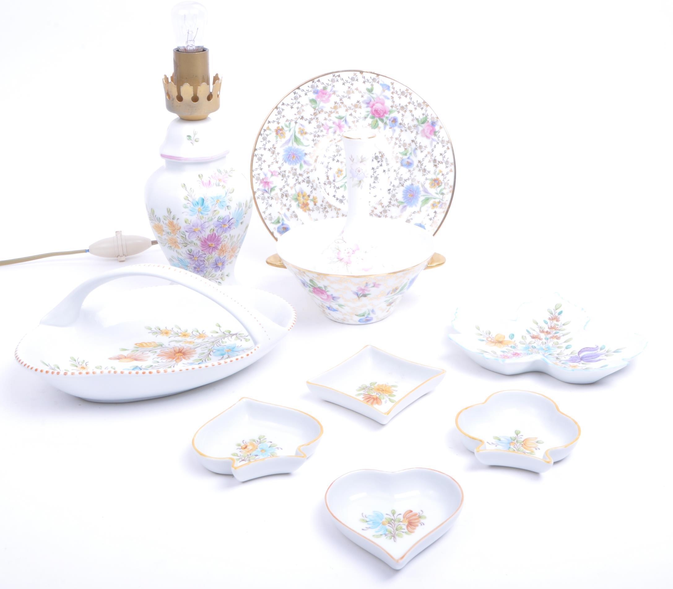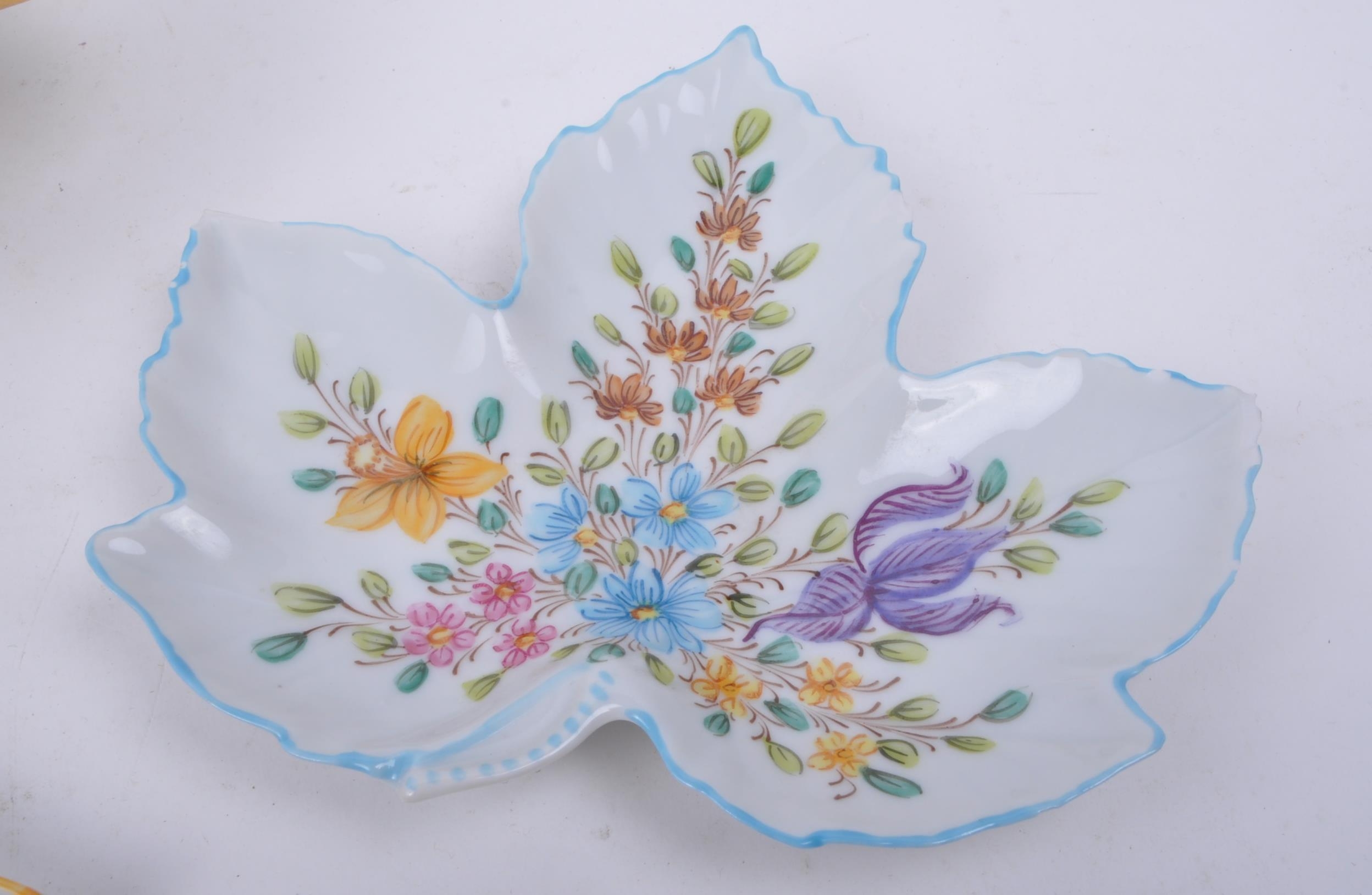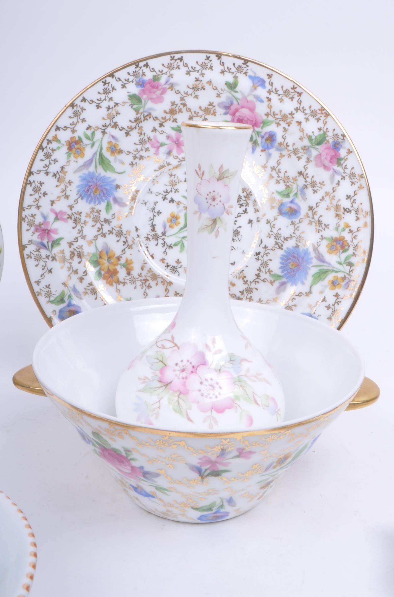 Collection of French vintage 20th century Limoges porcelain pieces. Comprised of a Maryvonne Le Gaillard Limoges sweet dish, a Maryvonne Le Gaillard lamp base, a Queensway vase, a Limoges leaf shaped trinket dish, four Limoges trinket / pin dishes, a Limoges gilt floral twin handled tea cup and matching saucer. All with makers marks printed to the underside of each piece.