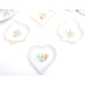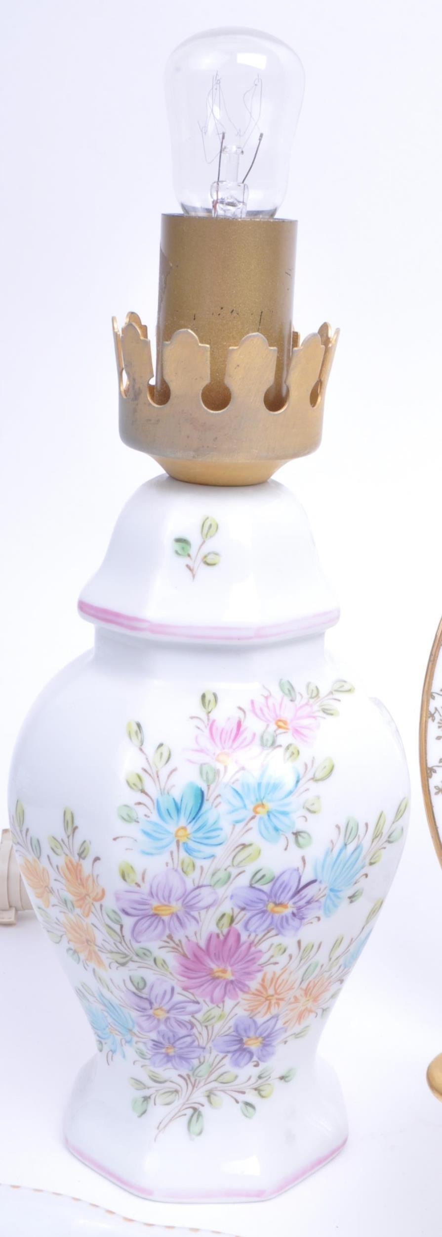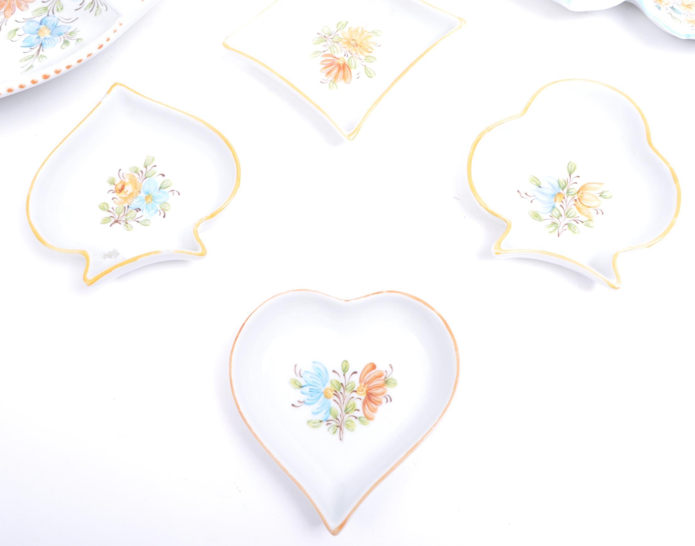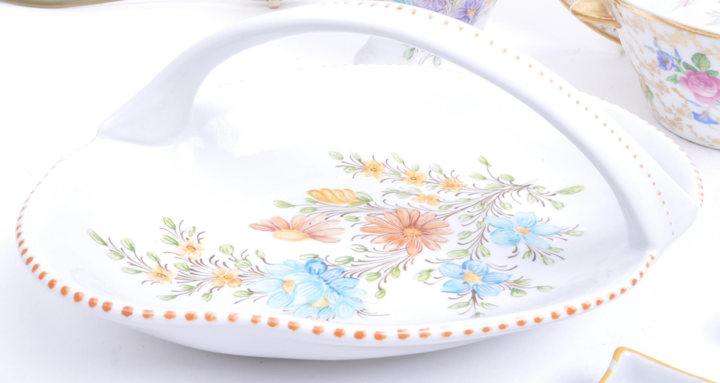 Collection of French vintage 20th century Limoges porcelain pieces. Comprised of a Maryvonne Le Gaillard Limoges sweet dish, a Maryvonne Le Gaillard lamp base, a Queensway vase, a Limoges leaf shaped trinket dish, four Limoges trinket / pin dishes, a Limoges gilt floral twin handled tea cup and matching saucer. All with makers marks printed to the underside of each piece.