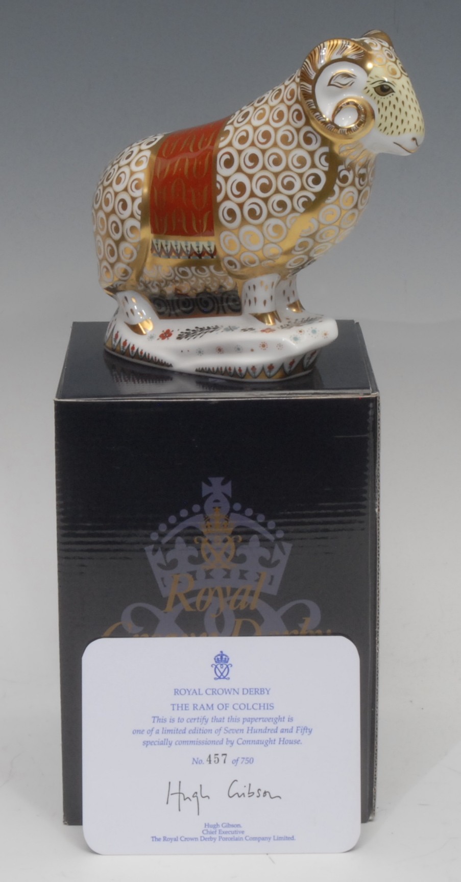 A Royal Crown Derby paperweight, The Ram Of Colchis, specially commissioned by Connaught House, designed by Tien Manh Dinh, limited edition 457/750, gold stopper, 14cm, printed marks in gold, certificate, boxed