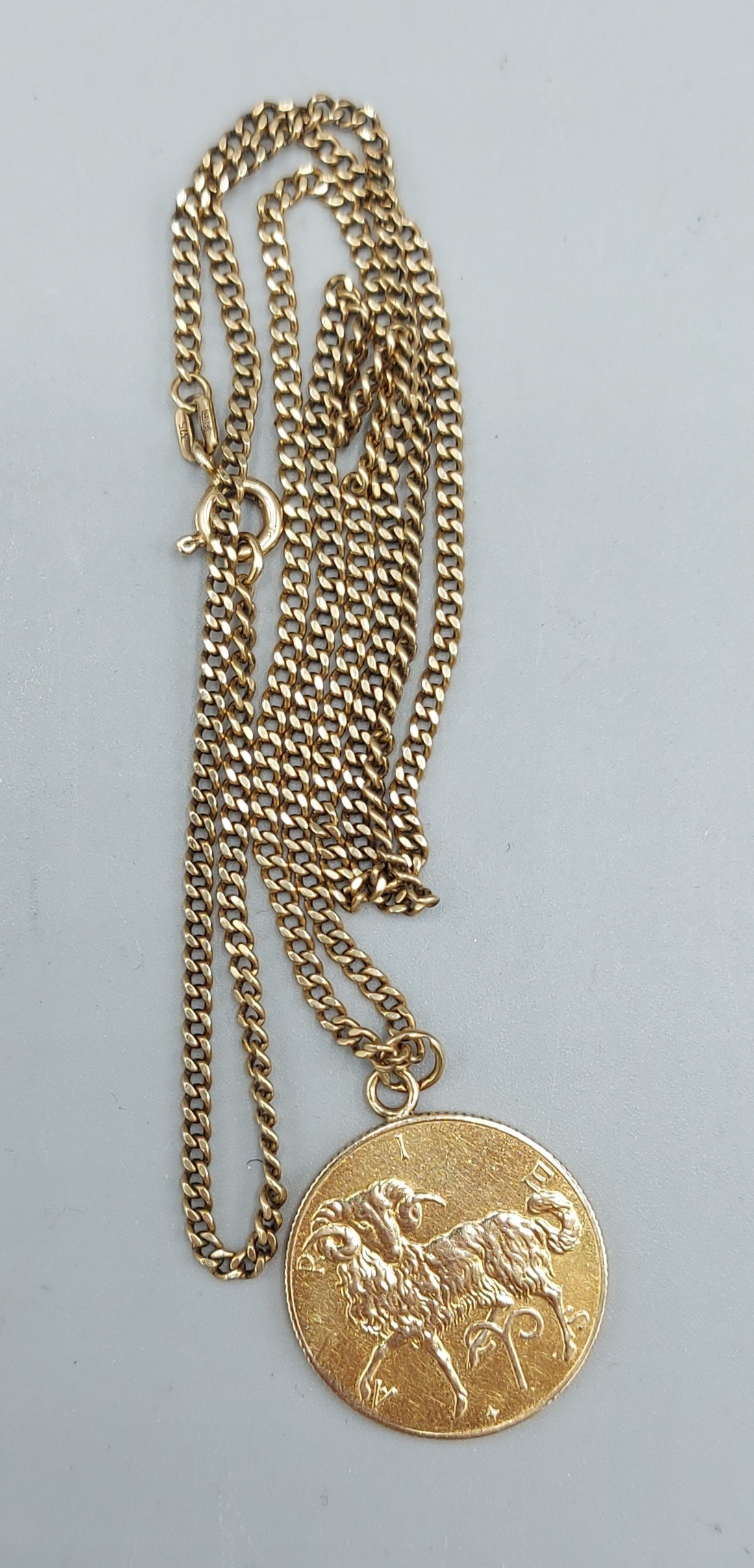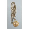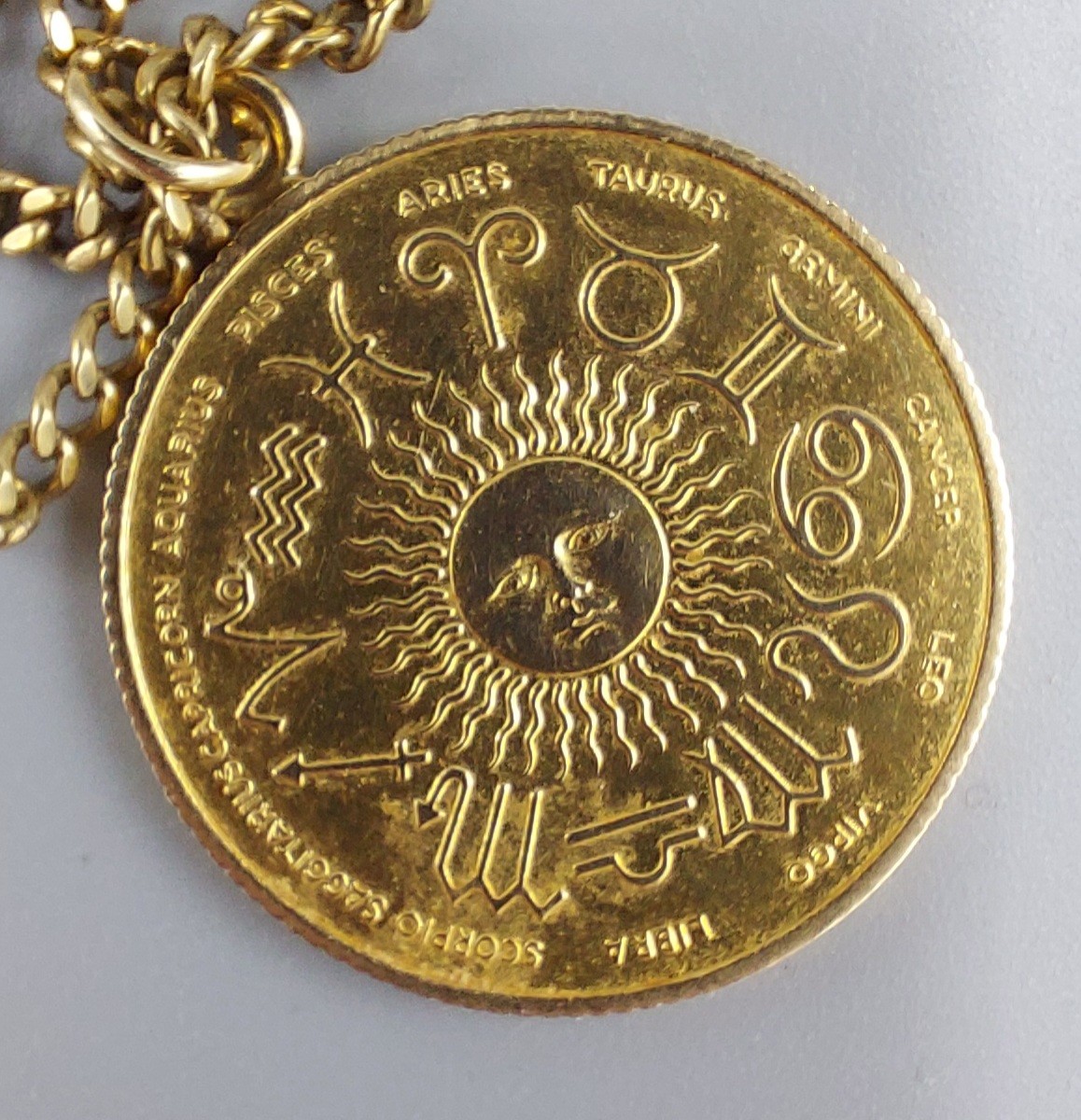 A 9ct gold pendant, signs of the Zodiac together with a 9ct gold linked chain, 11.2gms
