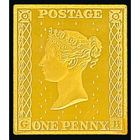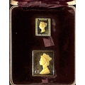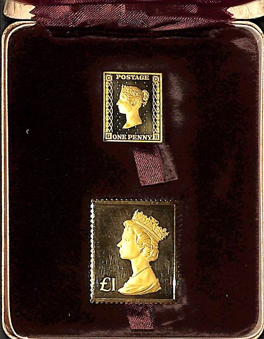 1973 22k Gold replicas of the 1d Black and £1 Machin, London 1973 hallmarks, struck at the Royal Mint on behalf of Hallmark Replicas, number 1369 of an edition of 3,000, in a box, the two 22k gold replicas with a combined weight of 34.86g.