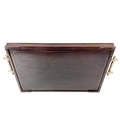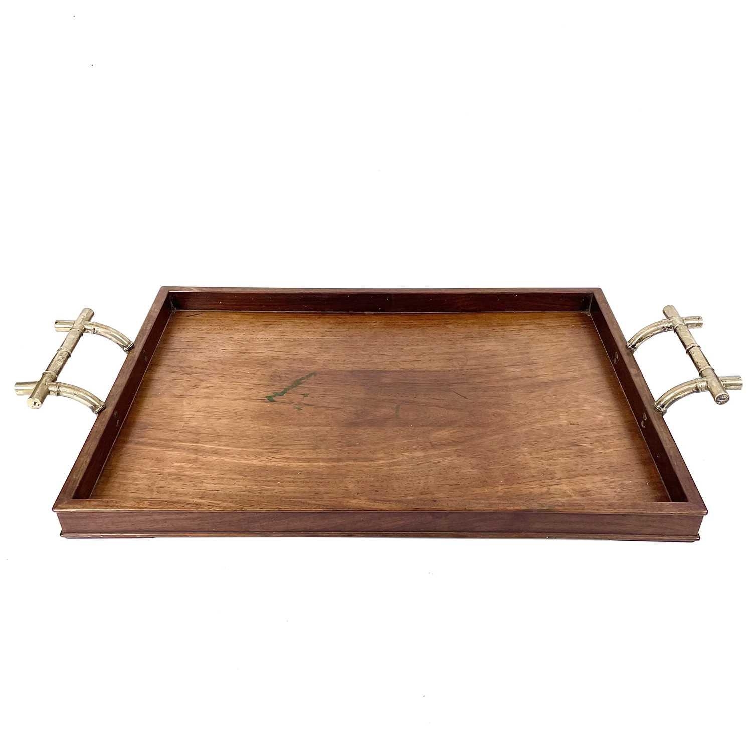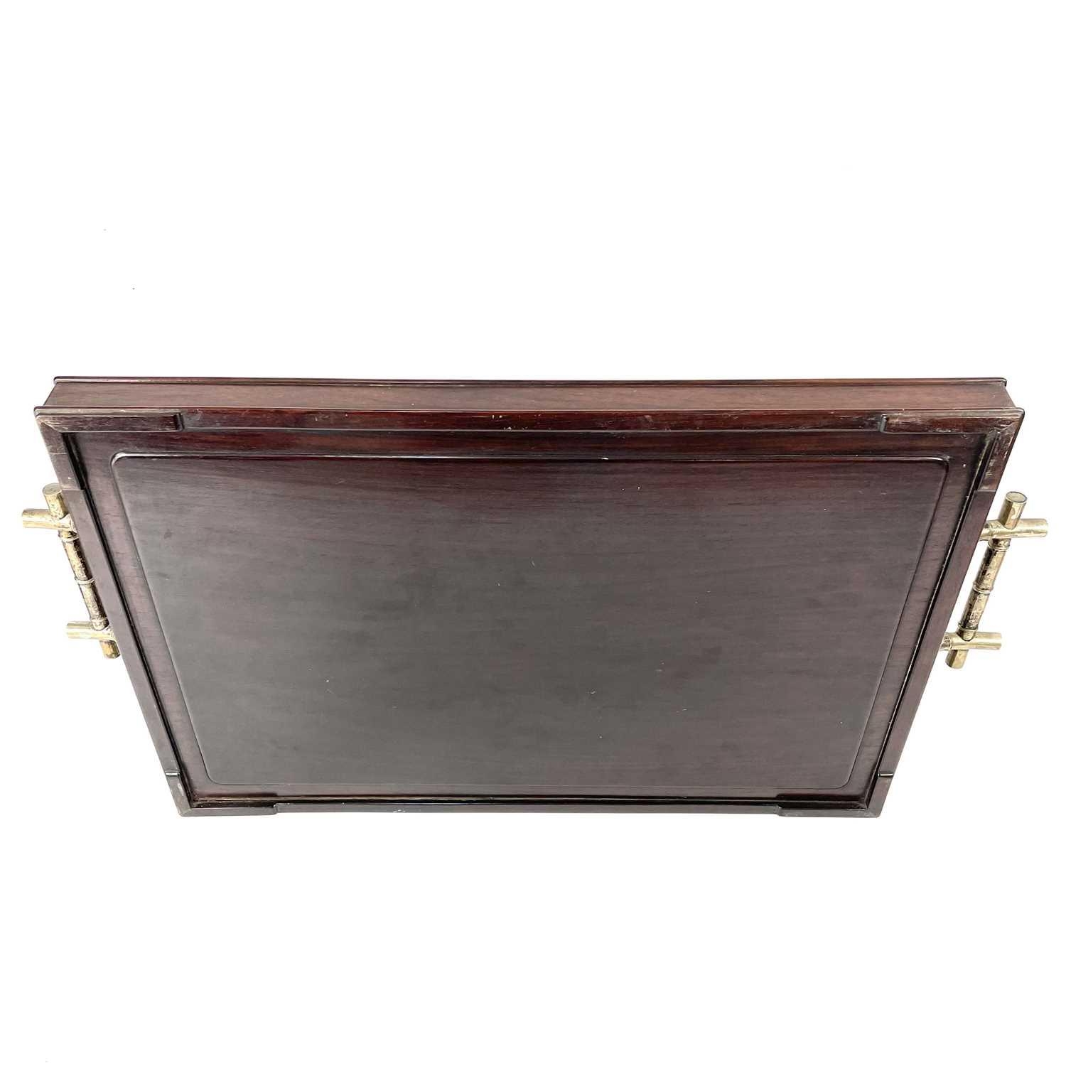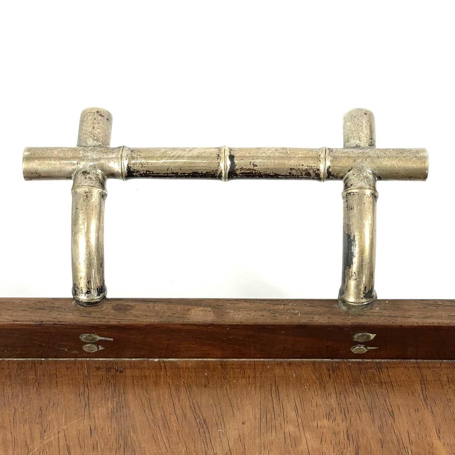 A Chinese silver and hardwood tea tray, by Tuck Chang & Co Ltd, Shanghai. the simulated bamboo silver handles stamped TC, widest point 65cm, depth 36cm, height of wood 3.5cm.