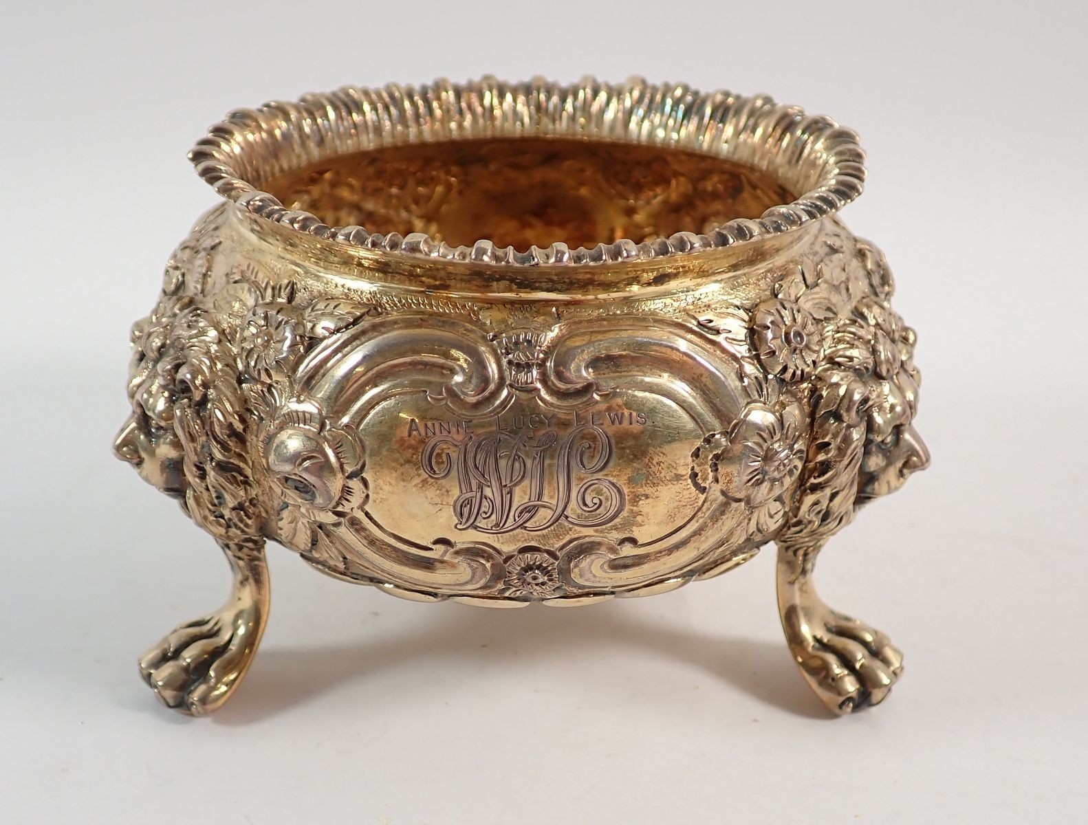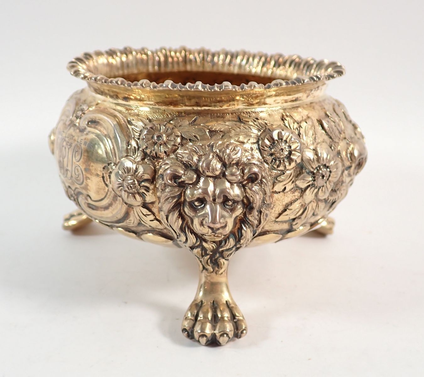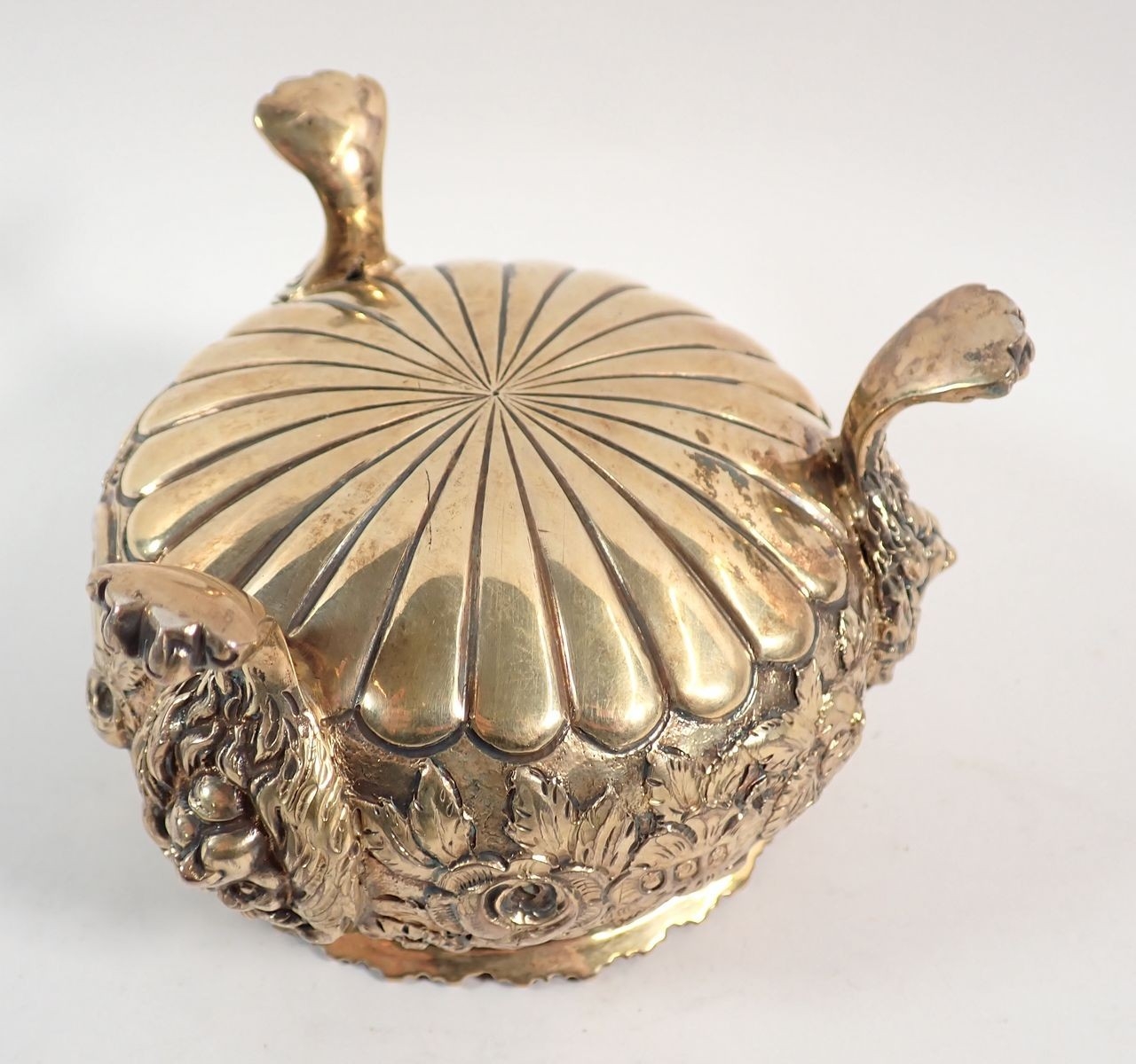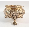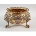 A fine quality Regency silver gilt sugar bowl with floral repousse decoration, all on triple lion paw and mask feet, makers mark G J, London 1803, 7cm tall, 334g