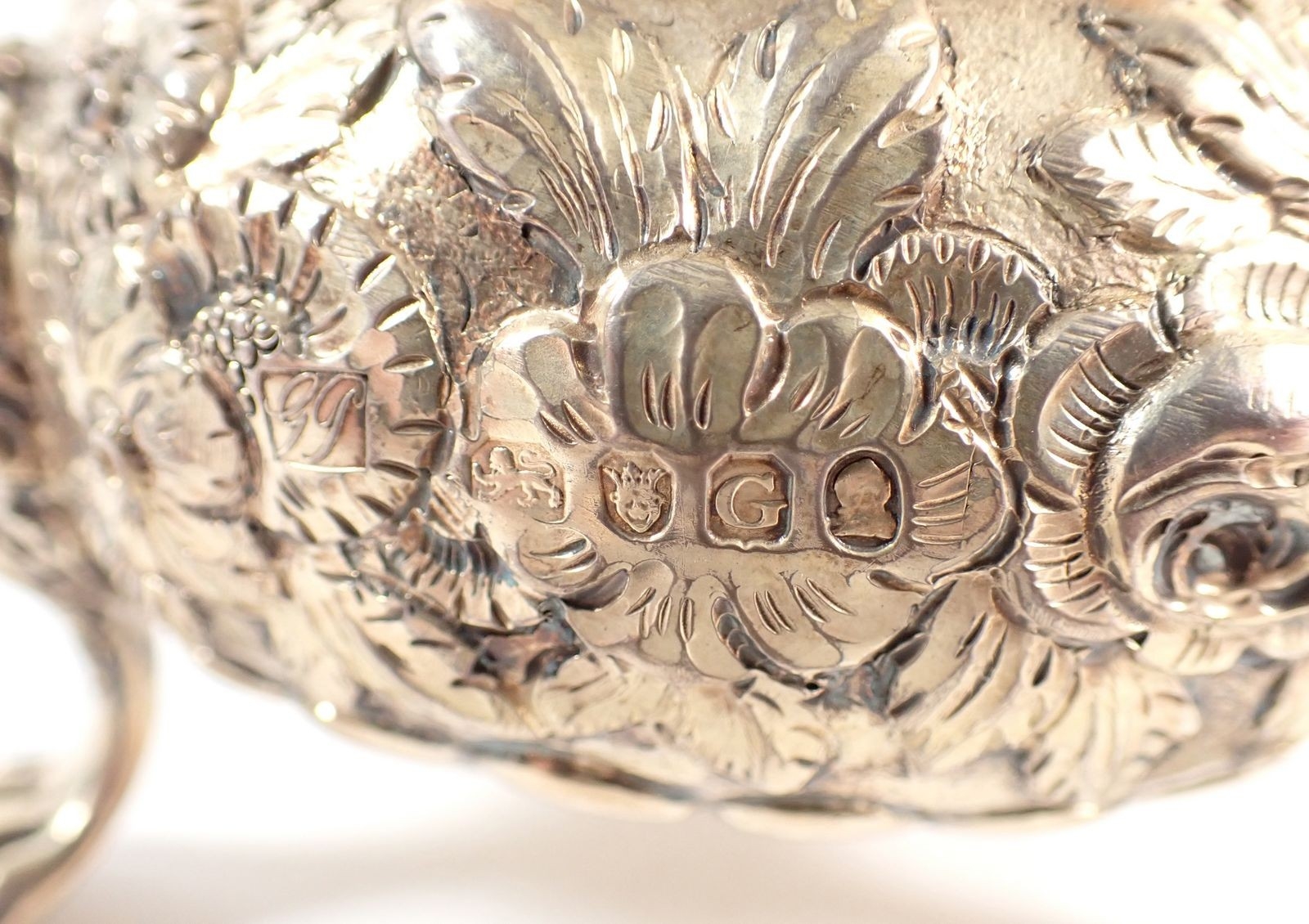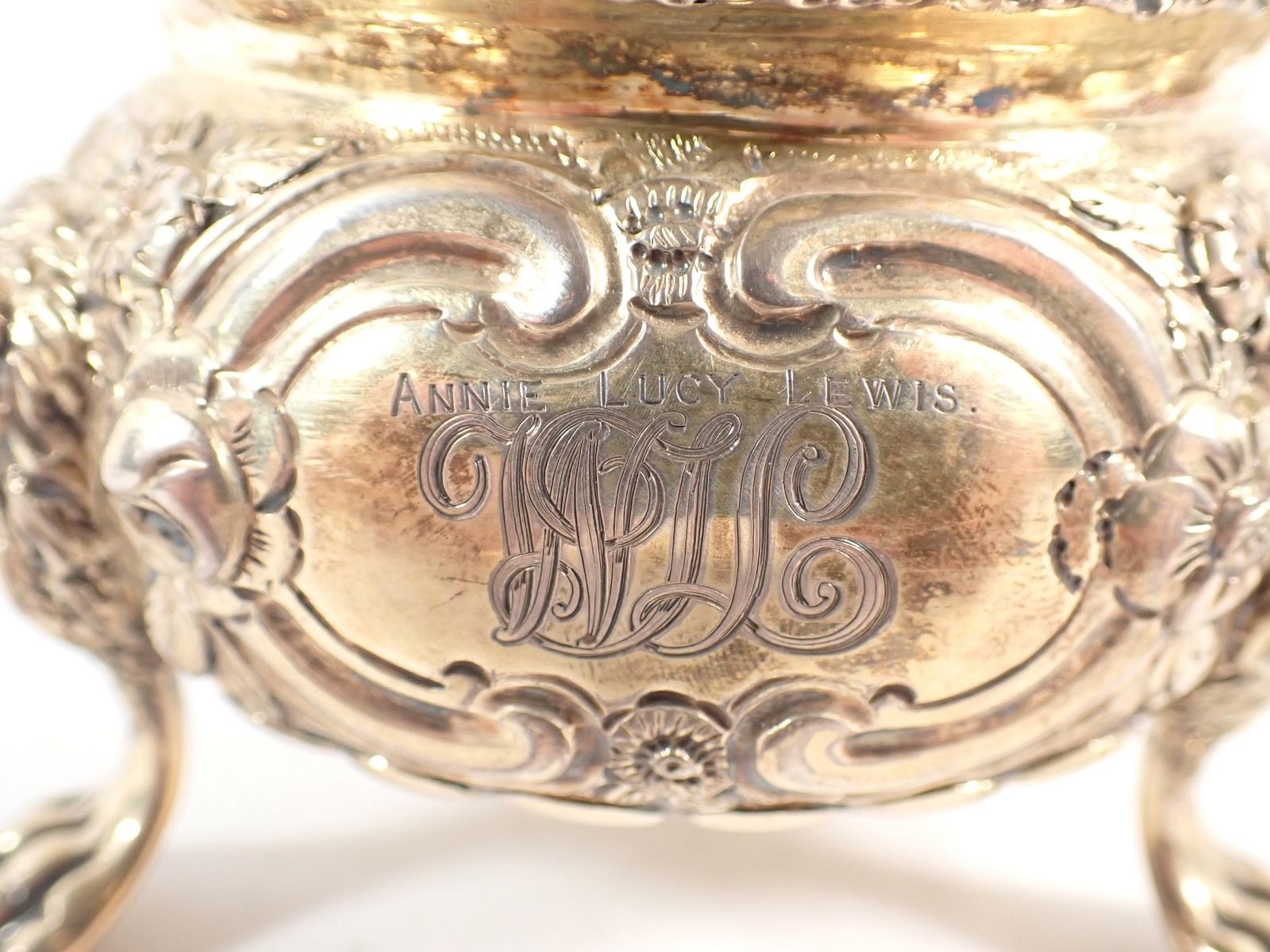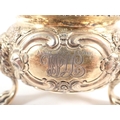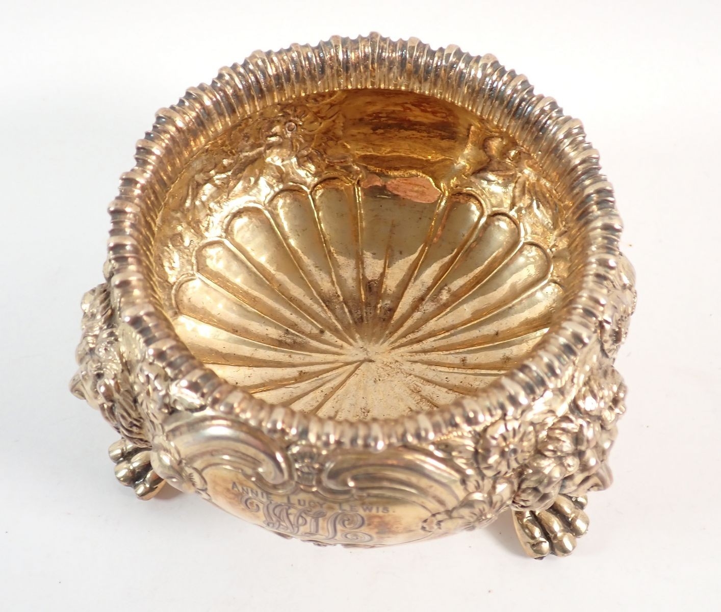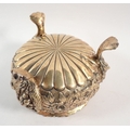 A fine quality Regency silver gilt sugar bowl with floral repousse decoration, all on triple lion paw and mask feet, makers mark G J, London 1803, 7cm tall, 334g