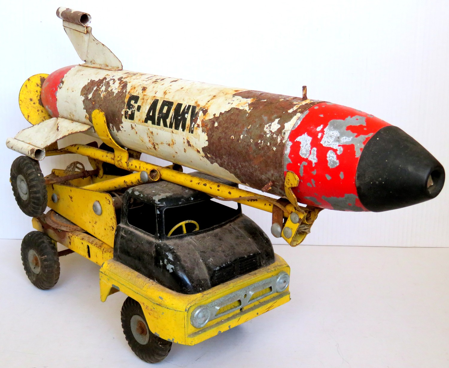 TRIANG Vintage Tinplate Thames Trader Lorry with US Army Rocket Load, major paint loss to Rocket Load, some restoration required to Lorry and Rocket. Fair