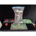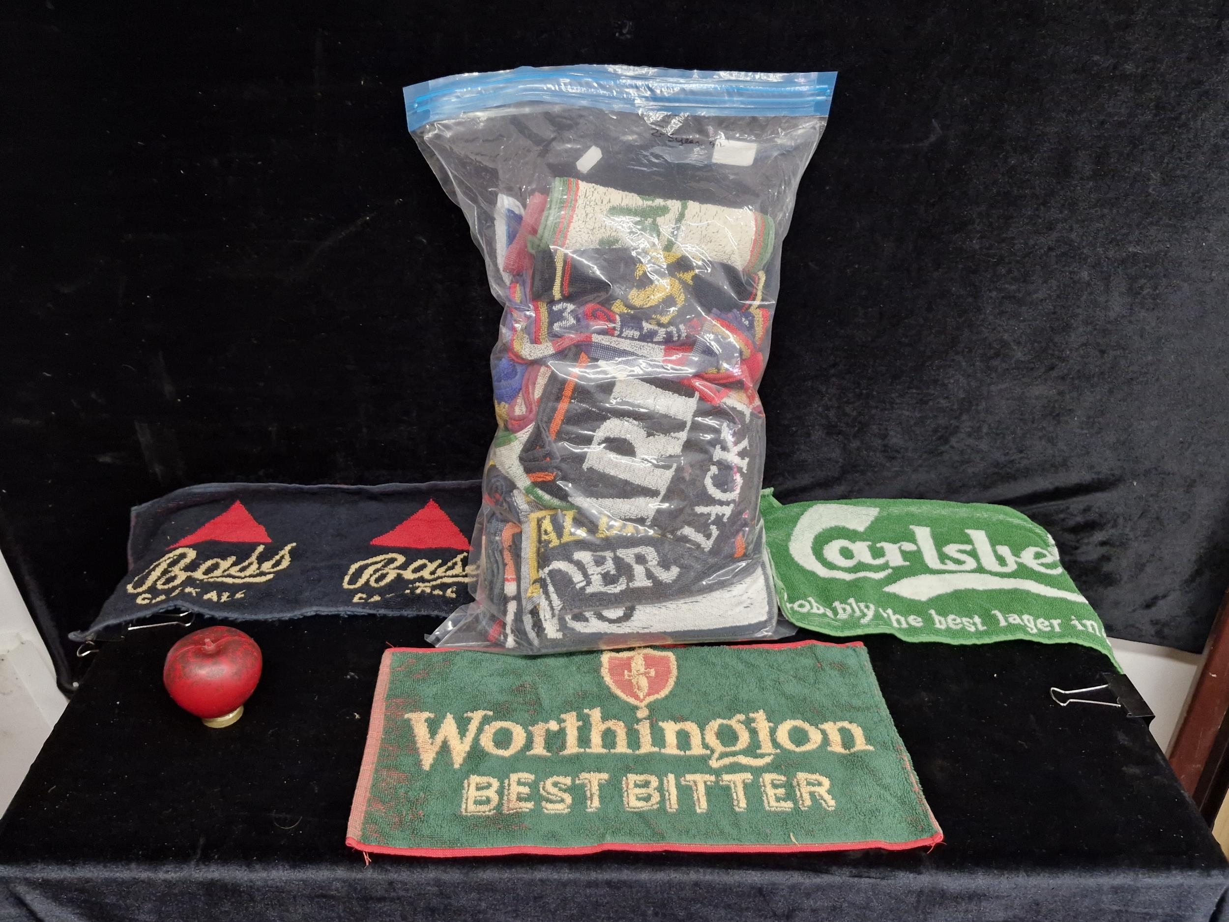 A large selection of vintage advertising bar towels, including Guinness, Bass and Carlsberg.